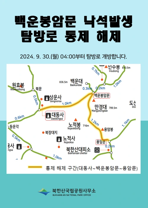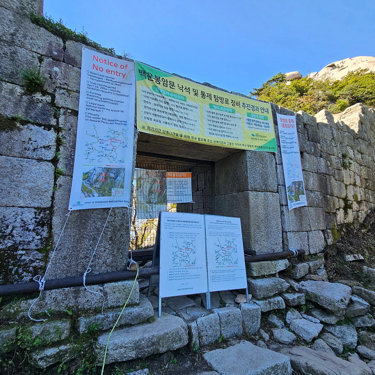 이제 백운대로 가기 위하여 좁은 골목을 지난다. 백운대와 숨은 벽사이에 있는 골목을 지나면 만경대가 우리 앞에 나타난다. 오른쪽에는 백운대다. 예전에 백운암문이 열려있을 때, 주말에는 백운대를 오르는 그 길에 사람들이 가득하였는데 오늘은 바위와 안전펜스가 자리를 잡고 있다. 주말에 이곳에서 암릉연습을 하는 사람들이 즐비하였는데 그곳에는 자일을 위한 체인만이 조용히 자리를 잡고 있다. 백운대를 올라가는 데크에 도착하니 백운대를 갔다 온 사람도 있고 백운대를 올라가기 위하여 준비하는 사람도 있다.
