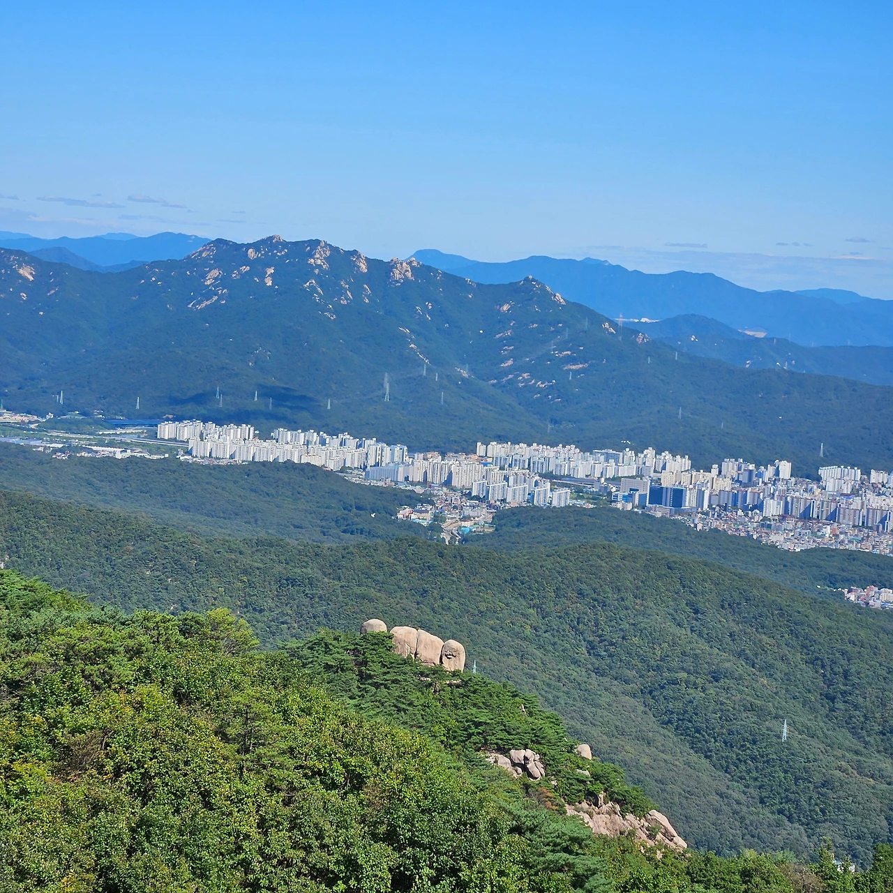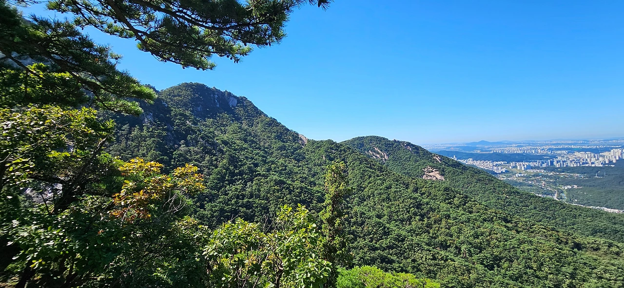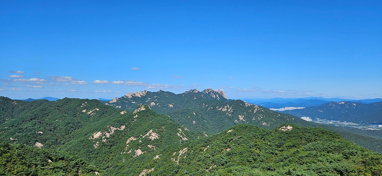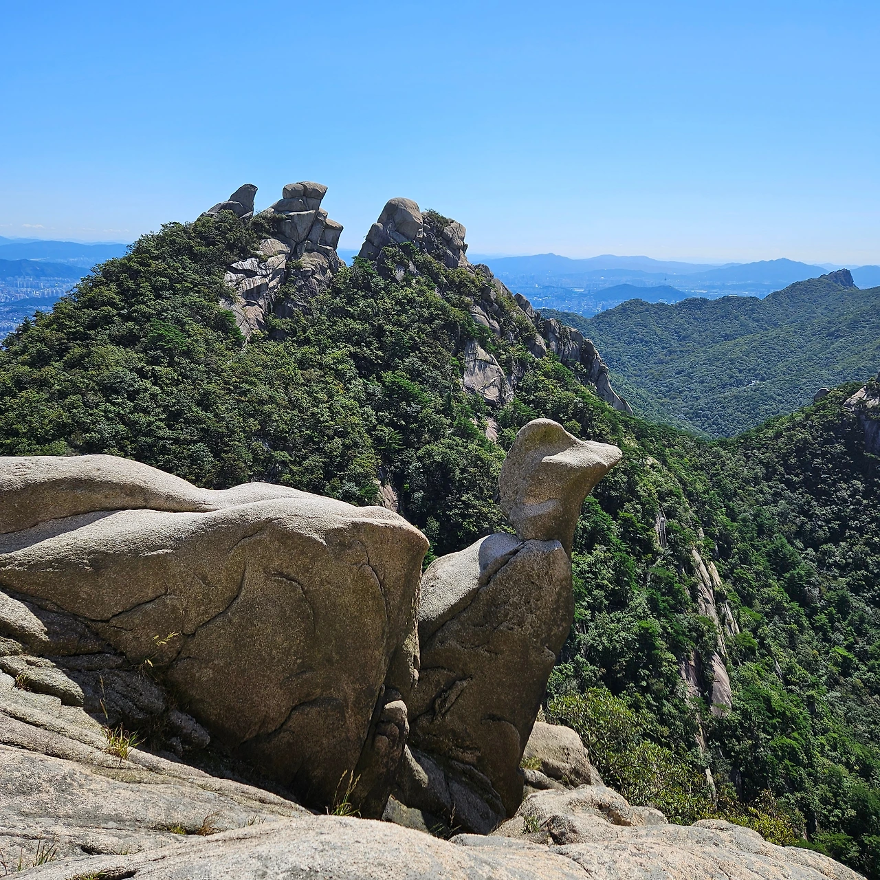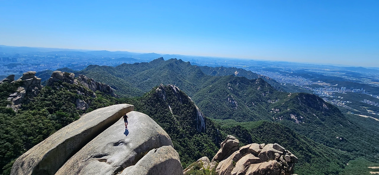 영봉에서 육모정으로 방향을 잡고 영봉능선을 산책을 한다. 암릉 위에서 멀리 도봉산 전체를 조망하고 가슴에 담는다. 그 모습이 일품이다. 도봉산 전체를 이렇게 볼 수 있는 곳이 서울에서 드물다. 외국인들에게 이곳을 안내하여 서울을 보여주는 코스를 설계하는 것도 괜찮을 것 같다. 백운대를 올라가는 것보다 힘들이지 않고 서울을 볼 수 있고 도봉산과 북한산을 조망할 수 있는 능선이다.