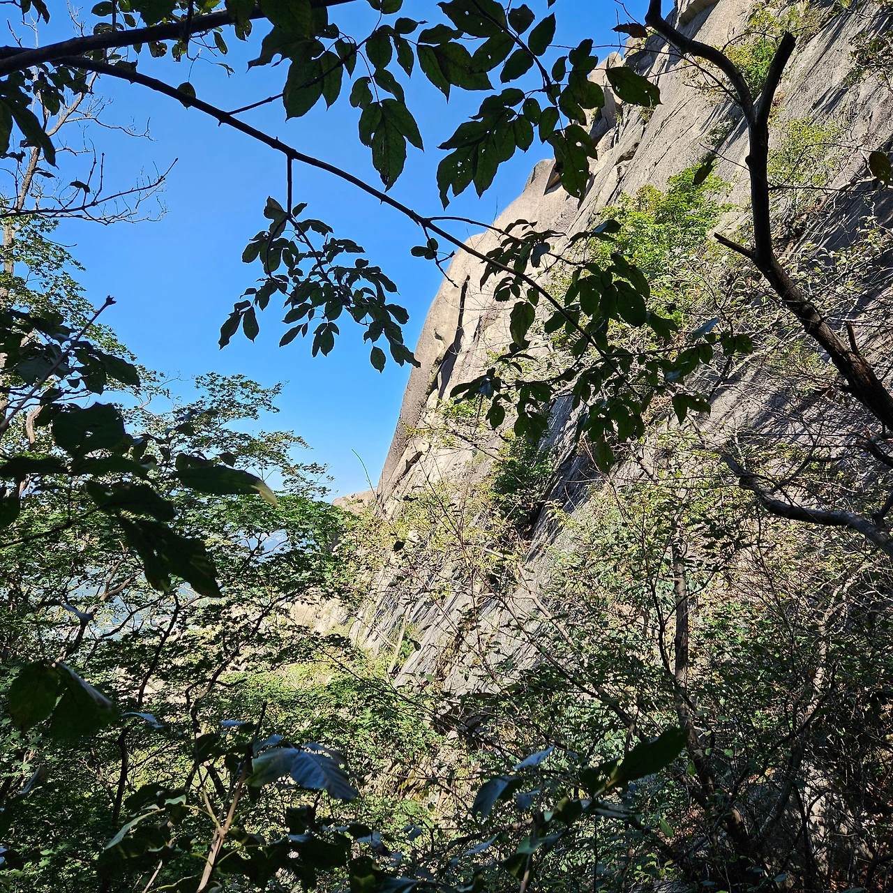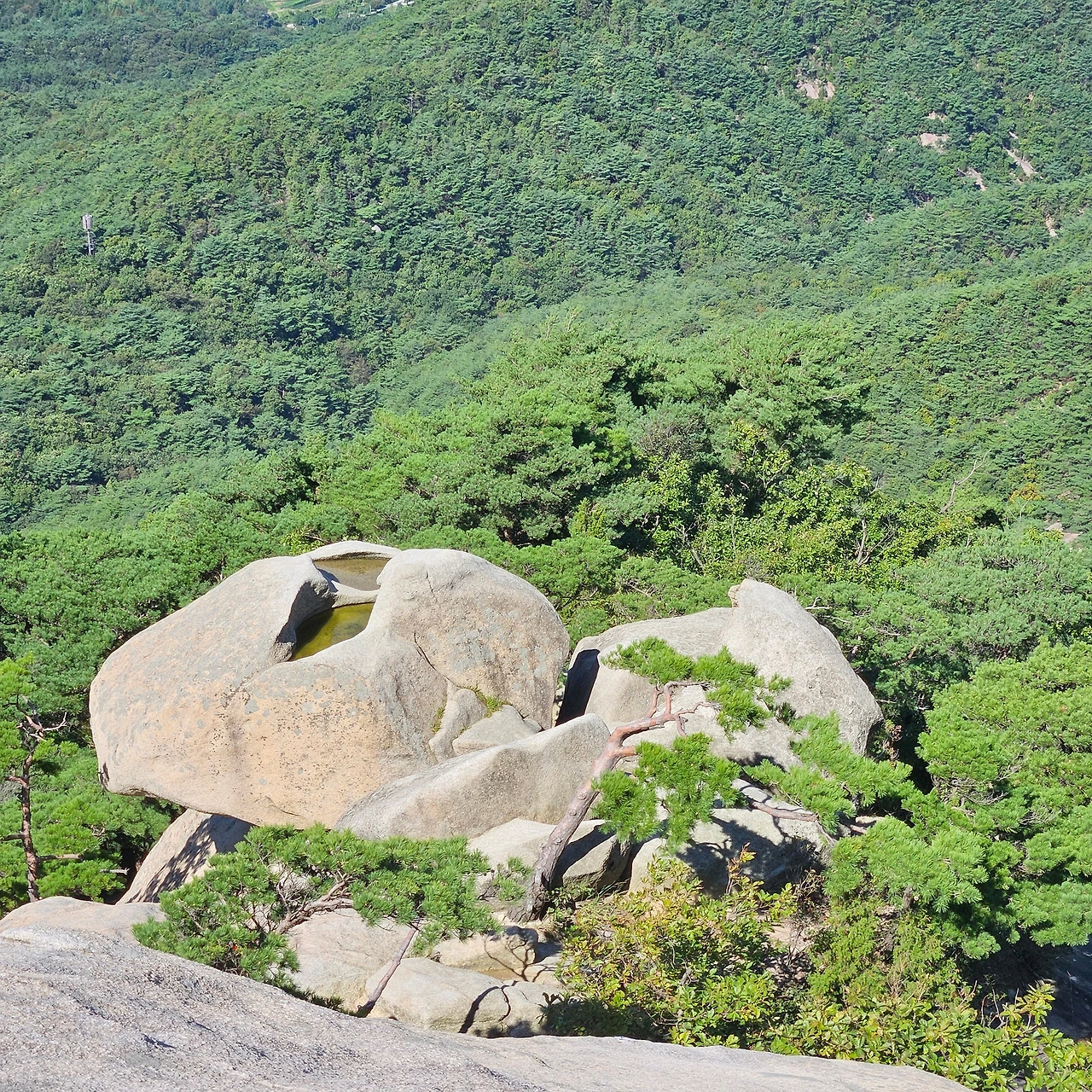 해골바위를 앞에 두고 우회를 한다. 이제 숨은 벽이 보인다. 해골바위를 거쳐서 올라오는 사람도 있지만 우리는 안전을 생각하면서 천천히 우회를 하여 오른다. 그 길을 올라서 해골바위를 내려다보니 며칠 전 내린 비가 원효스님의 목을 적시드릴 정도로 물이 그득하다. 그리고 백운대, 숨은 벽, 인수봉을 동시에 내 마음에 담고 멀리 도봉산도 담는다. 한걸음에 숨은 벽 앞까지 왔건만 그 암릉이 무서워 암릉을 피하여 걷는다. 담대하게 걷는 사람도 있지만, 그렇지 못한 사람이 더 자연스러운 것이 이곳의 풍경이라고 할 것이다.