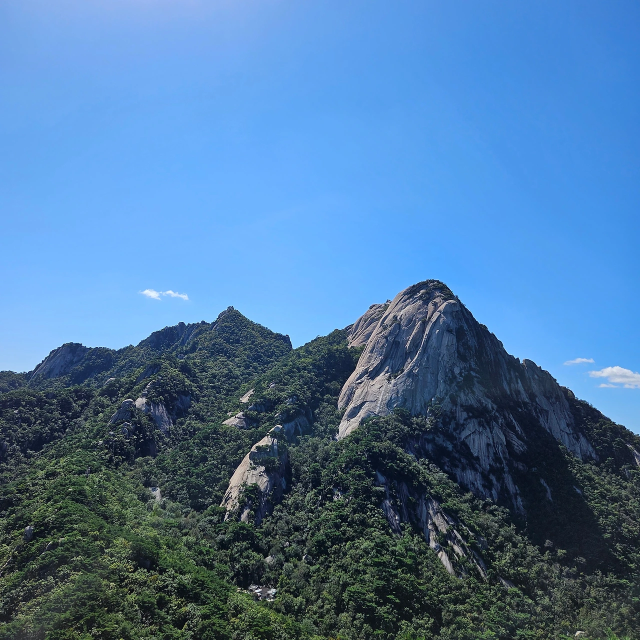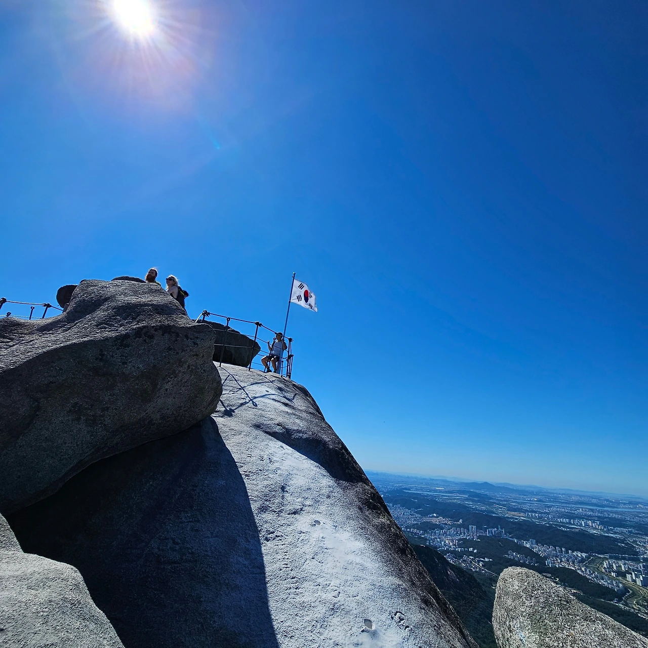 백운대에 도착하여 H가 주변 사람들에게 친절을 베풀고 있다. 유럽에서는 누구에게 부탁을 할 것인지 고민을 하는데 한국에서는 그렇지 않다는 것이 좋다. 백운대에서 3.1 운동 암각문을 보고 아래에서 작업을 하는 사람도 본다. 9월 30일에 백운암문이 열린다고 한다. 그 길을 위하여 이렇게 준비를 하는 것이다. 주말이면 인수봉에 매달려 있는 사람들이 수시로 보였는데 오늘은 없다. 백운대 너른 바위에 앉아 주변을 둘러보면서 나에게 휴식을 주고 뱃속은 채운다. 이제 하산을 한다. 예전에는 북한산성 입구로 갈 수 있었으나 오늘은 안된다. 우이동으로 가거나 밤골로 내려가야 한다. 우이동으로 방향을 잡고 하산을 한다. 북한산장이 있던 곳은 기념관으로 바뀌어 있고 인수암자를 지나고 하룻재에서 영봉을 오른다. 영봉에서 바라다본 삼각산은 새로운 모습이다. 하룻재에서 영봉까지 200m라고 되어 있는데 그것을 오르는 것은 10분 이상 소요된다. 그만큼 가파른 길이다. 그곳을 올라서 바라다본 경치는 일품이다.