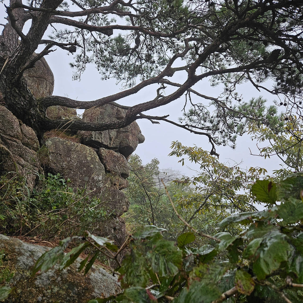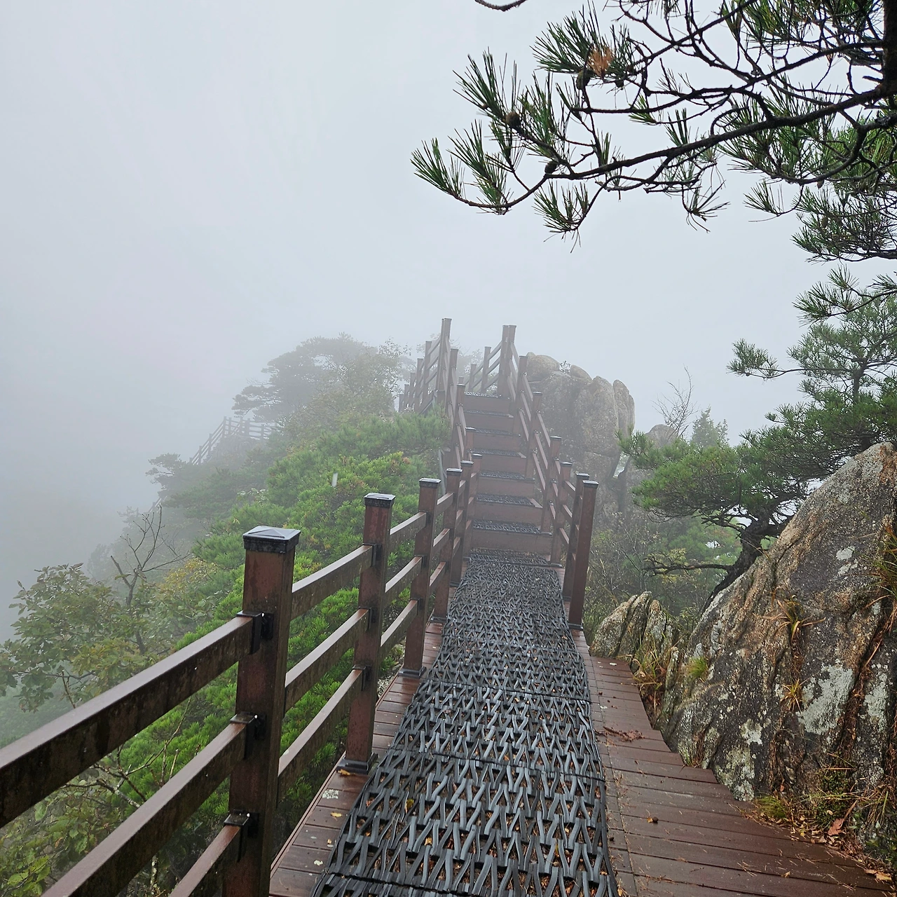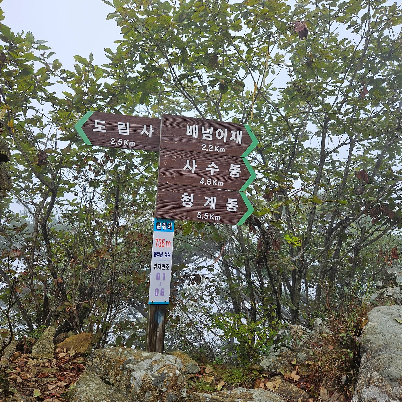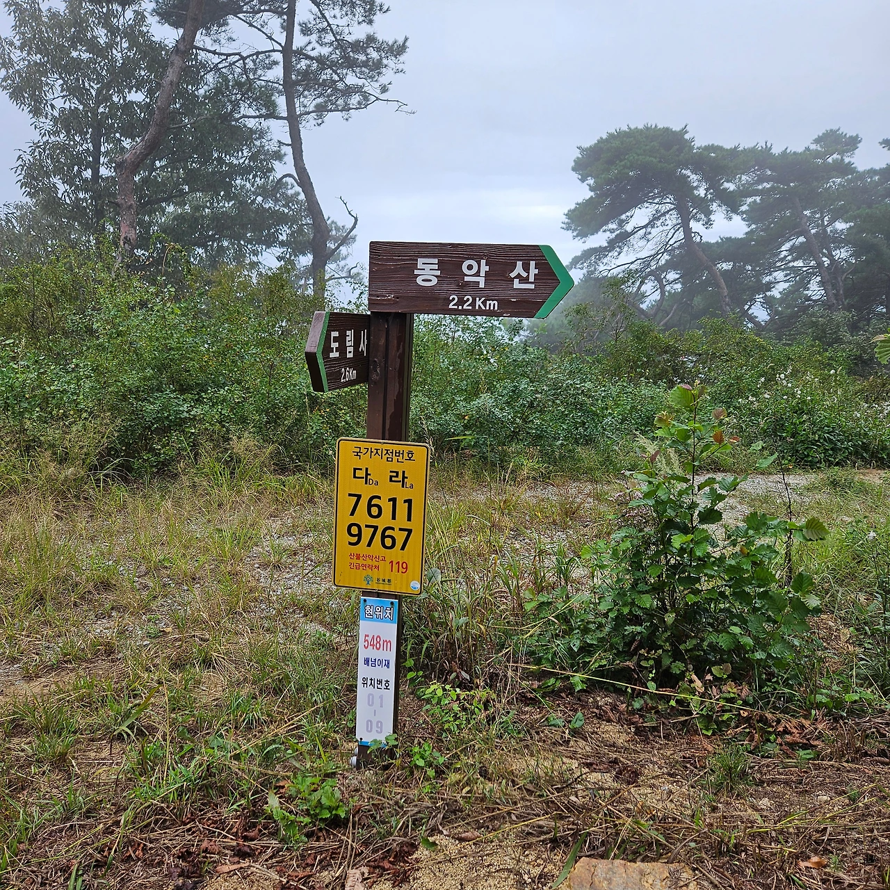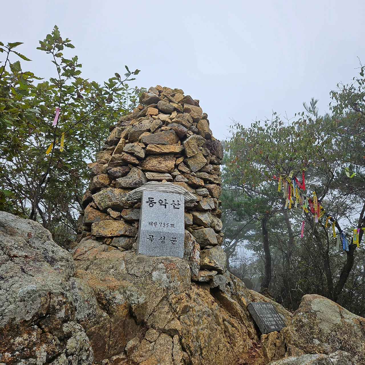 지리산을 오를 때 장터목 대피소에서 식사를 위하여 취사장에 들어갔는데 비가 왔다. 그리고 우리가 식사를 마쳤을 때 비가 그친 생각이 난다. 오늘도 그러기를 바라면서 식사를 하는 것이다. 비가 내리고 있지만, 그치기를 바라면서 하늘을 쳐다볼 뿐이다. 그렇게 많이는 오지 않는 비를 보면서 기상청 앱을 열어보니 1시간 이내에 1mm 이내로 온다고 예보가 되어 있다. 이제는 동악산 정상을 향해 걷는다. 배넘어재까지는 그렇게 줄어들지 않던 이정표의 거리는 정상을 향해 가는데 너무 빨리 줄어든다. 2.2km를 1시간도 안 걸려서 올라온 기분이다. 정상을 바로 앞에 두고 데크가 있다. 데크가 있기 전에는 험난하게 올랐을 정상을 이제는 데크로 오르는 것이다. 다만, 데크의 높이가 30cm는 되는 것 같다. 너무 높은 계단이다. 그 계단을 올라서는데 진한 곰탕 속에 들어서서 거인의 곰탕속의 살아 있는 고기가 되어서 움직이고 있다.