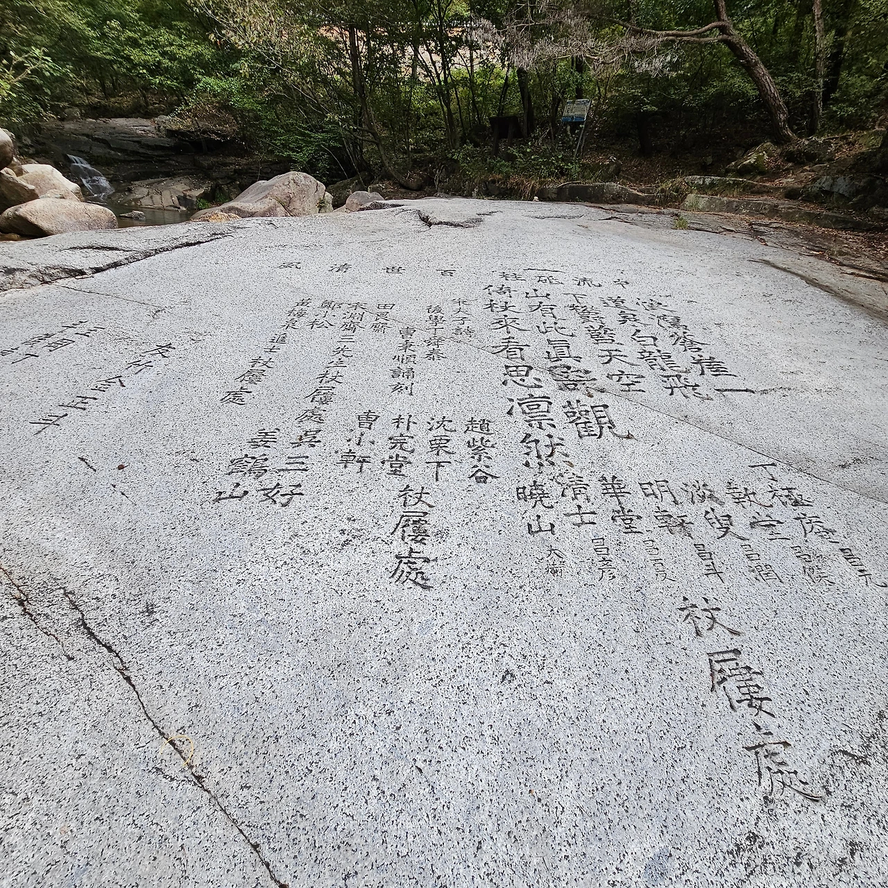 반석에 그것을 정리하여 두었고 반석마다 선비들의 풍류를 위한 시문 등을 암각하여 둔 것을 볼 수 있다. 요즈음 같으면 상상도 못 한 일을 조선시대 선비들은 하였다고 보면 될 것이다. 선비들이 붓으로 그것을 표현하여 두면 석수가 그것을 파내었을 것이다.