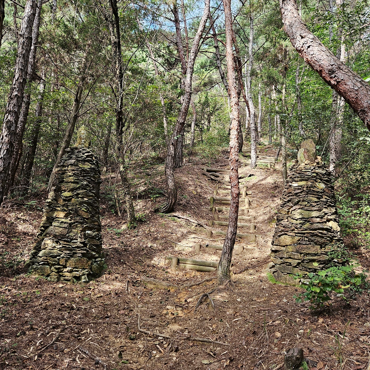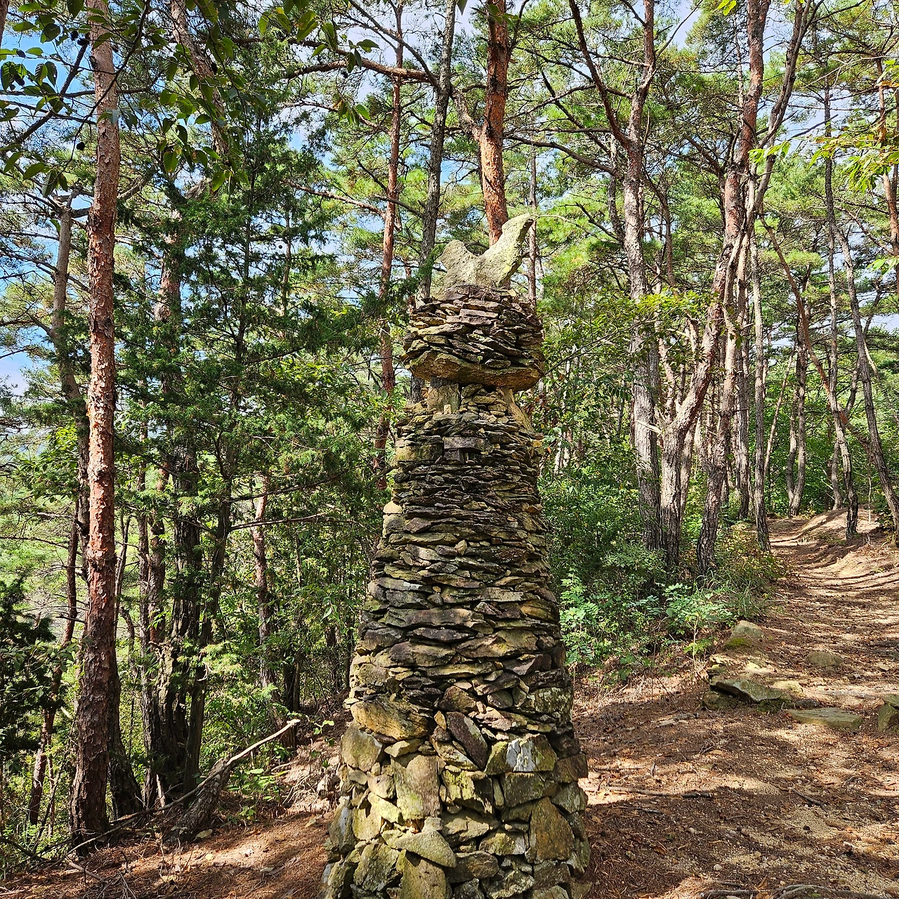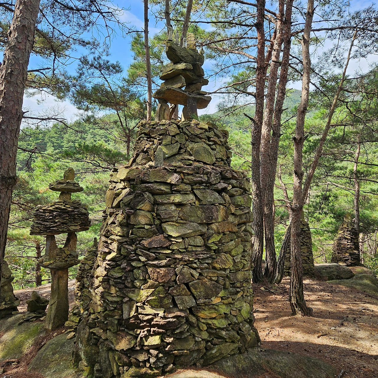 등산을 시작하는데 덥다. 비가 온다는 예보가 있는데 하늘은 아직은 그 낌새를 보여주지 않는다. 멀리 형제봉이 보이지만 등산로는 바로 오르지 않고 무덤이 있는 곳까지 옆으로 옆으로 이동을 한다. 무덤이 있는 곳에 친절하게 등산로라는 이정표가 있다. 이제 오른다. 중간중간에 돌탑이 있다. 그 돌탑 위에는 다양한 모습의 바위와 글귀로 채워져 있다. 처음에는 누가 만들었을까 궁금하였는데 사전에 공부한 사람이 이곳의 산악회가 만들었다고 설명을 한다. 돌탑군에 도착하니 친절하게 안내되어 있다. 이곳의 서편산악회라는 곳에서 30년 전이라고 할 수 있는 1997년 착공식을 한 후 만들기 시작하였다고 한다. 이곳의 명소로 만들었다고 보아야 할 것이다. 이렇게 서편 산악회라는 말이 나오고 난 다음 궁금한 것이 발생하였다. 서편제 동편제라고 하는데 서편제는 어디고 동편제는 어딜일까였다. 국가유산 등에 조애가 깊은 분이 즉시 답을 하신다. 전라도를 중심으로 판소리의 동서 편은 섬진강을 기준으로 운용, 구례, 순창 등을 동편이라 하고 광주, 나주 등지를 서편이라고 한다 하였다. 지리산을 넘어가지 않고 섬진강을 중심으로 구분하였다는 것에 의의가 있다고 할 것이다. 동편서편은 그래도 우리의 방향과 일치하지만 좌우는 뒤바뀌어 있다는 사실은 지배자의 생각이 그대로 있다는 것을 느낄 수 있었다.