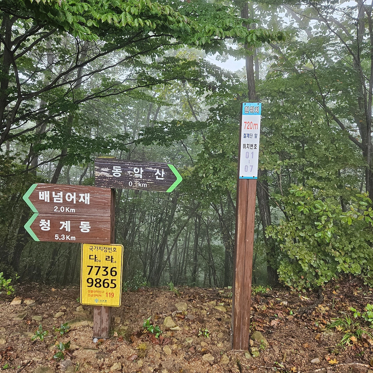 비가 오기 시작한다. 비가 올 때 식사를 하는 것은 어려움이 있지만 그곳에 정자가 있다. 한차례 비가 지나가기를 바라면서 그곳에서 휴식과 식사를 한다. 이곳까지 걸어서 오면서 동악산 정상이 멀었는데 갑자기 가까워진 기분이다. 그분들은 돌아서서 내려간다. 앞서거니 뒷서기니 하면서 배넘어재에 도착하였다. 그분들은 도림사로 하산을 하고 우리는 이제 동악산 정상으로 발을 옮길 것이다.