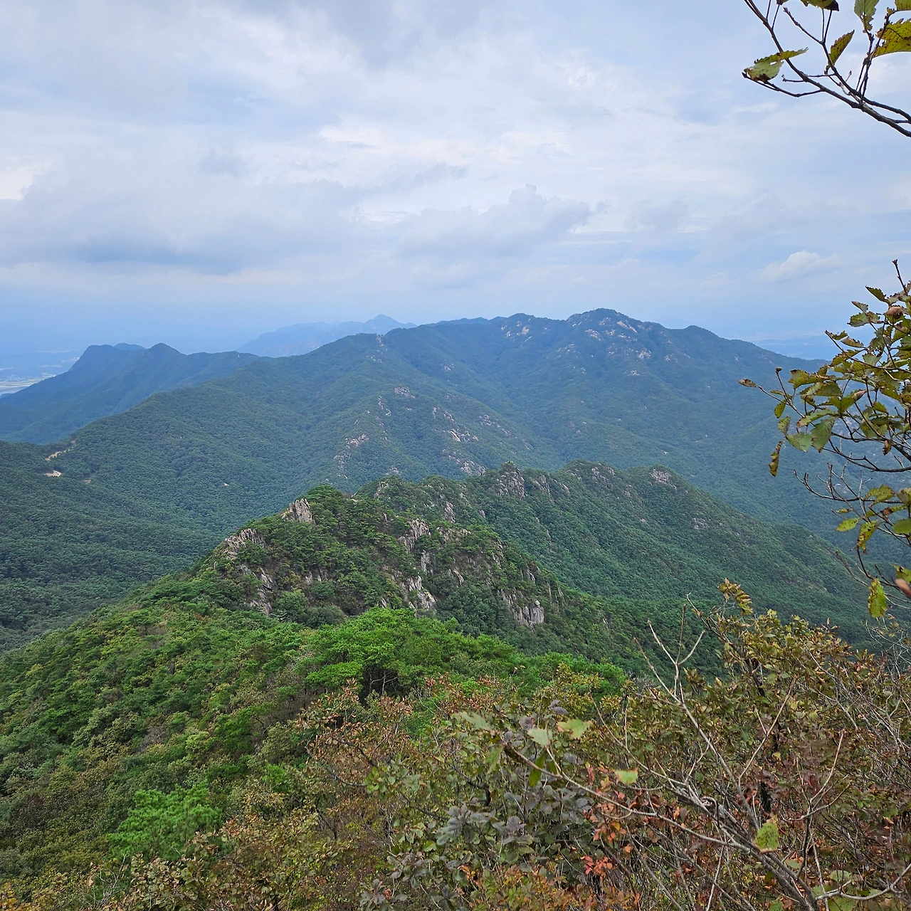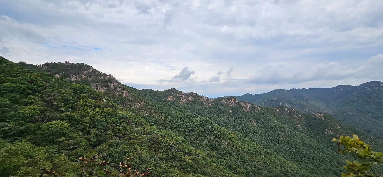 이제 봉우리가 가까이 있으면서 오르는 것 자체가 부담스러운 가파름이 보인다. 하지만, 주저할 수 없는 것이다. 산을 오르고 첫 번째 봉우리를 지나면 새로운 봉우리가 또 앞에 있다. 지인이 꼭 화산지역의 기생화산 또는 오름 같다고 한다. 높은 봉우리에 있는 화산을 중심으로 그 아래에 화산이 있는 것처럼 한번 치고 올라가면 또 올라가야 하는 봉우리가 있다. 이것이 형제봉까지의 모습이라고 할 것이다. 네이버 지도와 이정표가 다르다. 네이버 지도에는 형제봉이 아직인데 이정표는 500m도 남아 있지 않다. 다시 확인해 보니 네이버지도의 형제봉은 이곳의 이정표에서 대장봉이었다. 형제봉은 성찰봉과 동일한 개념으로 사용되고 있었다. 동봉쉼터를 지나고 형제봉으로 이동한다. 오르면서 오른쪽을 보니 공룡능선이라고 한다. 암릉길이 아름답다. 하지만, 오늘은 비예보가 있어서 마음에만 담으면 허전한 것도 있어서 그것을 다시 눈으로 담고 사진으로 담는다.