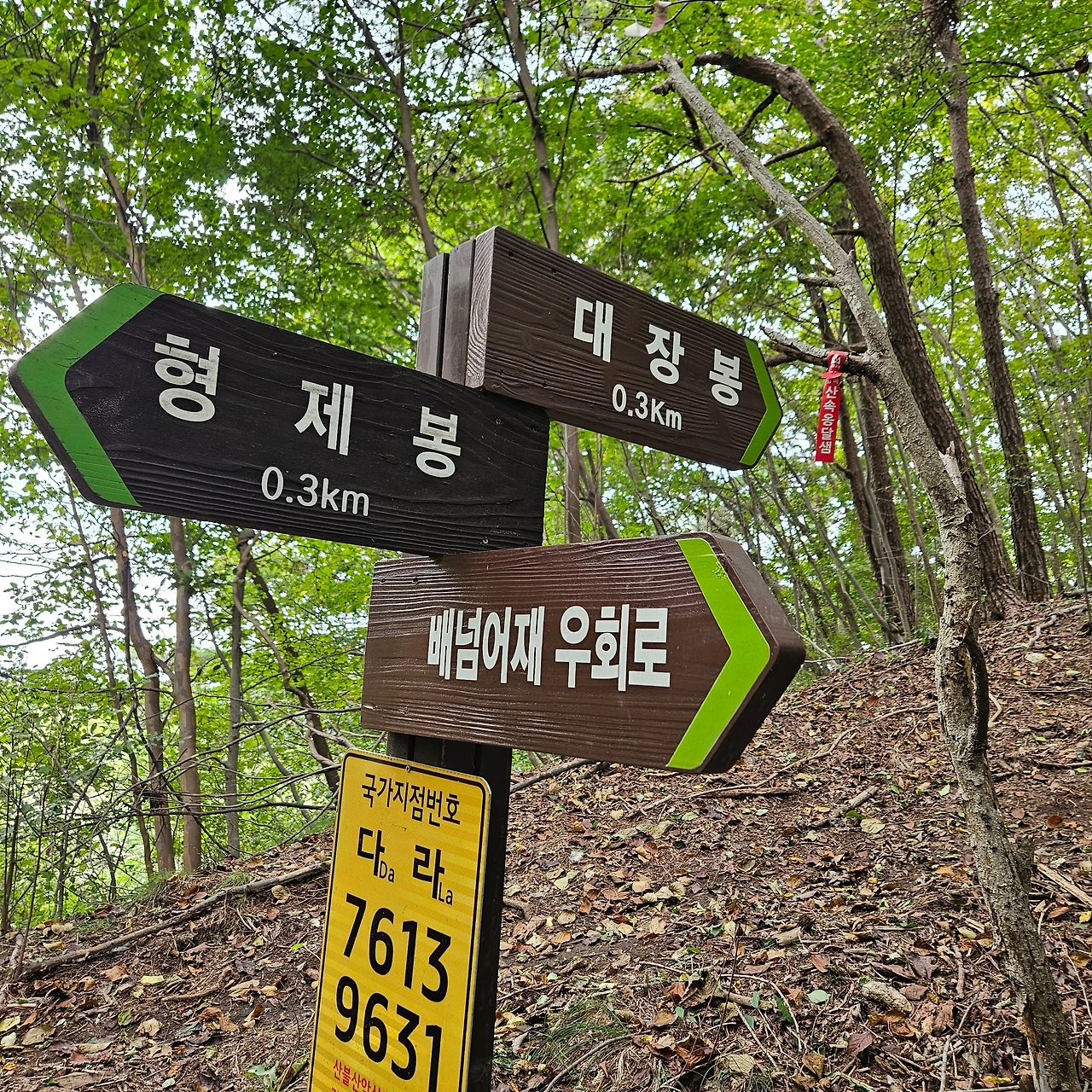 형제봉이라는 곳에 도착하였다. 정상석은 없다. 그곳이 성출봉(동봉)이라는 이정표가 있었다. 아울러, 산악인 허영호선생이 이곳에서 등반을 하였다는 기념석이 있다. 차리리 이곳에 정상석이나 만들었으면 하는 아쉬움이 있다. 이곳에서 공룡능선으로 들어가던가 능선길을 따라 종주계속하던가 할 수 있다. 우리는 능선길을 따라 종주를 계속하기로 하였다. 바로 앞에 둔 봉우리가 우리를 기다리는 것 같다. 하지만, 능선을 내려가면서 앞의 봉우리가 점점 높아진다. 종주를 하는 사람들이 그렇게 부담스러운 시간이 된 것이다. 저것을 넘는 시간이 무섭다. 그리고, 일기예보를 보니 비가 오는 시간이 가까워 오고 있다고 알려지고 있다. 그래서 우회로와 정상으로 가는 길이 있는데 고민을 한다. 모두들 고민하는 것은 고민 속에 있을 때 갈림길에 있을 때이다. 우리도 그렇다는 것이다. 이곳에서 우리는 우회로를 선택하였다. 배넘어재로 가는 길을 선택한 것이다. 성출봉은 동봉이고 대장봉은 서봉이다. 그래서 형제봉이라는 의미라고 하였다.