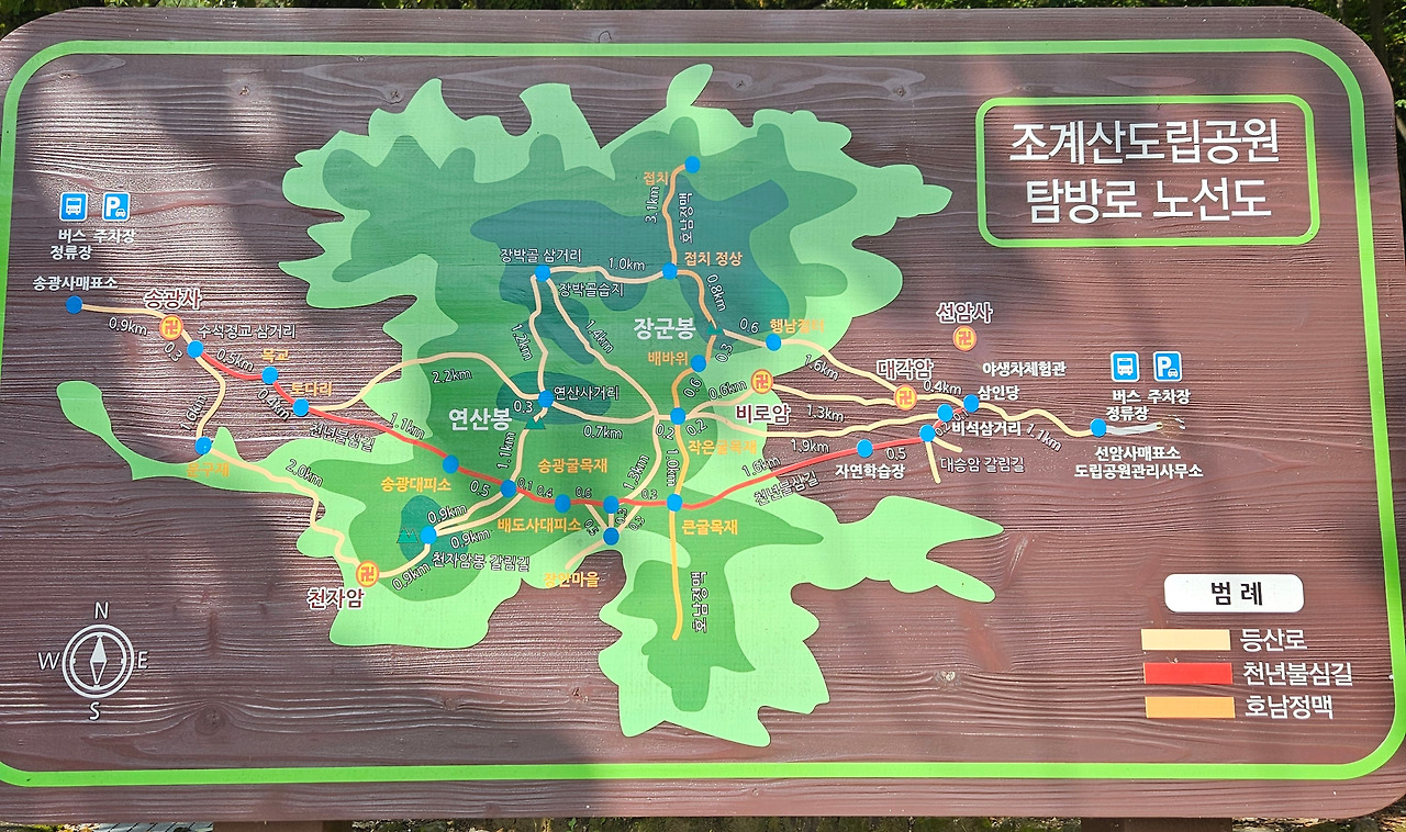 매표소는 이제 그 목적을 달성하여 닫혀있다. 다만, 무료입장이라는 안내판을 붙이고 있다. 시내버스가 주차하는 곳에 도착하였다. 우리 버스도 그곳에 기다리고 있다. 서울로 올라와야 하는 버스기사 아저씨의 휴식타임을 저해하여서는 안되기에 버스정류장이 있는 휴게 공간에 앉아 쉬고 있으면서 순천에서 온 산객과 두런두런 얘기를 나눈다. 버스를 놓쳤다고 한다. 휴일 더 많은 승객이 있는 곳임에도 이곳은 전체를 감차하여서 운행하고 있다고 한다. 평일 송광사에 오는 승객보다 주말 승객이 많음에도 그렇게 손익분기점을 넘기지 못하니 그렇지 않을까 이야기해 본다. 조계산에서 가장 좋은 구간은 천자암구간이라고 한다. 그곳은 암릉도 있고 경관도 볼 수 있다고 한다.
