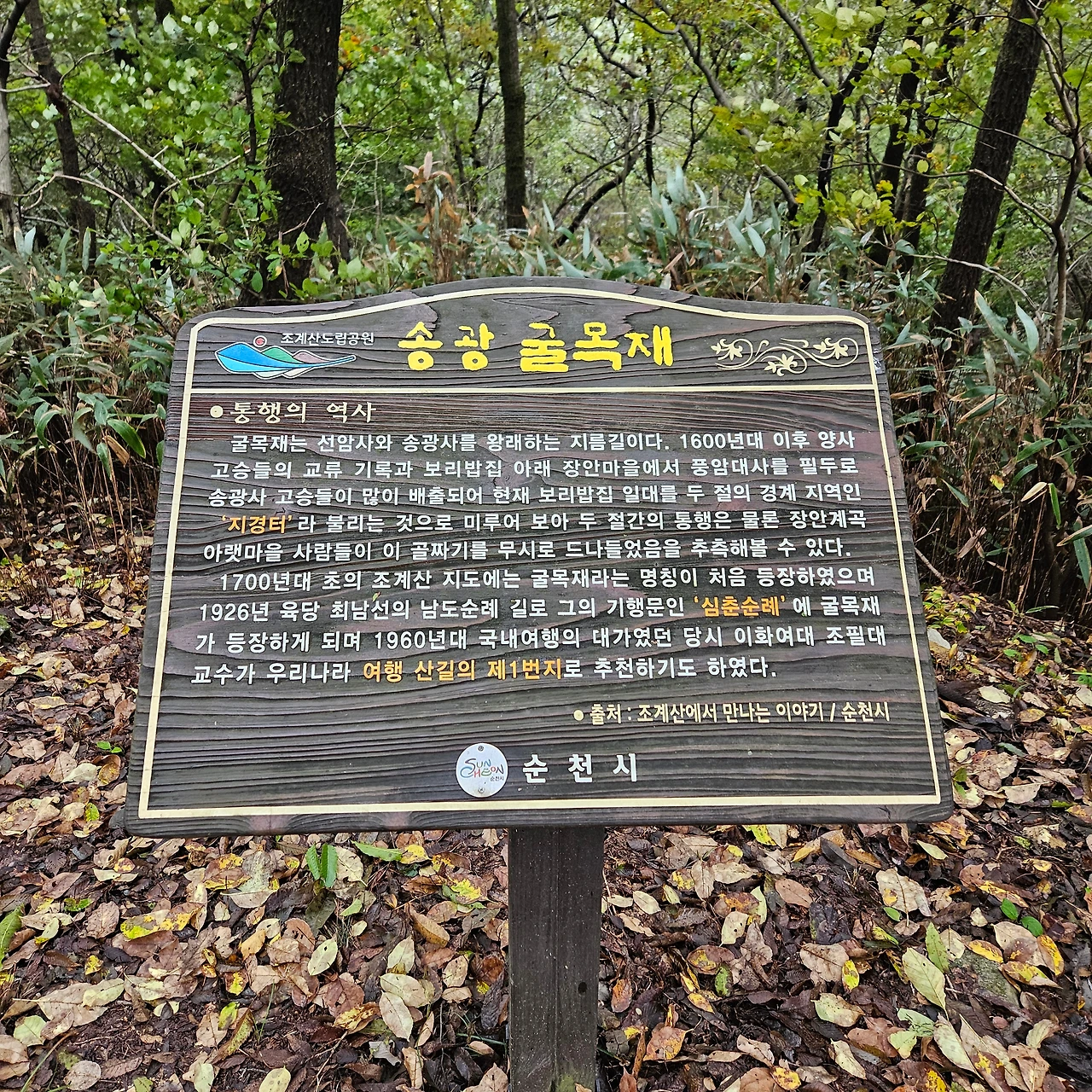 굴목재에 도착하였다. 그리고 이제는 송광사로 내려간다. 송광사로 내려가는 길의 단풍이 서서히 물들기 시작한다. 해발 720m에서 200m까지 내려가야 한다. 처음에는 가파르게 어느 정도 내려선 후에는 편안하게 하산을 한다. 스님들의 수행길이었을 것이다. 그리고 한번 선암사에서 송광사로 이동하면 몇 날며칠을 보내고 돌아갈 것이다. 힘들게 이동한 경로라고 할 것이다. 중간중간에 무엇이 있다고 하지만 아무것도 볼 수는 없었다. 송광사에 도착하기 전 개울에서 세족하고 이제는 송광사에 들러서 사찰을 둘러보고 하산을 한다.