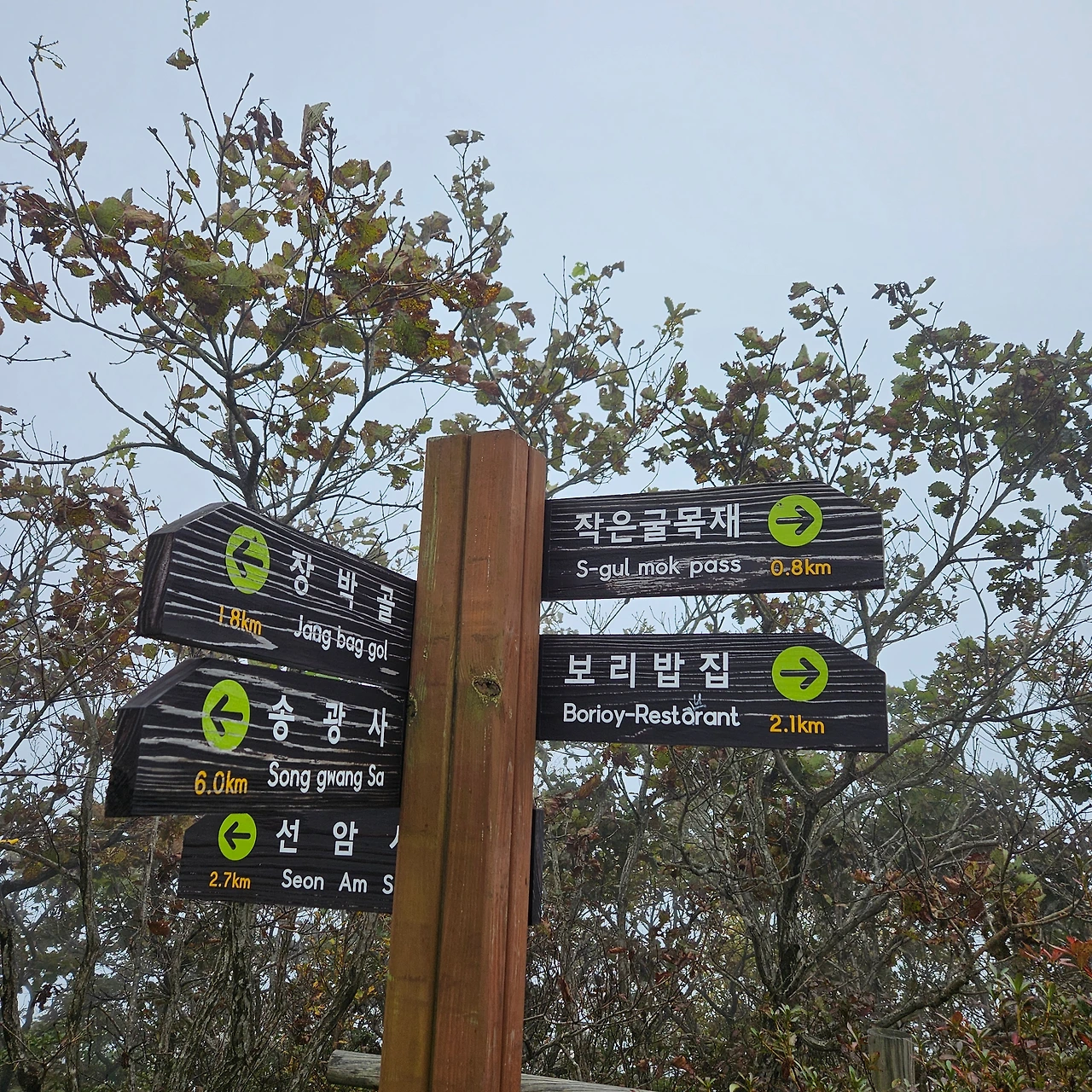 정상에 도착하였는데 주변은 곰탕 속에 들어가 버리고 정상석이 자리 잡고 있다. 정상은 888m이다. 이곳에서 이정표를 보면 재미있다. 작은 굴목재, 송광사, 보리밥집 장박골 등이다. 우리가 가야 할 길은 작은 굴목재이기에 이정표 방향으로 하산을 한다. 송광사는 6km이지만 작은 굴목재로 방향을 잡고 하산을 한다. 오를 때는 그렇게 사람들이 많지 않았는데 작은 굴목재에서 오른 사람들이 많아서 정상은 붐빈다.