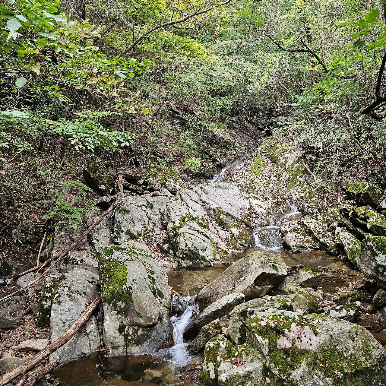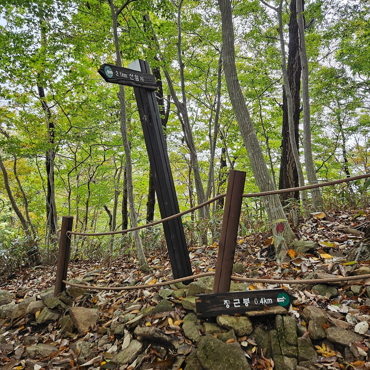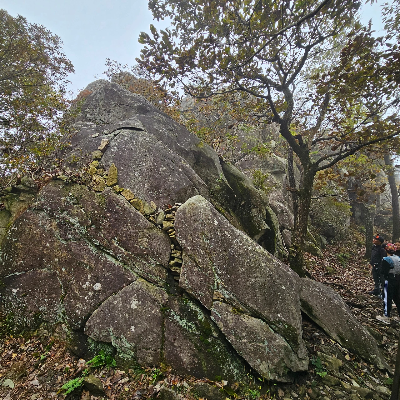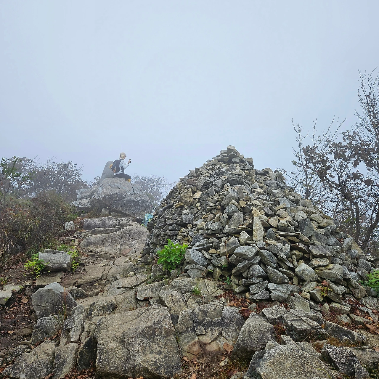 암자를 지나 이제 장군봉으로 올라간다. 올라가면서 경관은 없다. 암릉이 없기 때무이라고 보면 될 것이다. 여름산으로 제격이다. 혹! 누군가가 가을 단풍시즌을 생각할 수도 있지만, 아무것도 보이지 않고 단지 우거지 숲을 지나 올라가는 것이다. 너덜지대를 암자터에 도착하면 이제 정상이 400m를 남겨두었다. 향로암 터 옆에 조그마한 샘이 자리 잡고 물이 흐르고 있다. 샘이라는 표시도 없이 그냥 흘러내리는 물을 보면서 이곳이 진짜로 암자 터라는 것을 확신하였다. 사찰이 있는 곳은 무조건 샘이 있어야 하기 때문이다. 이곳에서 정상까지 400m 남았다고 하지만 그것보다 더 되는 기분이다. 이제 정상이 가까웠다는 기분이 더 멀게 느껴진다고 보면 될 것이다. 날씨가 바뀌고 있다. 지금까지 잘 보이던 모든 것이 사라지고 진한곰탕이 되어 버렸다. 그리고 바람이 분다.