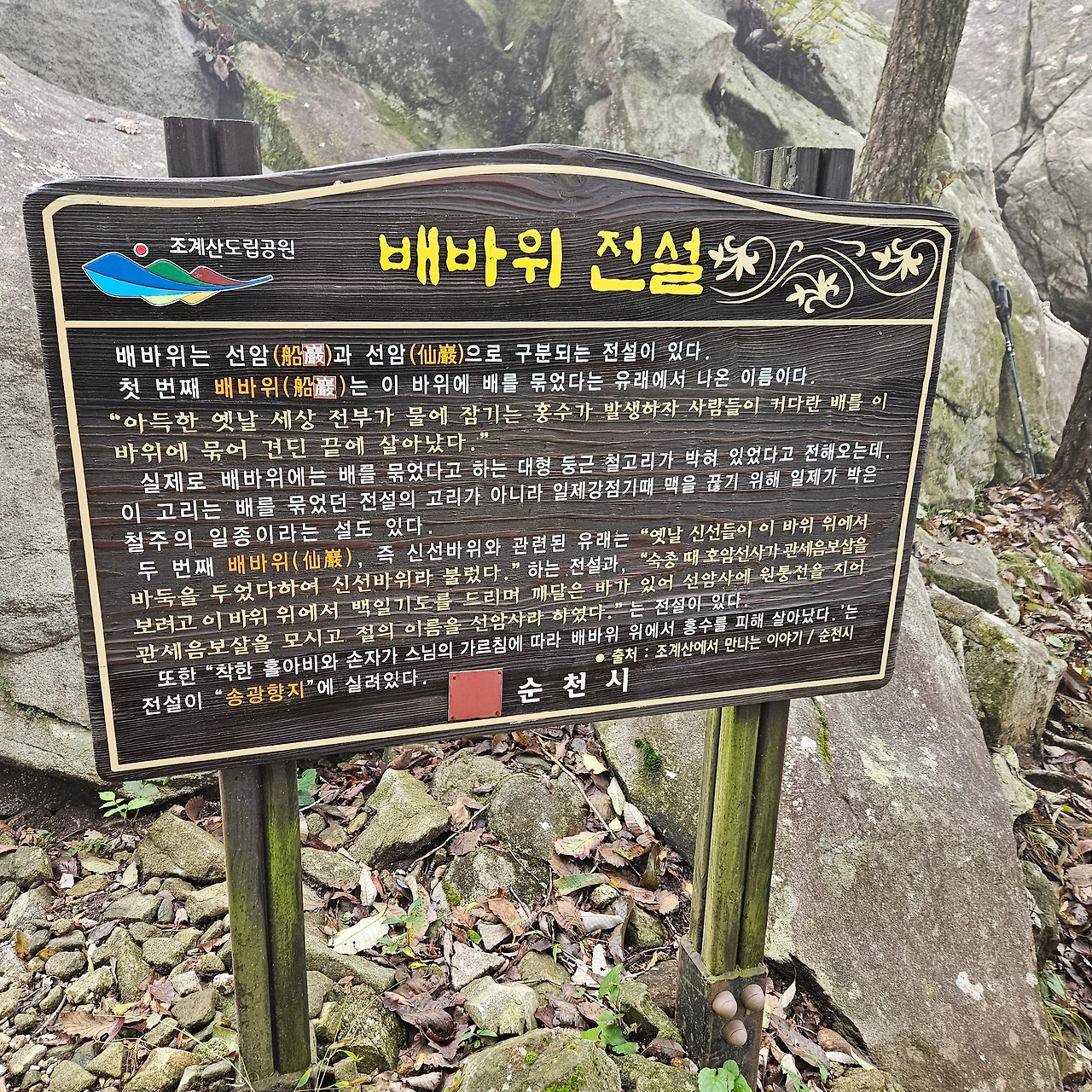이곳도 배바위 전설이 있다. 배바위라는 것이 배모양의 바위가 아니라 대홍수시절 배를 바위에 묶어 두어서 배바위라고 하는 것이다. 남부지방에는 이러한 전설이 연결된다. 곡성의 동악산에서 배너머재가 있고 고창 선운산에는 배맨바위가 있으며, 창녕의 화왕산에도 배바위가 있다. 이상하게 대홍수가 있었다는 사실은 같다. 재미있는 사실이다. 이 전설을 모두 연결해 보면 재미있을 것 같다. 창녕, 곡성, 고창, 순천 모두 남부지방이다. 홍수가 있었다는 사실에 기초하여 연결하면 예전의 간빙기의 역사가 담길 것 같다.