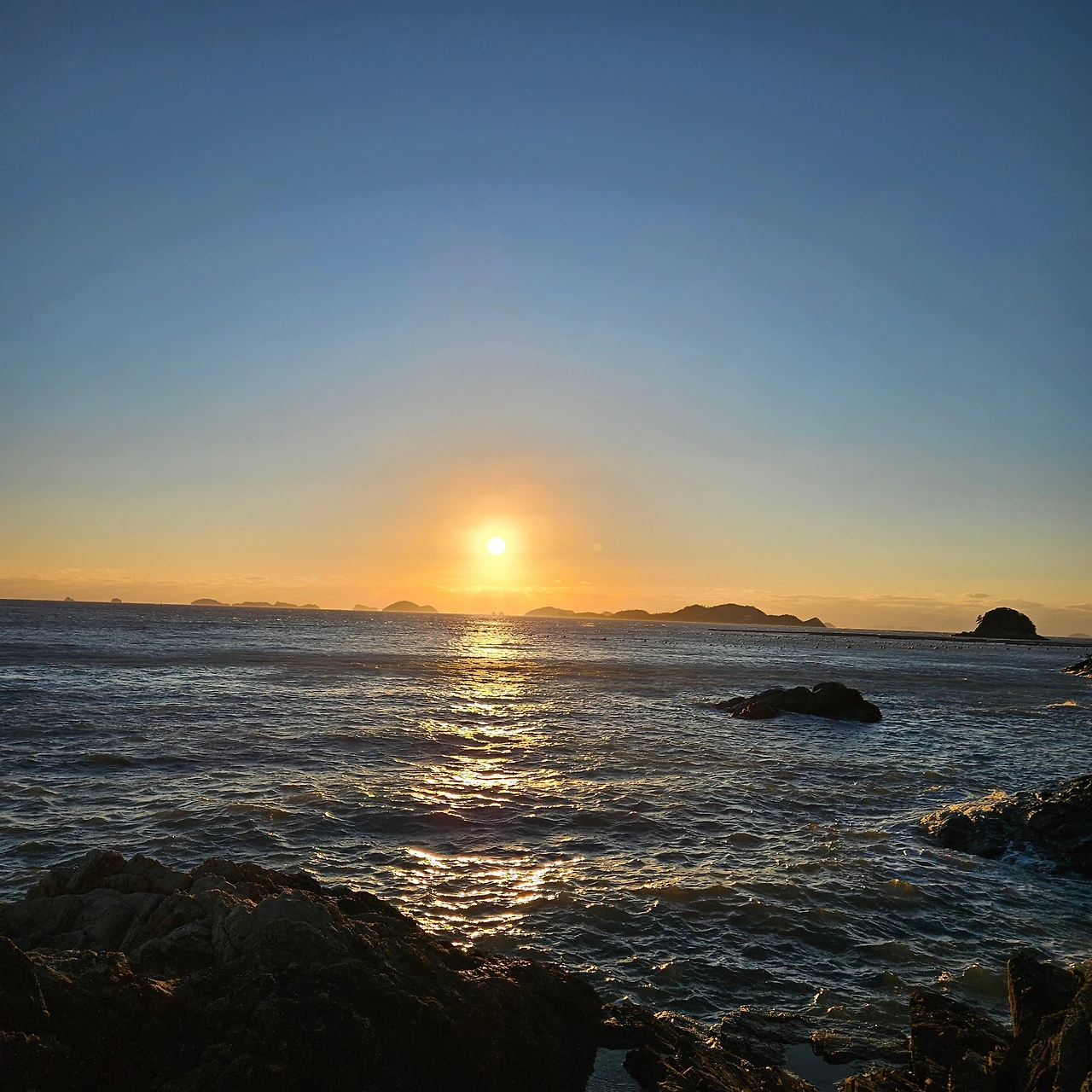 나와 B는 갈두산 정상에서 일몰을 지켜보았고, H와 J는 전망대를 올라서 일몰을 보았다. 산 정상에서 바다에서 불어오는 바람이 휘몰아치고 있다. 땅끝이 남해와 서해의 경계로 국립해양조사원은 정하고 있으니 서해로 떨어지는 해를 바라다보는 것이다. 결과적으로 해와 달은 서해로 떨어지는 것이다. 해가 바닷속으로 빠지니 광풍이 몰아친다.