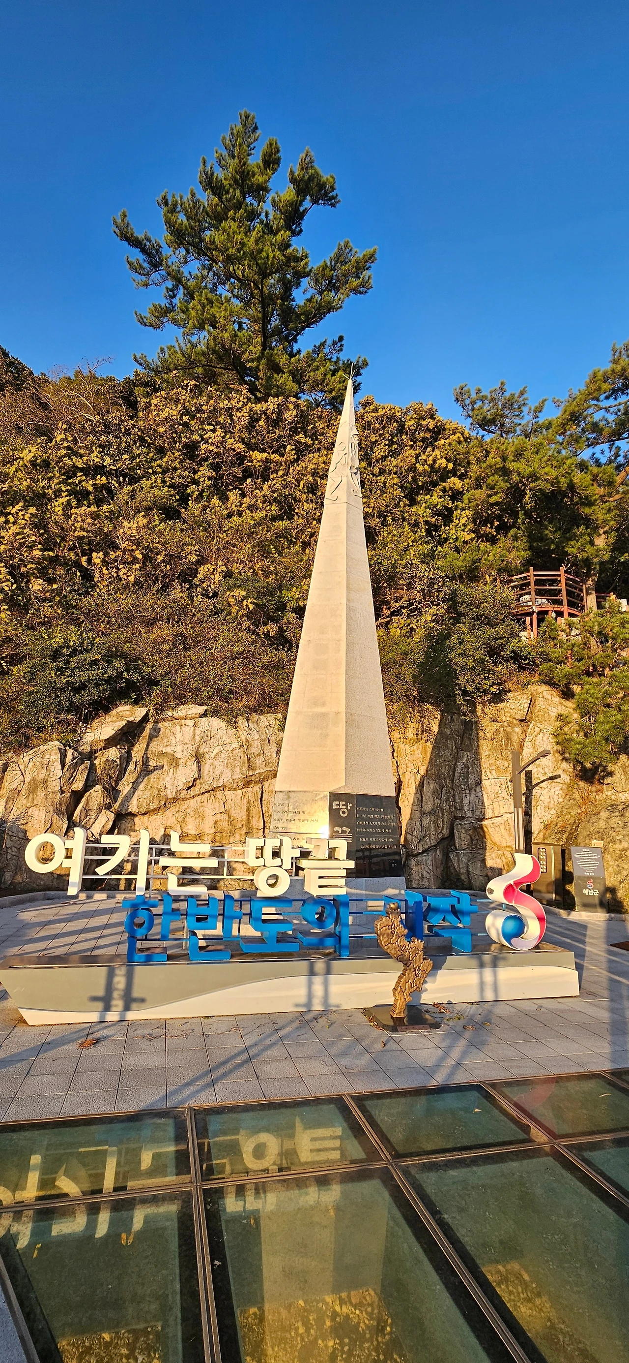어제의 불쾌한 감정을 오늘은 깔끔하게 청산하였다. 오늘의 숙소 프런트는 너무 친절하다. 마을이 크지 않아서 그런지 물어보면 즉시 답이 나온다. 인상이 중요하고 응대태도에 따라 기분이 달라진다고 보면 될 것 같다. 아침부터 천상천하의 두륜산을 보고 대흥사를 보았다. 그리고 이제 땅끝마을에서 일몰을 보면서 마감을 하려고 한다. 땅끝탑과 전망대를 둘러보기 위하여 이동을 시작한다. 하지만, 땅끝탑으로 가는 길이 11월 말까지 공사 중이라는 안내가 있다. 하지만, 그것을 두려워하지 않고 공사 중인 인부들에게 서울에서 왔는데 들어갈 수 없는지 요청을 하니 공사 중인 인부들이 우리들을 이해하였는지 아직 공사가 시작되지 않은 곳을 알려준다. 우리는 그곳을 이용하여 땅끝탑으로 갔다. 그렇지 않았으면 땅끝 전망대를 올랐다가 내려와야 했는데 그렇지 않았다는 것에 감사를 드리면서 데크로 들어서서 땅끝탑에 도착하였다.