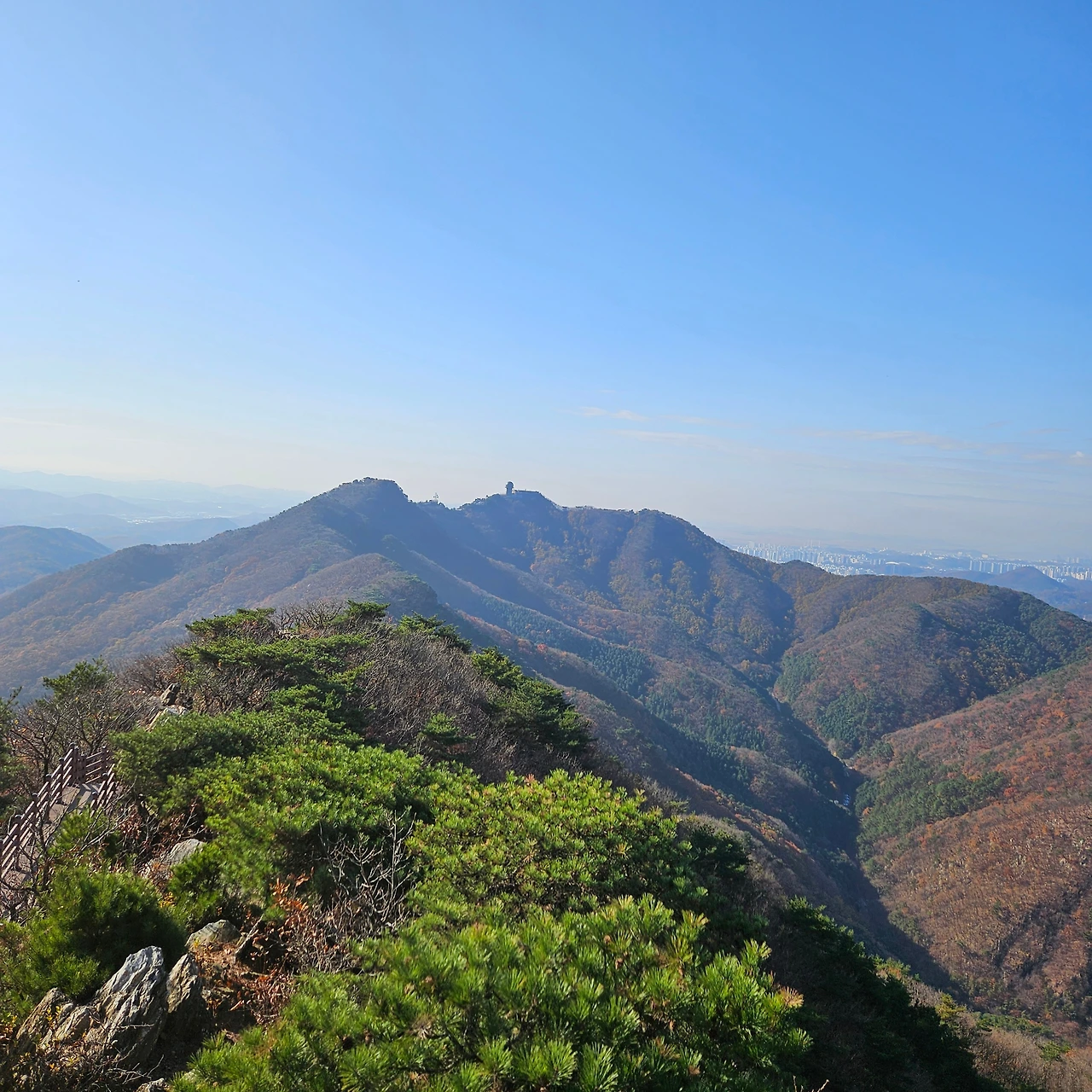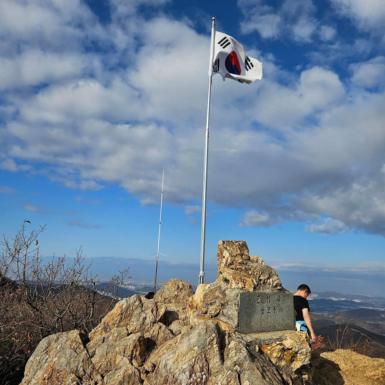 관모봉을 올랐다. 오늘 가장 힘들게 오른 것이다. 관모봉은 예전 벼슬아치들이 쓰던 관모의 형태를 하고 있다고 하여서 붙여진 이름이라고 한다. 관모봉 정상에는 여전히 태극기가 바람에 휘날리고 있다. 수리산에서 가장 전망이 좋은 곳이 이곳 관모봉이라고 한다. 다음이 수암봉이다. 정상은 태을봉이지만 그곳의 경치는 그렇다. 관모봉 정상에서 삼성산, 관악산 줄기를 보고 더 멀리 청계산을 확인한 후 백운산, 모락산을 확인한다. 오늘은 이곳 주변의 다양한 산과 호수를 확인하는 것도 재미라고 할 것이다.