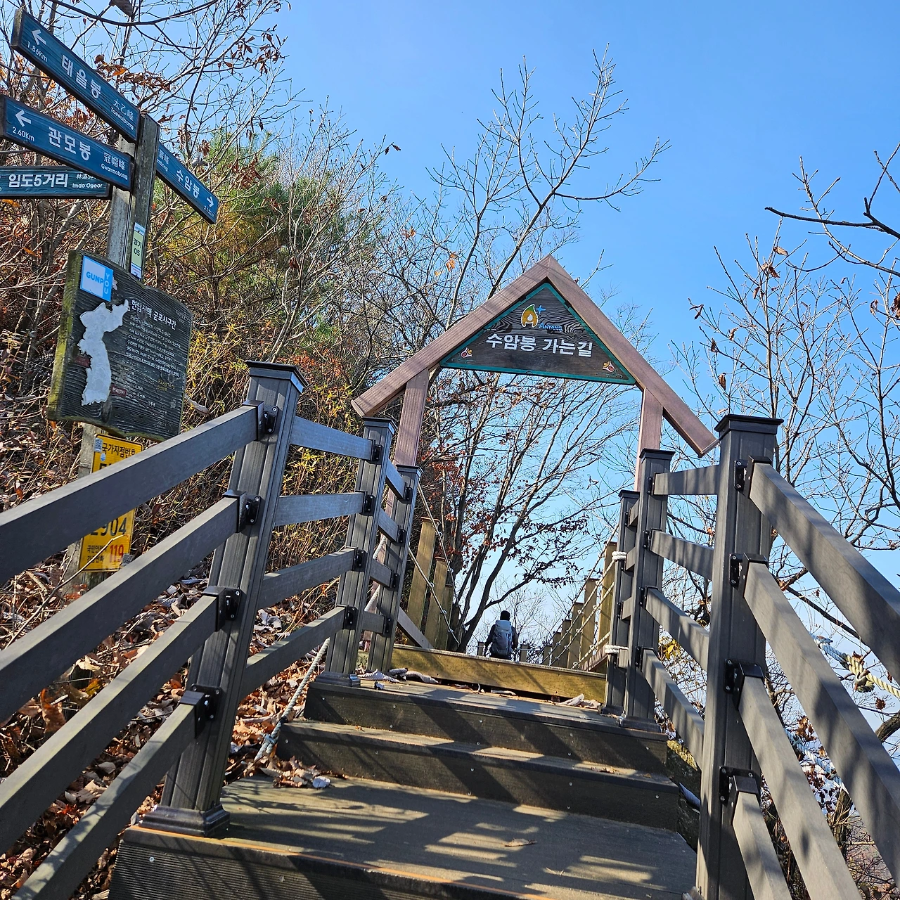 부대를 올라가는 비포장도로를 벗어나 수리사로 가는 길과 수암봉 가는 길 갈림길에서 수암봉으로 간다. 수암봉 가는 길이다. 안산과 시흥사람들이 많이 찾고 있다. 395m의 수암봉을 오르는 길이 안산과 시흥사람들에게 좋은 운동코스가 될 것이다. 적당한 등산로가 어쩌면 많은 사람을 찾게 할 것이다. 남녀노소 누구나 찾을 수 있는 산이 된다고 본다.