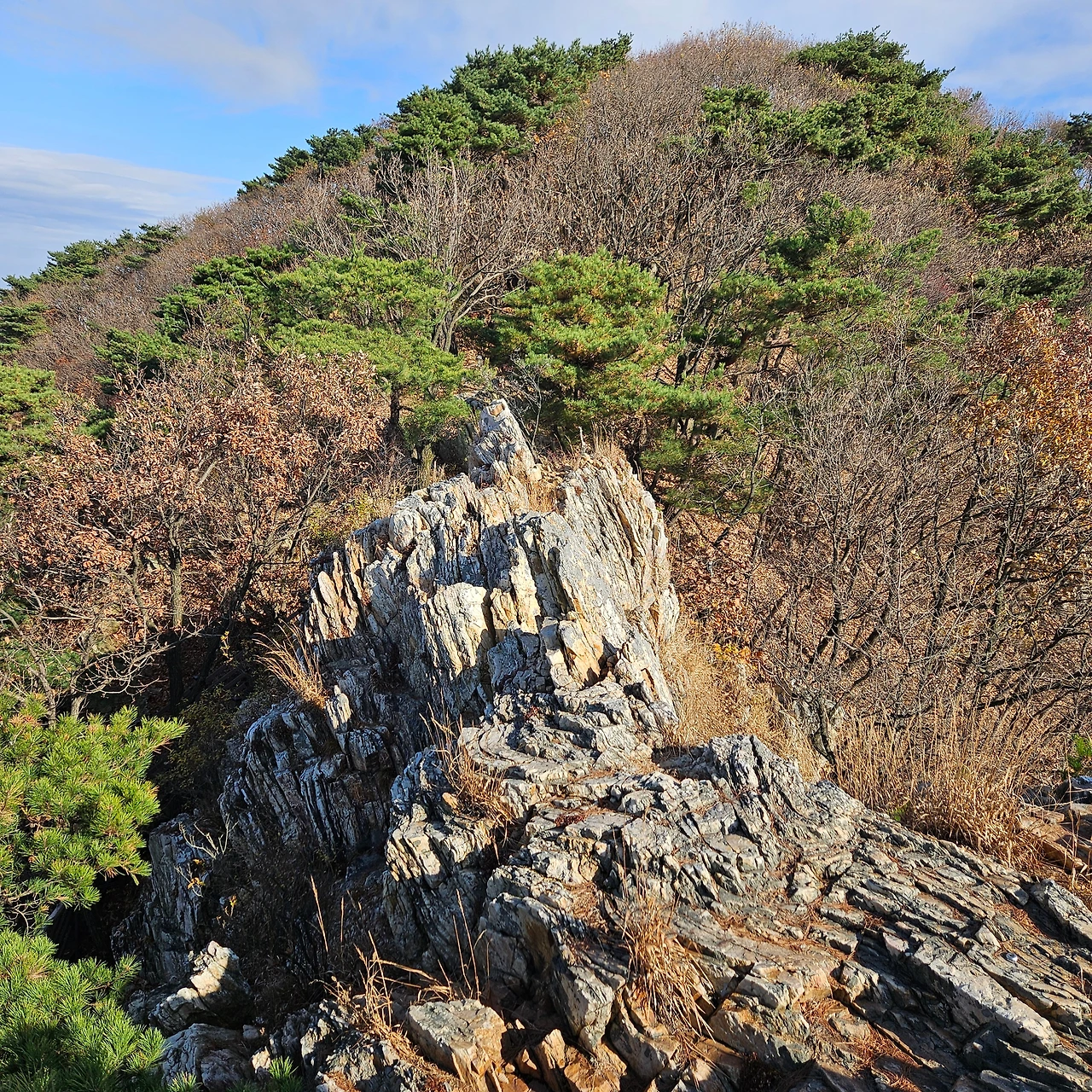 병풍바위 전망대를 지나고 100m 이상을 데크를 이용하여 내려가고 난 다음부터는 오르고 내리면서 슬기봉까지 간다. 이동을 하면서 암릉지대가 있다. 그곳이 칼바위 능선이 된다. 차돌바위로 형성이 되어 있다. 능선을 지나면서 조망을 할 수 있는 쉼터에 앉아 쉬고 있다가 B의 선글라스가 발밑으로 들어갔다. 과실율을 계산하니 재미있다. 밟은 사람이 30%, 보고도 가만히 있었던 사람이 30%, 지나가는 자리에 둔 사람이 30%, 무엇을 주겠다고 부른 사람이 10%다. 이제 선글라스 없이 걷게 되어 미안하다.