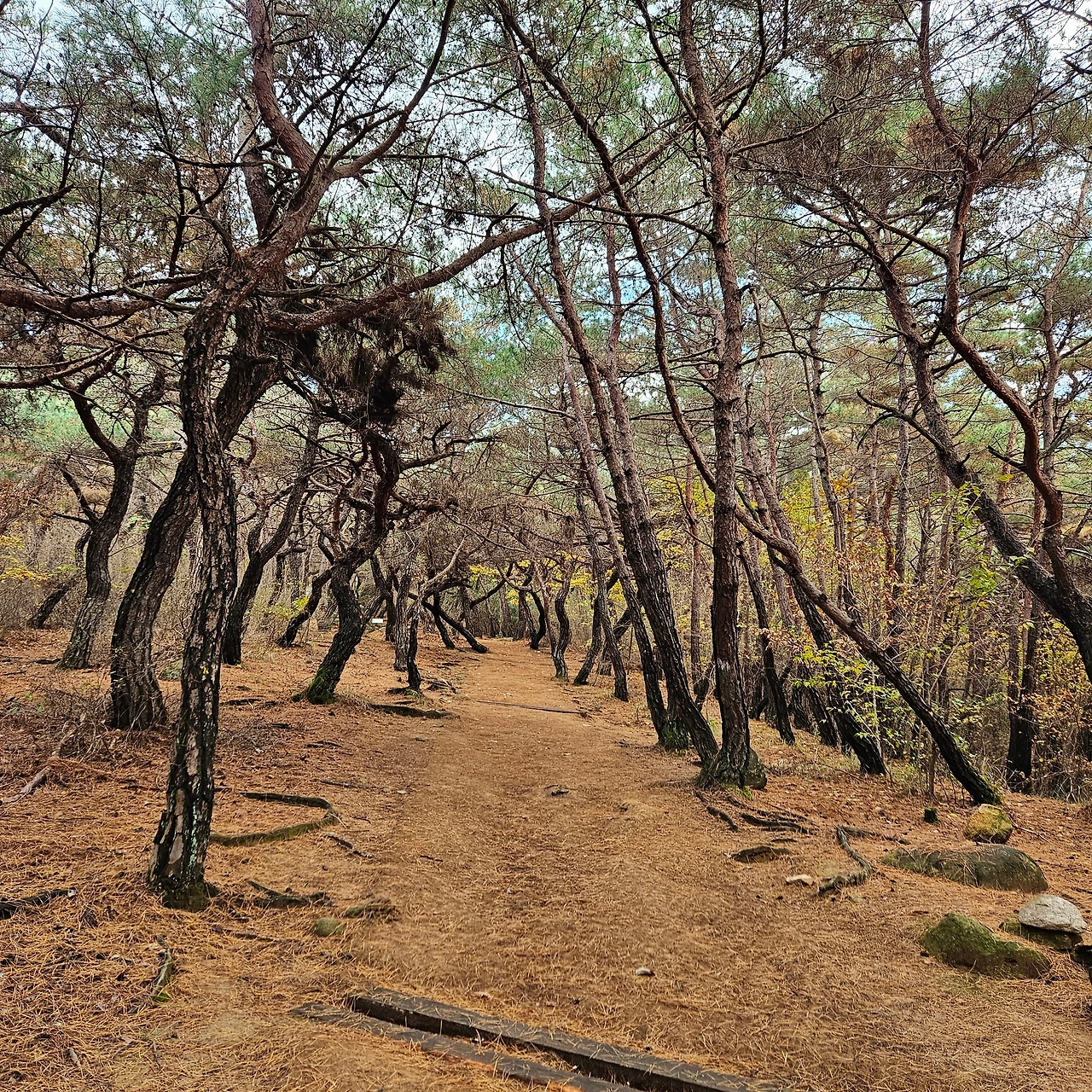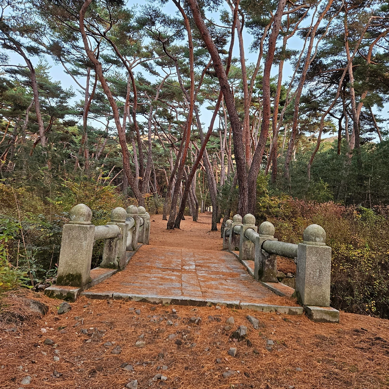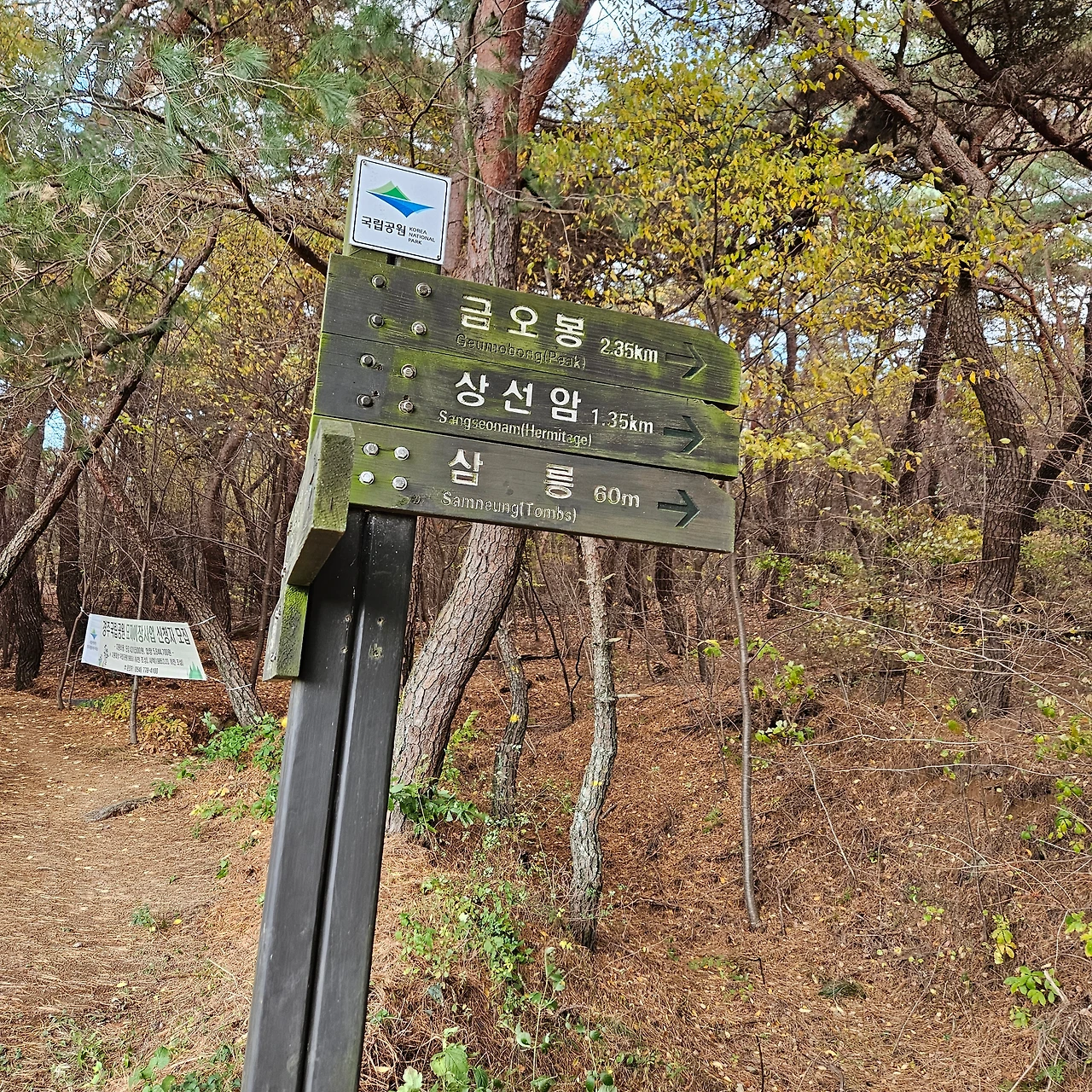 금오봉을 가는 길에 들어선다. 금오봉을 가는 길에 삼릉이 있어서 다가선다. 신라 8대 국왕 아달라 이사금 박아달라, 53대 국왕 신덕왕 박경휘, 54대 국왕 경명왕 박승영의 능이라고 전한다. 이 세 왕의 공통점은 모두 박 씨다. 신라의 왕들은 박, 석, 김 씨가 번갈아 가며 수행하였다고 한다. 이곳의 소나무 숲은 국내에서 가장 아름다운 소나무 숲으로 손꼽힌다고 한다. 동 소나무는 '안강형 소나무'인데, 경주 외 타지방에는 드물고 특이하게 생겼다. 특히 안개가 낀 날의 분위기는 신비롭다고 한다. 나도 한번 담아보았다.