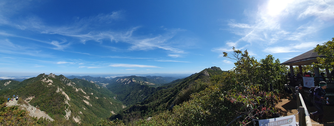 연천봉에서 쳐다본 계룡산 능선이 우리를 왜 계룡에 왔는지를 알려준다. 연천봉을 올라 계룡 능선을 보면서 아름다운 구름을 눈에 넣는다. 휴대폰에 넣는다. 연천봉정상의 데크는 정비중이다. 데크 보존을 위한 기름칠을 하였다. 계룡이 무엇일까를 궁금하게 한다. 관음봉 정상에서 본 한운은 비교대상이 아니다. 와이드모드로 친구와 나를 담아본다. 사람이 그렇게 거슬리지 않게 자연에 어울렸다.
