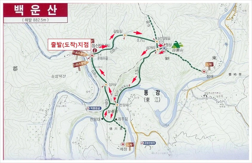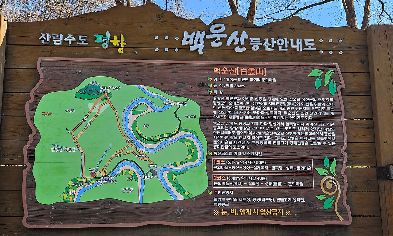 산림청에서 설명하기를 점재 마을에서 시작하는 것이 일반적이라고 하지만, 안내산악회는 그곳에 도착하면 등산객들을 다시 버스로 승차시키는 지점이 그렇고 하여서 백룡동굴이 있는 문희마을에 도착하여 백운산 정상을 오르고 칠족령으로 하산한 후 문희마을로 복귀하는 코스를 설계하였다. 나는 이코스를 통하여 백운산을 오르고 내렸지만 결과적으로는 반대가 더 멋도 있고 힘도 덜 들 것 같다. 주변의 경치를 보면서 오르는 것이 오르기만 하는 것보다는 덜 힘든 것이 사실이기 때문이다.