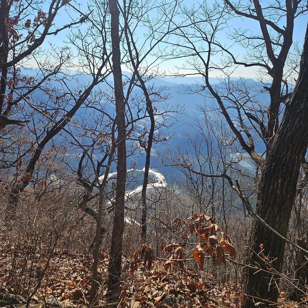 백운산 정상을 가는 길은 쉽지 않다. 갈지자로 오르고 오른다. 저만큼 앞에 사람이 오르지만 그 사람을 따라 잡기보다 내 길을 걸어야 한다. 이정표에 문희마을이 1.3km 그리고 누군가가 정상을 25분이라고 표시한 곳에 도착하면 이제는 천천히 오를 수 있다. 5-600m를 오르고 오른 상태에 여름이면 어떨까 생각한다. 차라리 하산코스라면 그래도 편안한 흙길이기에 괜찮지 않을까 생각한다. 동강이 보이는 지점에 도착하면 정상이 보인다. 그곳에서 한차례 굽이치는 동강을 보고 정상을 간다. 정상에서 조망이 없다. 동강을 바라다보는 지점에서 칠족령으로 다시 내려가야 한다.
