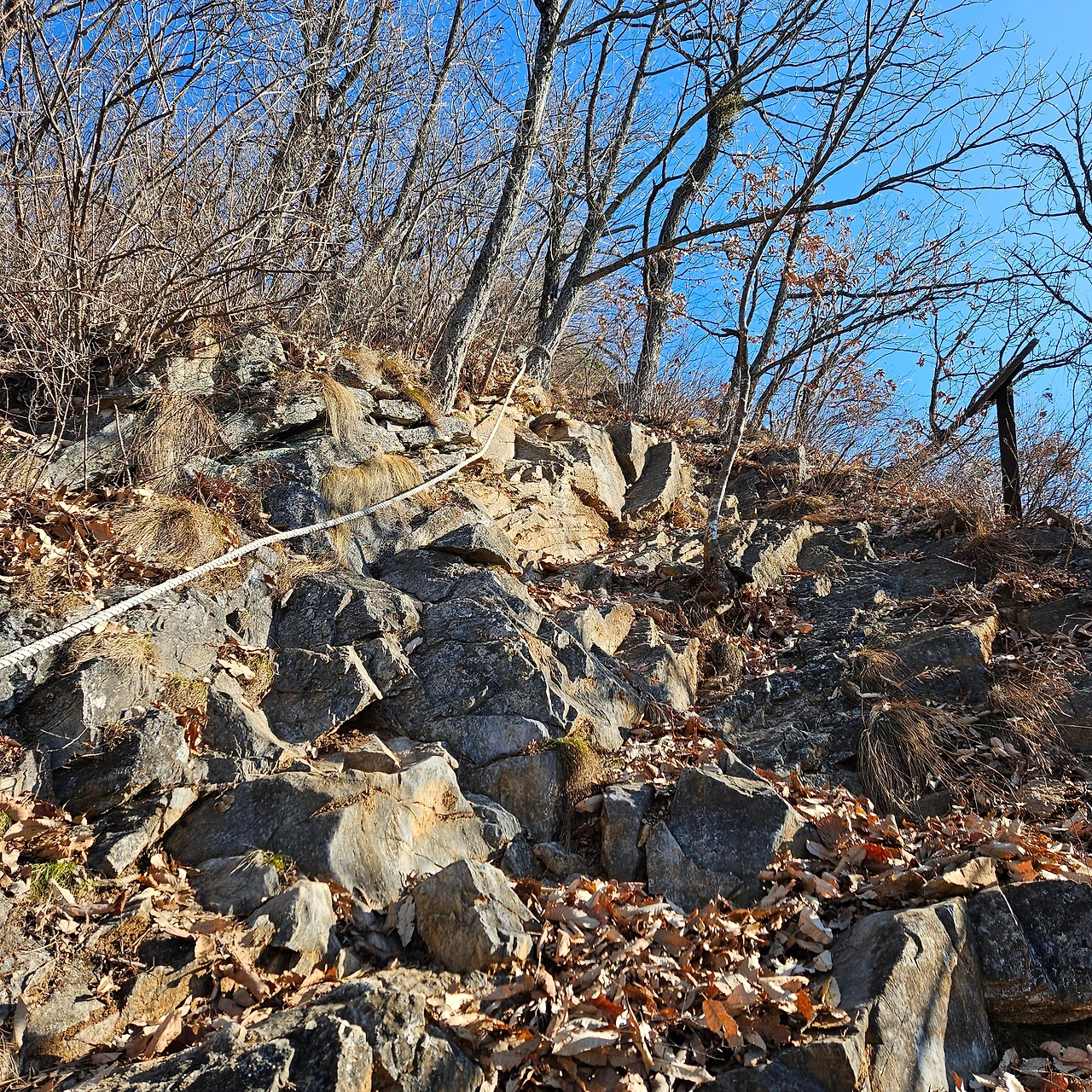 칠족령으로 내려가기 전에 그 능선을 바라다보면 산림청에서 설명한 바와 같이 암릉지대 그대로다. 6개 봉우리를 다 지나가는 것은 아니지만 5개 봉우리를 지난다고 보면 될 것이다. 가파르게 내려가는 왼쪽은 벼랑이다. 그 벼랑 바로 옆에 길이 있다. 그 길이 그렇게 좋지는 않다. 사람들이 많이 다녀서 반들반들하다. 미끄럽지 않게 조심하게 내려간다.