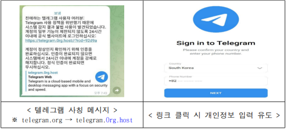 어느 날 텔레그램 화면에 이런 것이 나타났다. 텔레그램 보안센터라고 하면서 내가 내 계정으로 스팸 등을 보내서 신고가 들어왔다. 그러니 네가 바로 니 계정을 24시간 내에 너를 인증하라고 한다. 아무 생각 없이 클릭하였다. 그러니 델레그램의 사이트가 나타나고 나를 인증하는 번호를 입력하라고 한다. 그것이 텔레그램의 보안센터로 인식하고 개인정보를 등록하고 나아가지만 사실 나를 스미싱 하여 나의 계정을 탈취하는 것이었는데 아무 생각이 없이 클릭 클릭하다가 나는 2단계 인증을 하는데 내 비밀번호가 생각이 나지 않아서 해킹을 당하지 않았다.