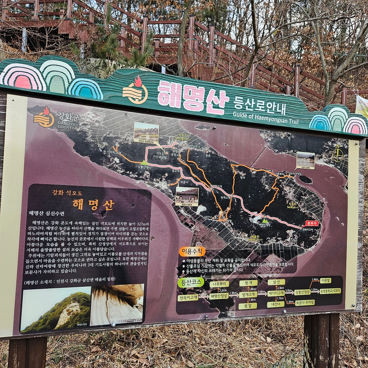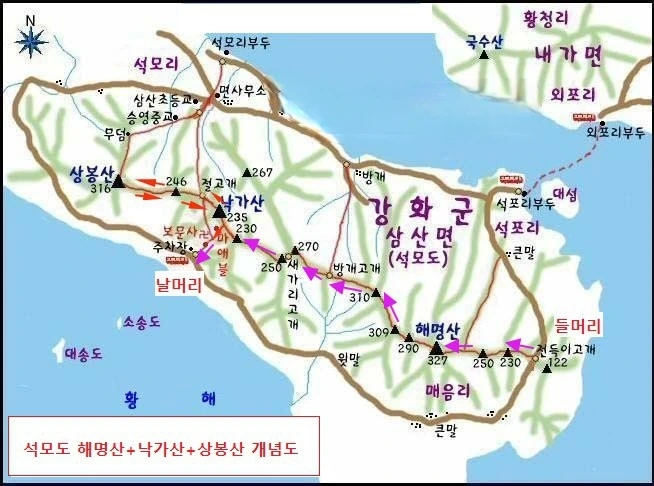 석모도는 섬은 섬이지만 어부들보다 농부가 많다. 조선시대에 간척사업으로 북쪽의 송가도, 남쪽의 매음도와 합쳐졌고, 일제강점기에는 남서쪽의 어음정도와 합쳐져 너른들을 가지고 있다. 그 가운데 섬을 가로지르는 능선이 있다. 그 능선길을 걸어보는 것이다. 그 능선에 3개의 산이 있다. 그냥 봉우리 3개 있는데 그렇게 산이라고 이름을 붙였다고 보아도 되지만 산이다. 해명산(327m), 낙가산(267m), 상봉산(316m)이 있다. 그 산을 지나가는 능선은 전득이고개 또는 한가라지고개에서 시작한다고 보면 될 것이다. 고갯마루에서 시작하여 고갯마루까지 이어지는 이어지는 긴 능선이 9km 정도 된다.