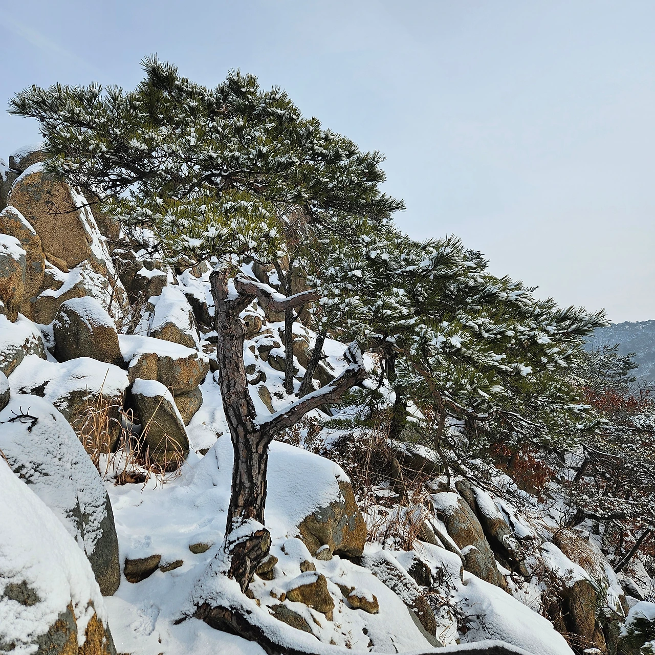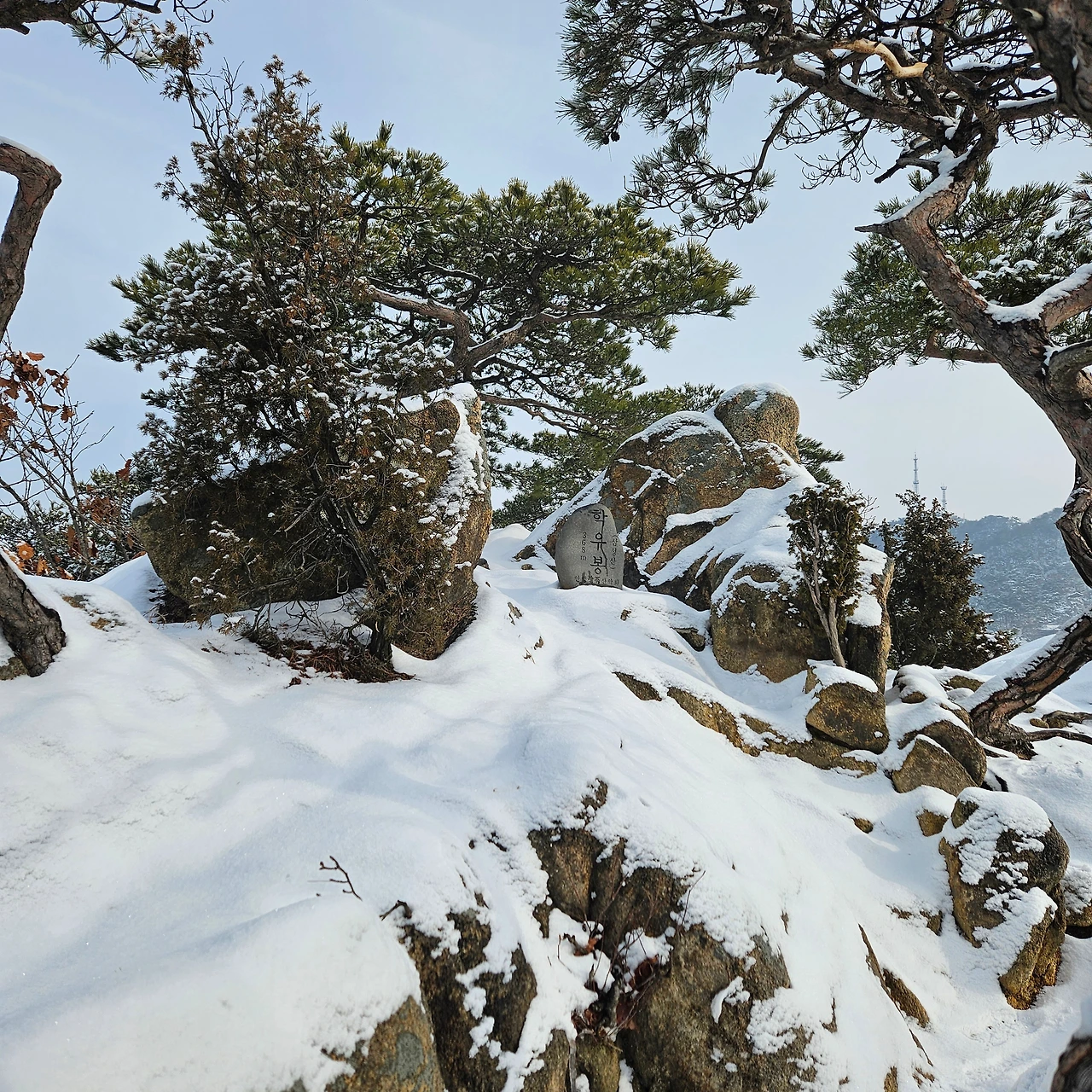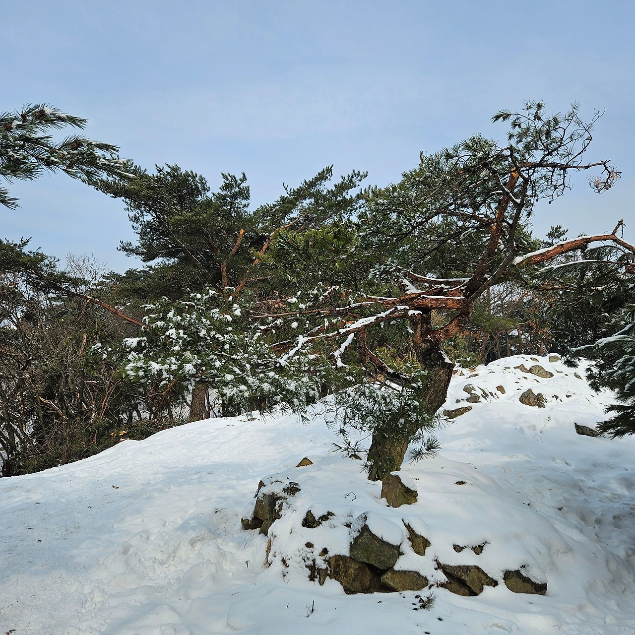 송신소 근처가 삼성산 정상이다. 이제 하산을 하여서 호압산 장군봉을 오르면 오늘의 산행은 끝이 난다. 눈이 왔지만, 산악자전거를 타는 사람들이 올라왔다. 내려갈 때 눈길에 다치지 않기를 바랄 뿐이다. 만용이 될 수 있지만, 두 발로 걷을 때에도 아이젠을 착용하고 걷는데 두 바퀴로 무섭게 내려가고 있다. 삼악사로 가는 길, 서울대로 내려가는 길, 장군봉으로 가는 길이 만나는 갈림길에 있는 소나무가 눈을 머리에 이고 아름다움을 만끽하고 있지만, 이 소나무도 아프다.