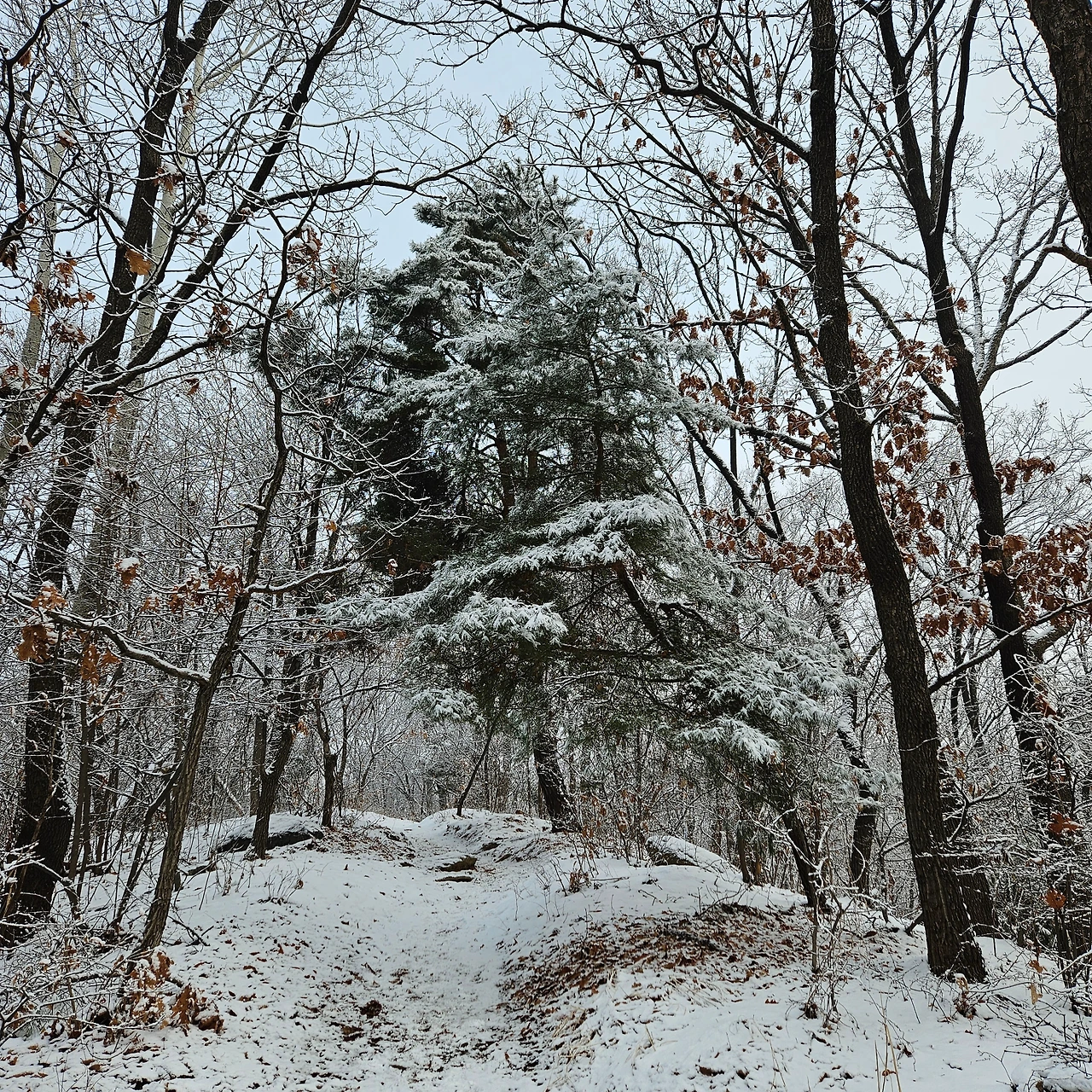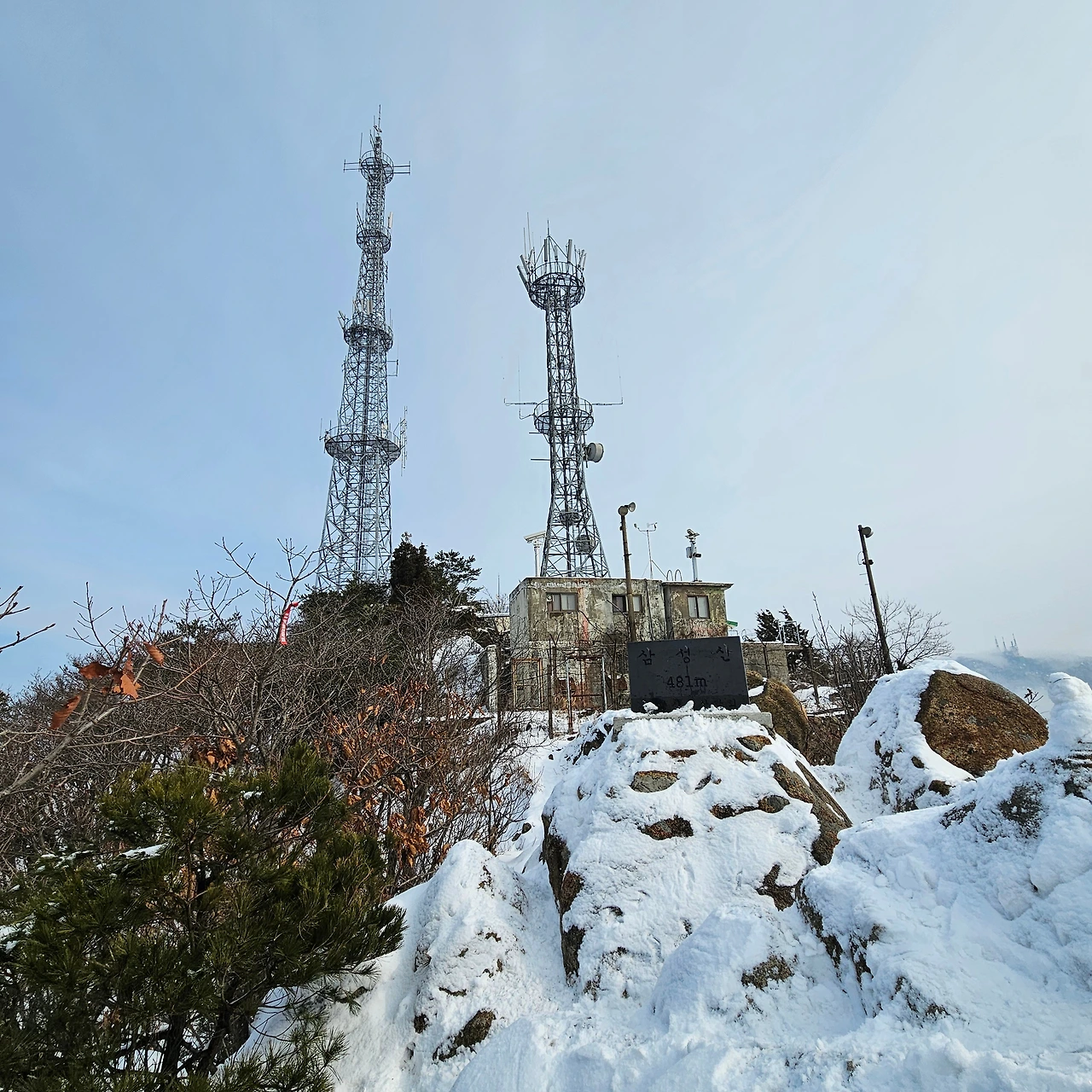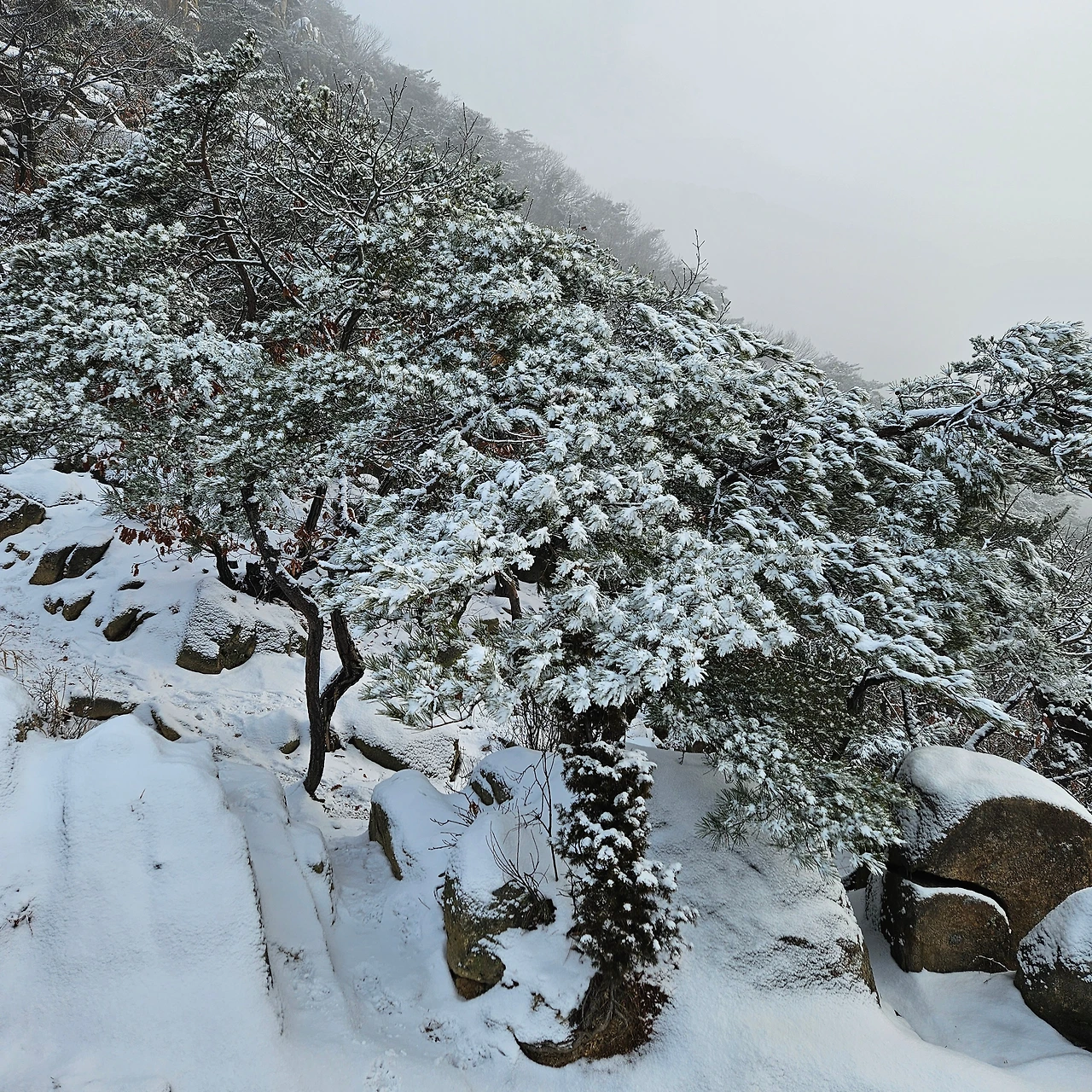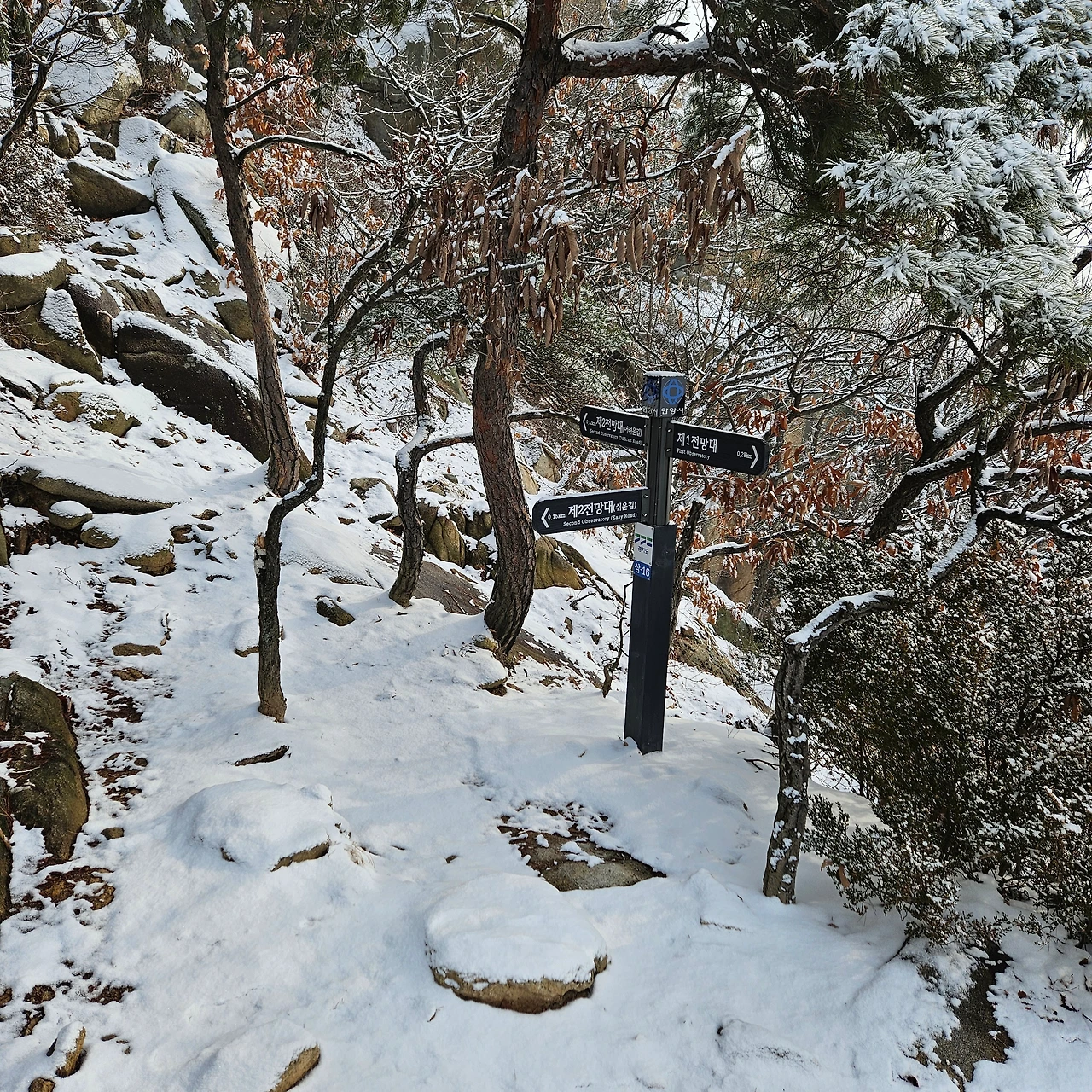 송신소 근처가 삼성산 정상이다. 이제 하산을 하여서 호압산 장군봉을 오르면 오늘의 산행은 끝이 난다. 눈이 왔지만, 산악자전거를 타는 사람들이 올라왔다. 내려갈 때 눈길에 다치지 않기를 바랄 뿐이다. 만용이 될 수 있지만, 두 발로 걷을 때에도 아이젠을 착용하고 걷는데 두 바퀴로 무섭게 내려가고 있다. 삼악사로 가는 길, 서울대로 내려가는 길, 장군봉으로 가는 길이 만나는 갈림길에 있는 소나무가 눈을 머리에 이고 아름다움을 만끽하고 있지만, 이 소나무도 아프다.