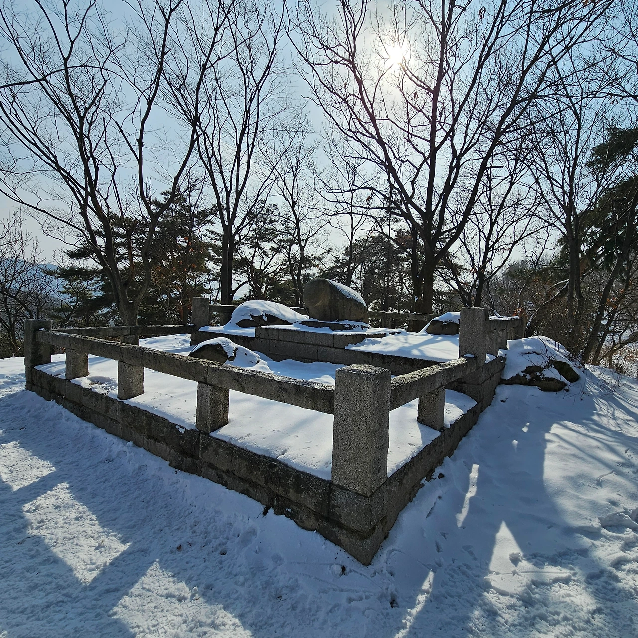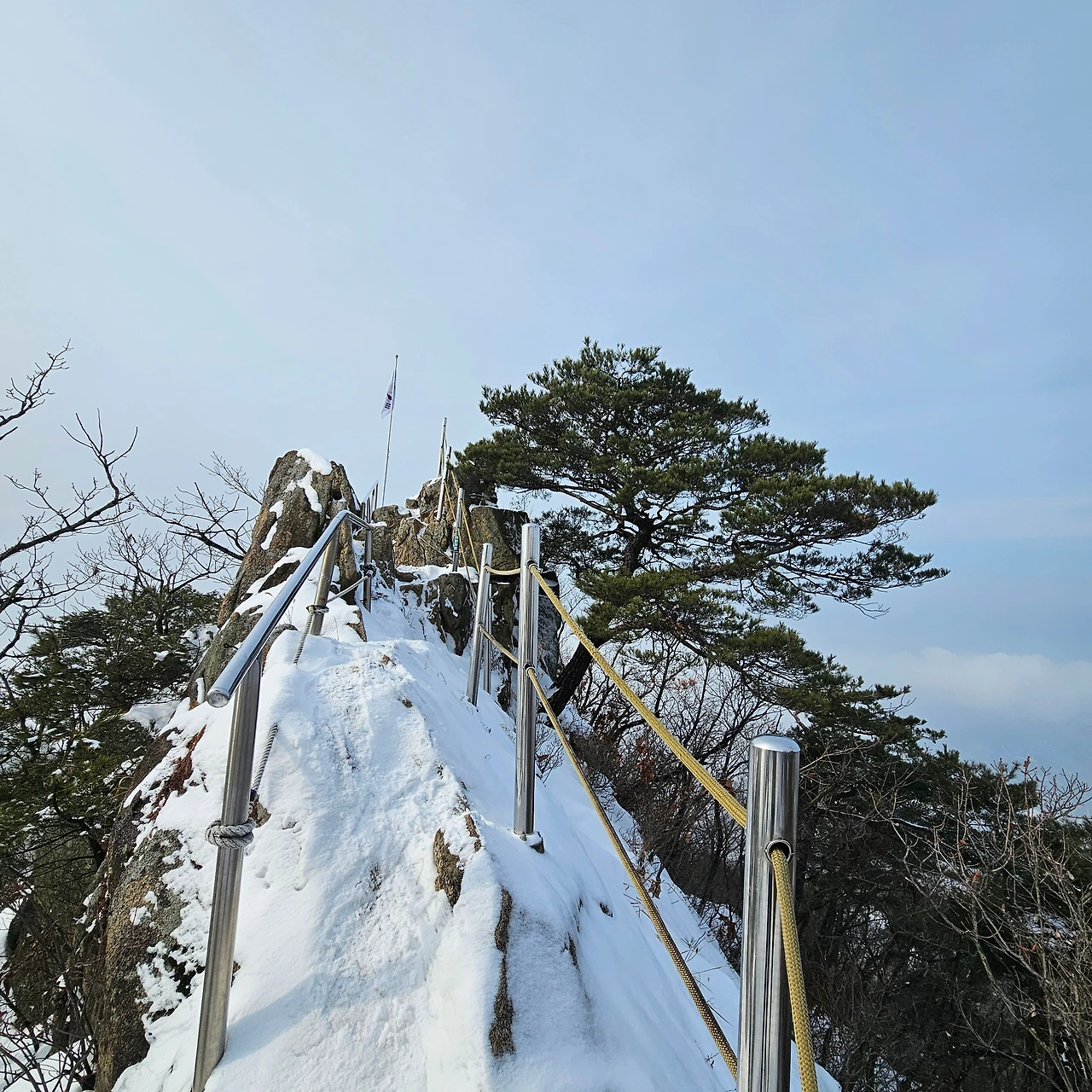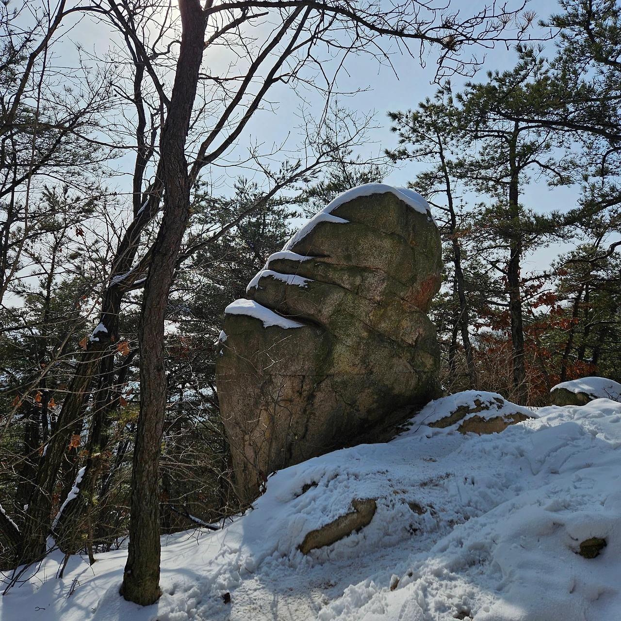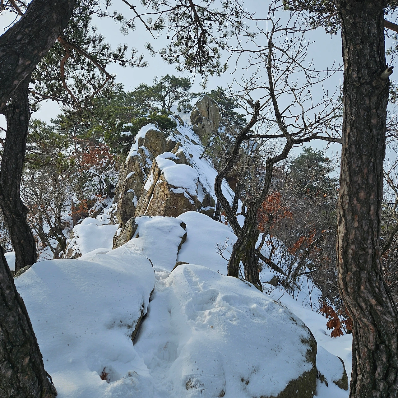 험한 길과 편한 길이 있는데 평상시 같으면 험한 길도 몇몇은 지나간 흔적이 있는데 눈이 쌓인 바윗길은 지난 흔적으로 보이지 않는다. 2 전망대를 바로 앞에 두고 흰머리를 그대로 드러낸 암릉지대는 회피하고 안전한 길을 걷는다. 데크를 오르고 2 전망대에 도착하여 경치를 감상하지만, 전날 내린 눈이 따뜻한 공기를 만나서 활성안개를 이루어 멀리는 보여주지 않는다. 맑은 날 멀리 인천 송도까지 볼 수 있는데 오늘은 바로 앞에 있는 경인교대만 보여줄 뿐이다.