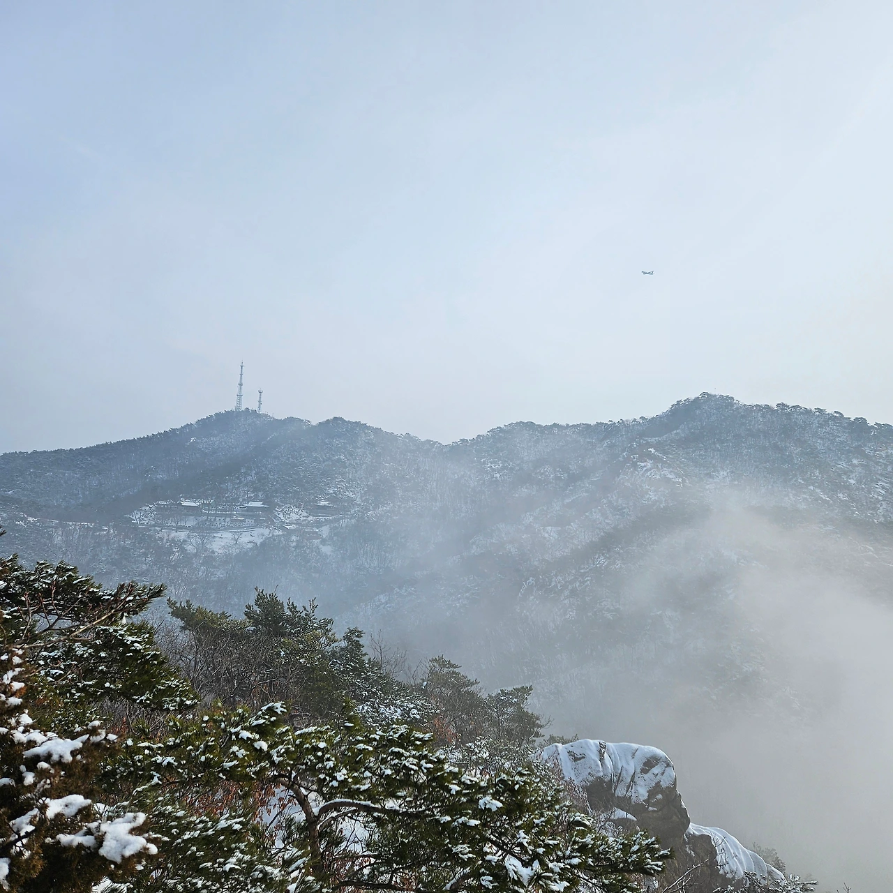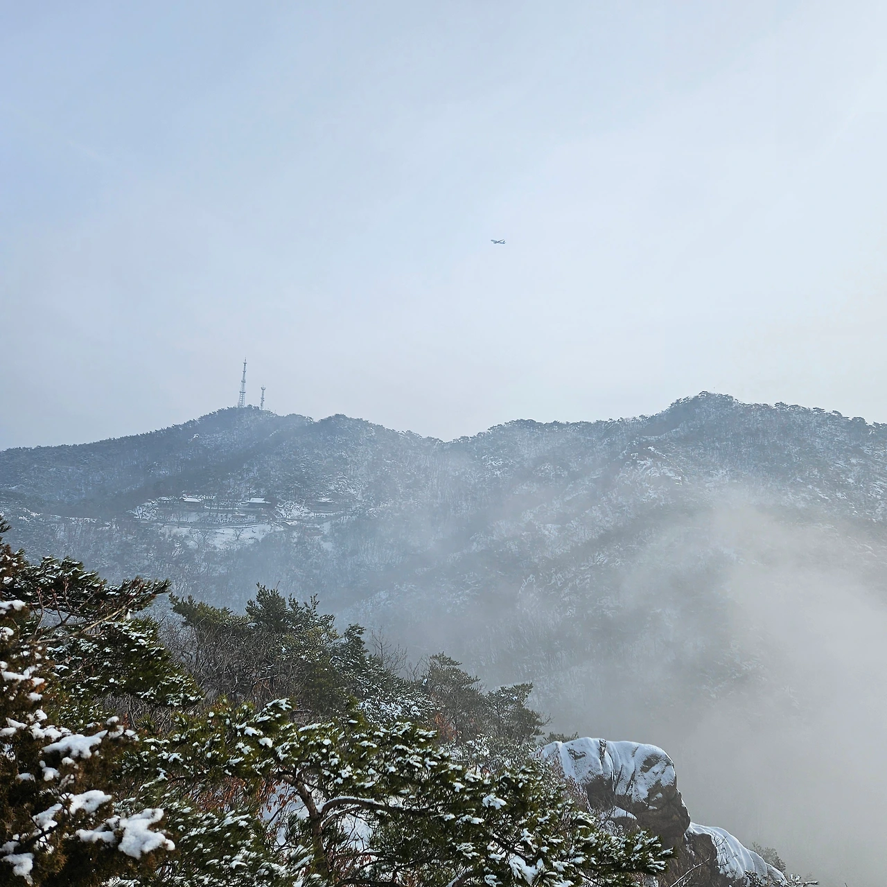 전망대를 내려가면서 조심스럽게 가면서 학우봉을 갈 것인지 고민을 하다가 몇몇이 간 흔적이 있어 그 발자국을 따라 오른다. 오르는 것은 오를 것 같은데 내려오는 것은 극구 사양한다. 학우봉 정상에서 국기봉 정상위를 가로질러 김포공항으로 가는 비행기와 삼성산 정상을 같이 담고, 산사가 호젓하게 자리 잡고 있는 모습을 그대로 담는다. 산사가 이제는 조용하지 않다. 예전에는 산사에서 눈이 내리면 조용하게 빗질하였으나 이제는 문명의 도구를 활용하여 쌓인 눈을 정리하고 있다.