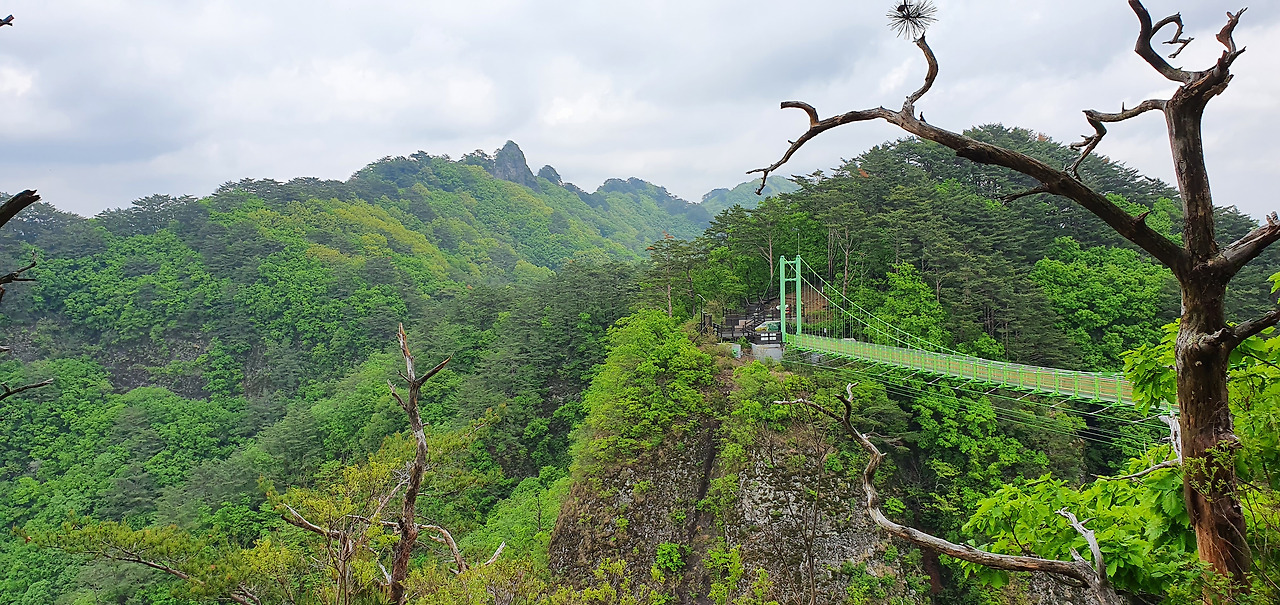 하늘다리는 해발 800지점에 위치한 자란봉과 선학봉을 잇는 길이 90m, 높이 70m, 바닥폭 1.2m로 현수교이다. 높이가 70m지점인 중간 부분에서는 고소공포증이 있는 사람은 지나가는 것에 어려움이 있을 것이다. 나도지나가면서 무서움이 왔다.