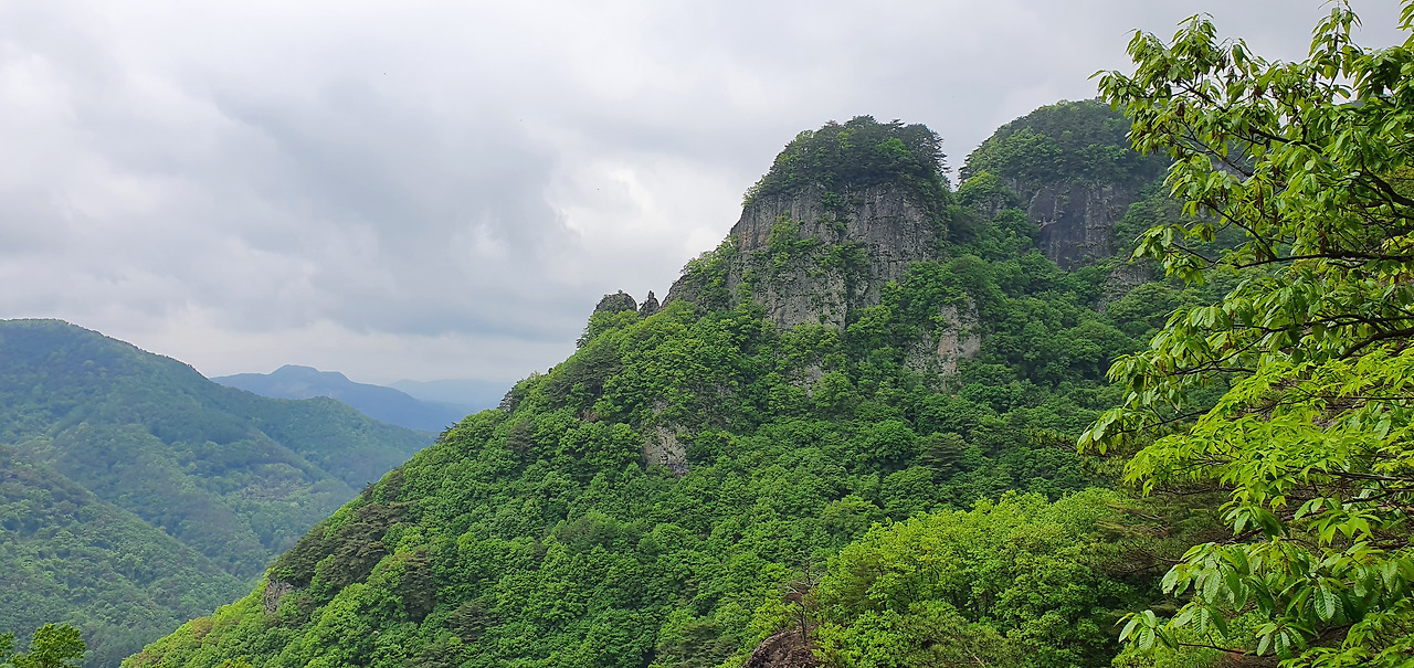 연적봉위에서 탁필봉과 자소봉을 바라보는 모습도 일품이다, 우뚝솟은 봉이 자소봉이고 바로 앞에 보는 봉이 탁필봉이다.