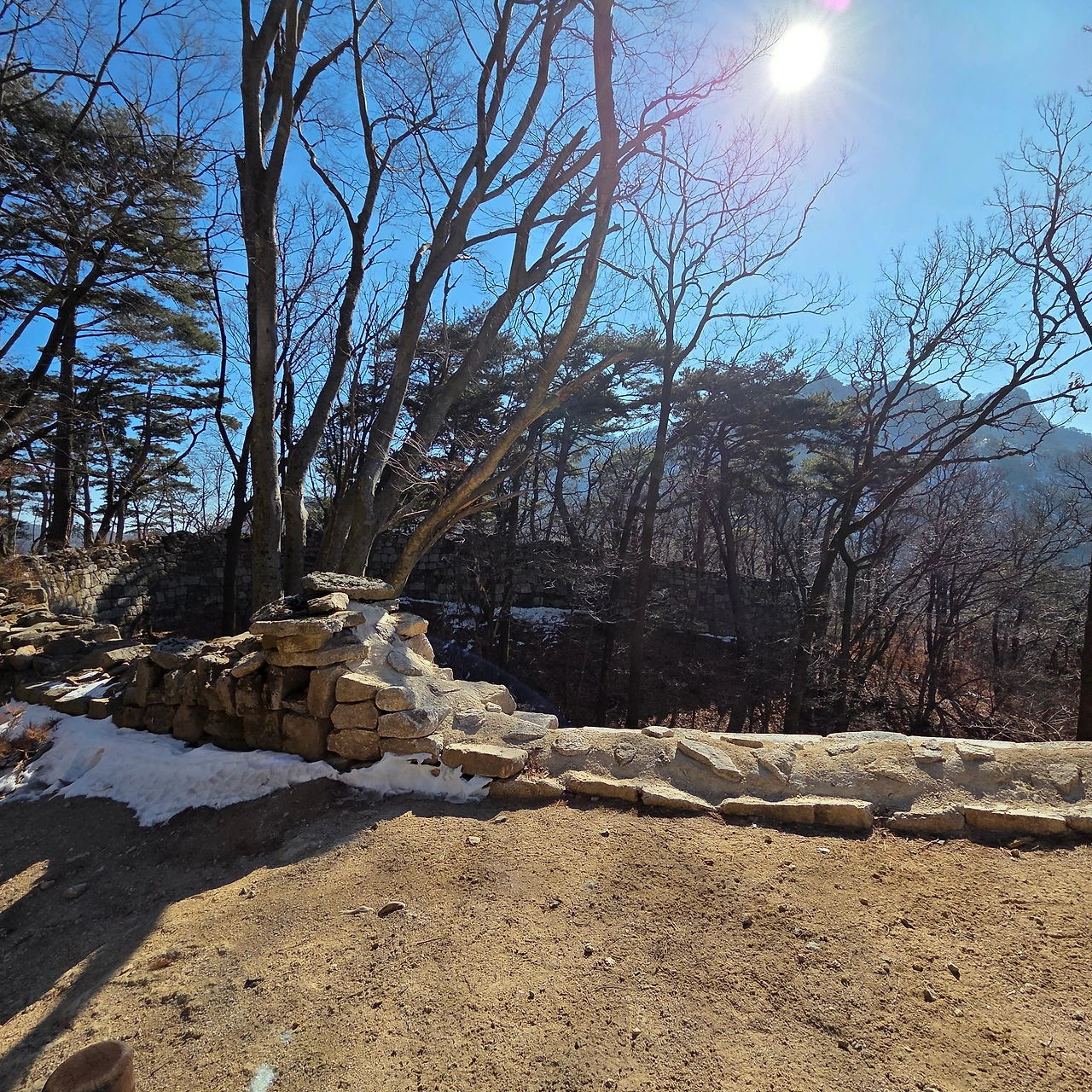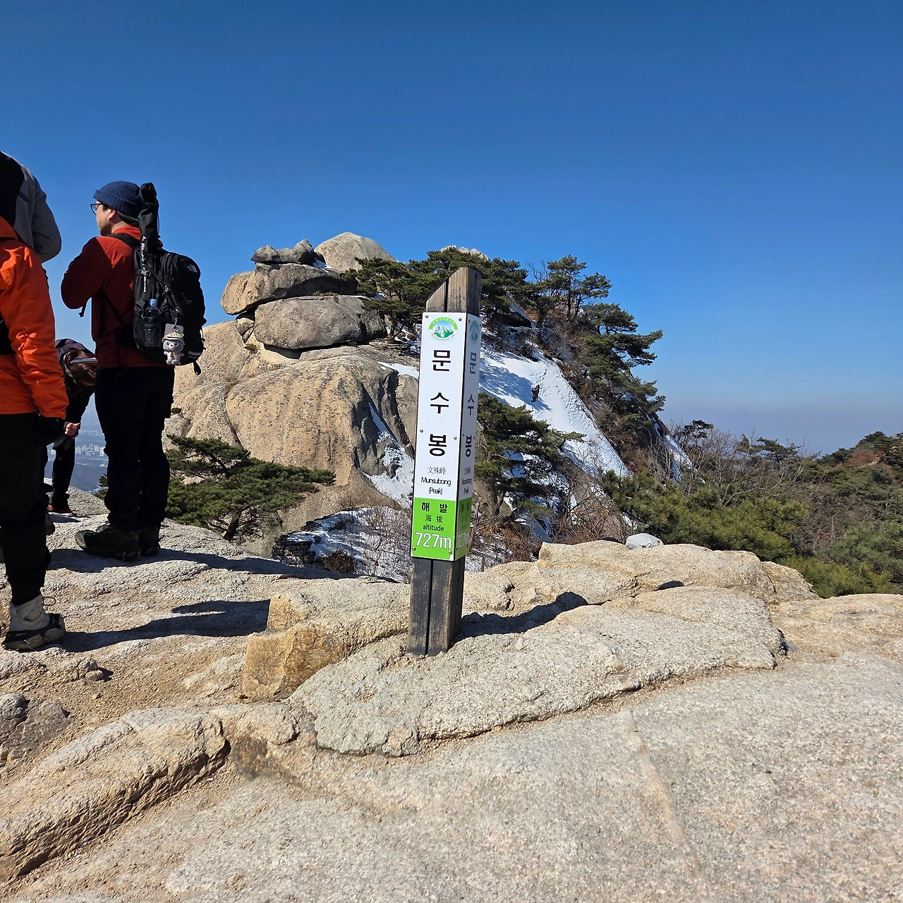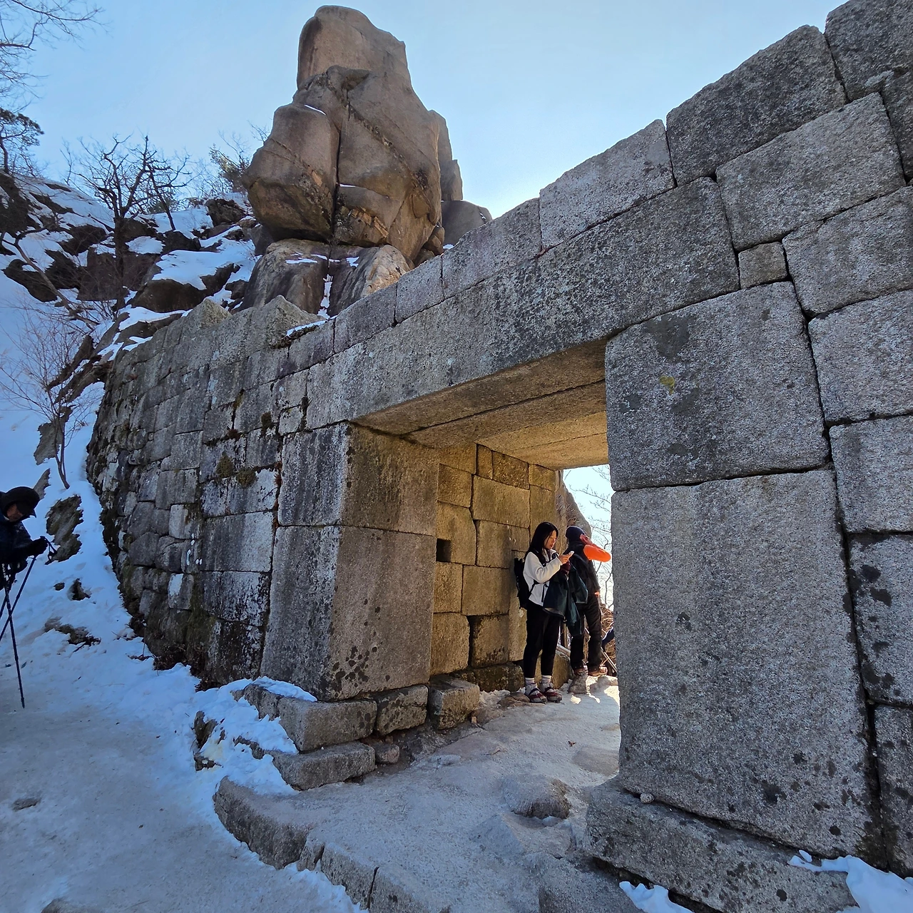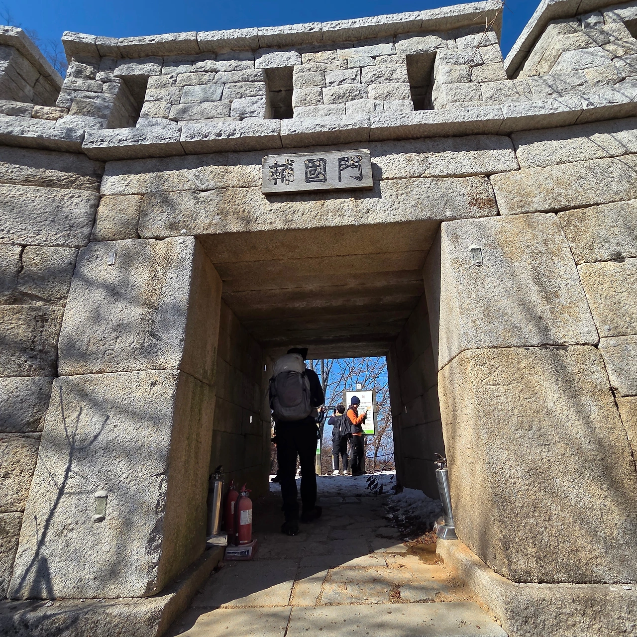 그리고 봉우리를 바로 올랐다가 내려오는 길은 겨울 등산인만큼 회피하고 나한봉을 갔다가 온다. 나한봉의 성곽을 확인한 후 남장대라고 알려져 있고 715봉이라는 봉을 오른다. 문수봉을 바로 앞에 두고 이제 700m를 넘어선다. 의사봉, 용출봉, 용혈봉, 증취봉, 나월봉, 나한봉을 오르고 남장대라는 715봉을 올라 벌써 봉만 6개를 오른 것이다. H가 힘들다고 하지만, 청수동암문을 지난다. 비봉능선을 따라 올라오는 사람들이 이리로 올라온다. 청수동암문을 지나면 바로 문수봉을 오를 수 있고 아니면 대남문으로 우회할 수 있다. 우리는 문수봉을 올랐다. 비봉능선을 따라 올라온 사람들인 힘든 코스는 바로 문수봉을 오르고 쉬운 코스는 청수동 암문으로 오른다.