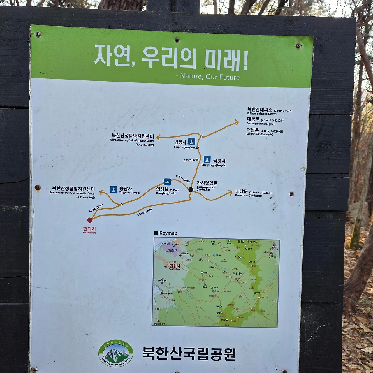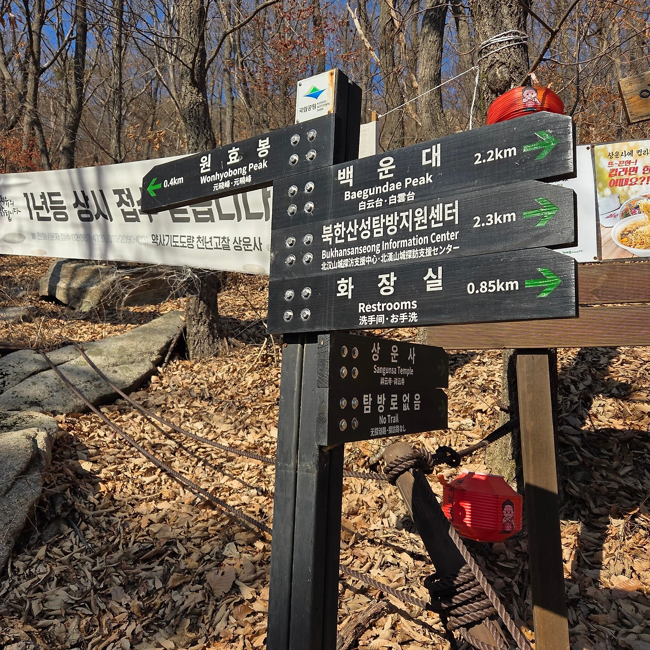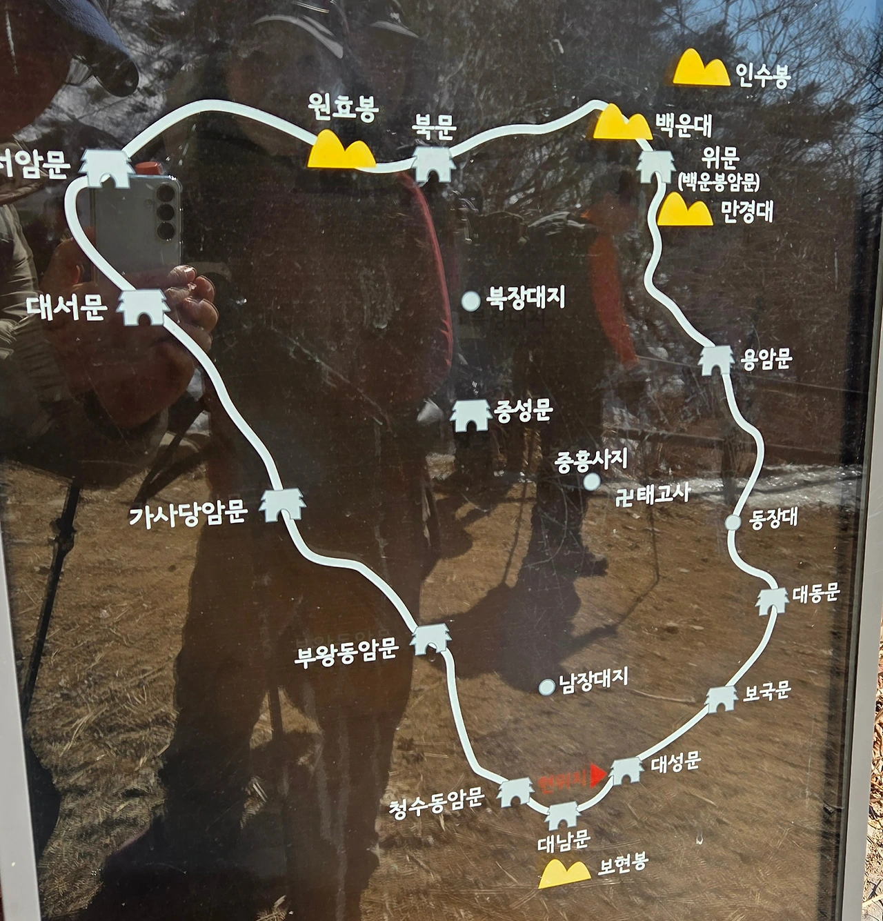 보국문에 도착한 후 H가 갑자기 성곽길이 아닌 우회를 하자고 한다. 대성문에서 보국문까지 내려서는 길이 힘들었다고 한다. 하지만, 알바다. 우회를 하는 길을 잘못 들어서서 너무 내려갔다. 대동문에서 북한산성 탐방지원센터로 하산하는 갈림길까지 내려간 후 대동문으로 다시 올라갔다. 500m를 올랐다. 편한 길을 간다고 갔는데 잘못된 길이었다. 살면서 그러한 유혹에 넘어가지 않는 사람이 드물다고 할 것이다. 정도를 걸어야 한다고 본다.
