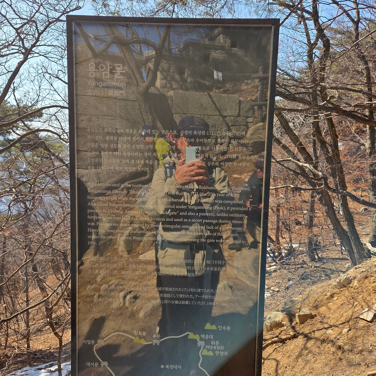 노적봉을 지나 백운대를 바라보니 여전히 사람들이 많다. 그곳은 오늘 목표가 아니다. 백운봉암문인 위문에 도착하여 주변을 돌아보고 바로 돌아선다. 올라오는 사람들에게 물어보니 눈이 하나도 없다고 한다. 아이젠을 벗어보라고 내려간다. 그만큼 양지바른 곳은 눈이 다 녹았다고 보면 될 것이다. 다음 주면 이제는 봄철 등산의 어려움이 있는 진흙탕이 서서히 나타날 것이다.