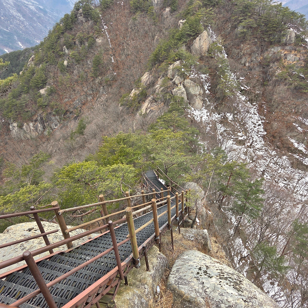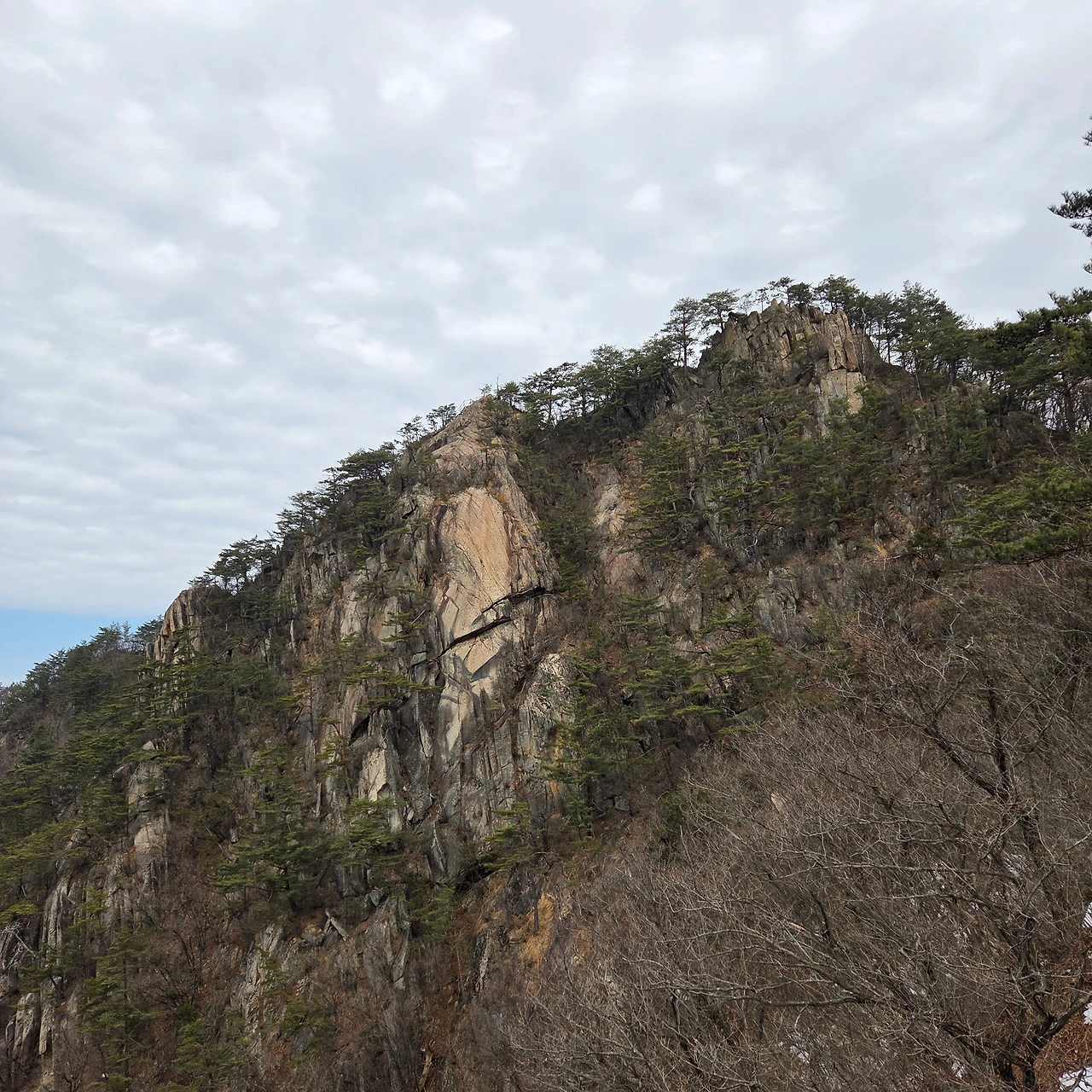 올라올 때는 잔설이 그렇게 무섭지 않았지만, 내려갈 때는 무섭다. 올라오는 사람들에게 길을 먼저 양보하고 천천히 하산을 한다. 삼거리에 이르기까지 조심조심 지나간다. 삼거리에 도착하여 내려간다. 삼거리를 조금 지나 신선봉과 형봉을 따라 담아본다. 형봉에는 상선암의 그 모습을 그대로 볼 수 있다. 주상절리도 있다. 그리고 채운봉을 오르면서 뒤를 돌아보고 그리고 내려가면서 검봉을 쳐다본다. 올라온 능선을 본다. 암릉은 그곳을 지날 때는 모른다. 그 암릉을 돌아볼 때 그 모습이 경이롭다. 채운봉을 내려서고 검봉을 오른다. 그러면 내려온 길을 쳐다본다. 계룡산을 자연성능에서 관음봉을 오를 때 그 모습을 다시 보는 것 같다.
