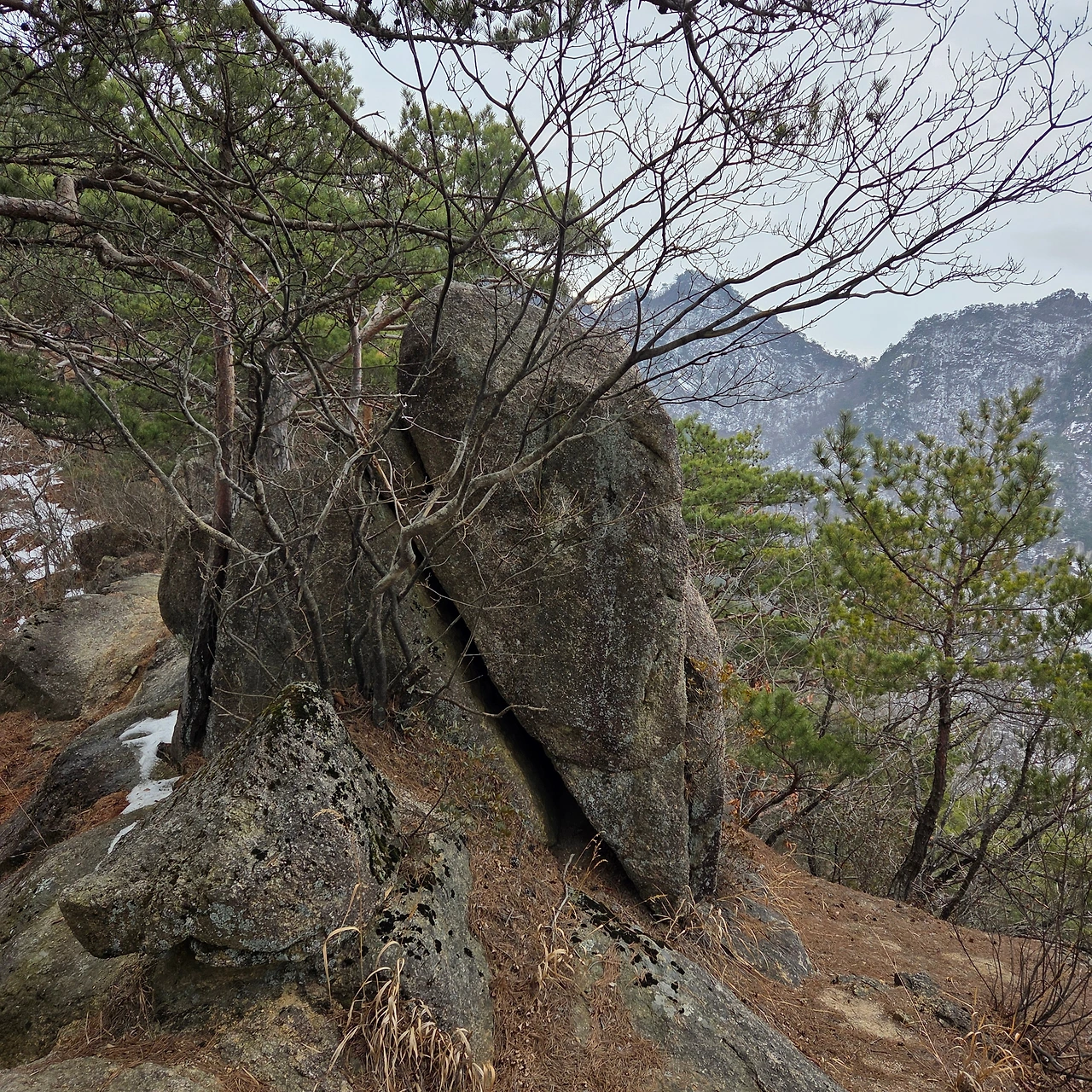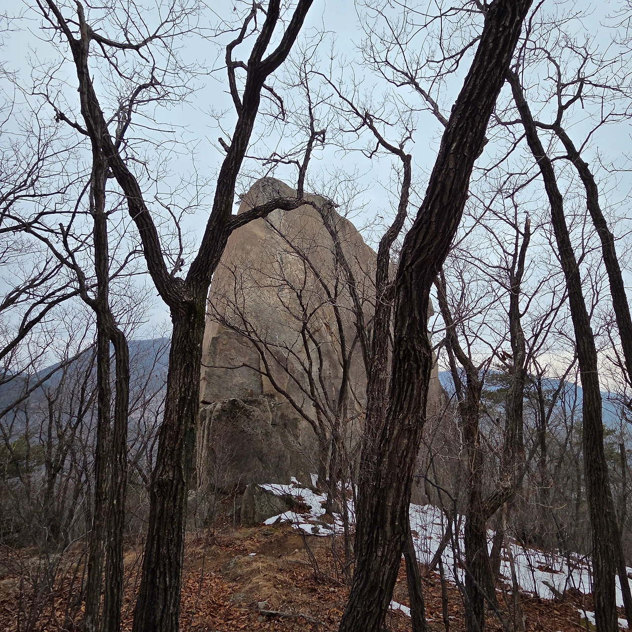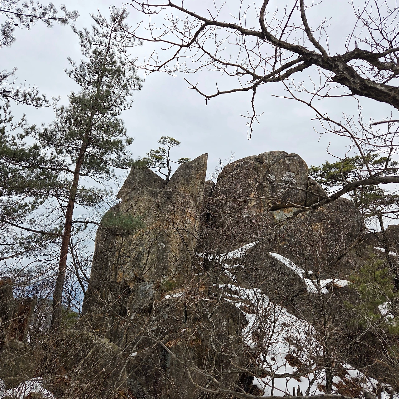 삼거리를 지나면서 H가 돌아본다. 나를 알아보고 걸음을 멈추고 있다. 그리고 천천히 같이 신성봉을 지나면서 무용담을 늘어놓고 있다. 신선봉에는 여름날에는 사람들이 가득하였지만, 찬바람이 부는 늦겨울, 초봄에는 사람들이 없다. 그냥 지나가면서 그 암릉을 배경으로 사진을 담는다. 그리고 도락산 정상으로 간다. 오르면서 살짝 고민을 한다. 해발 900m가 넘어서고 있고 잔설이 있다. 아이젠을 하여야 할지 고민을 하지만, 햇빛이 있는 곳에 눈이 없고 음지에 살짝 눈이 있어 조심스럽게 지난다.