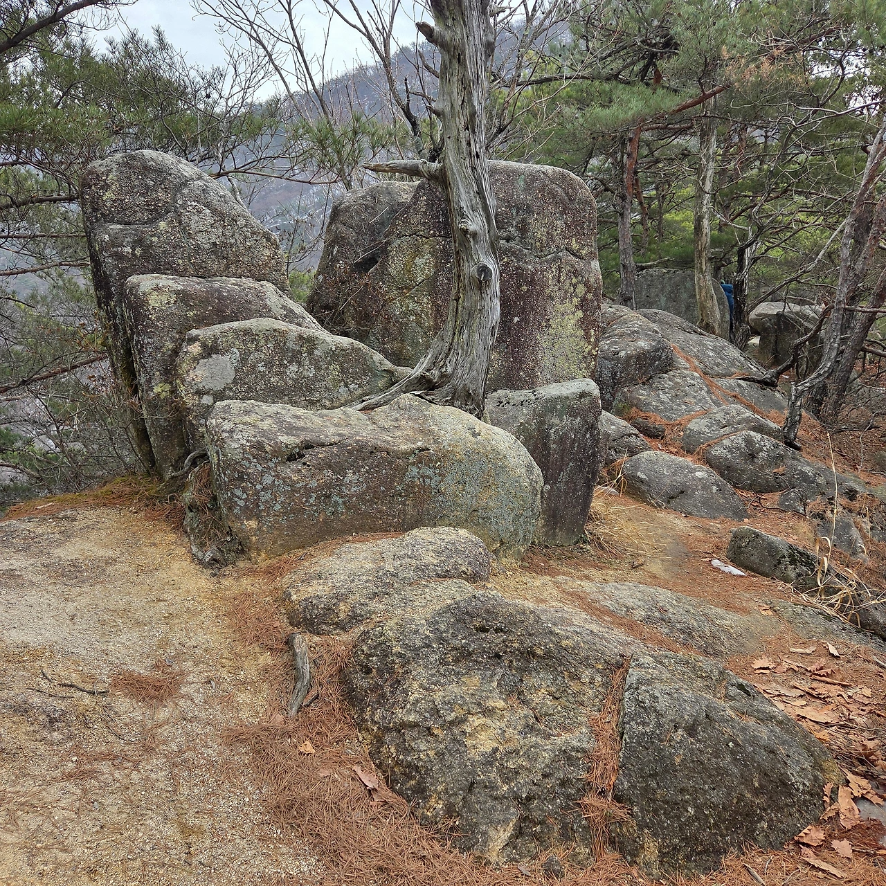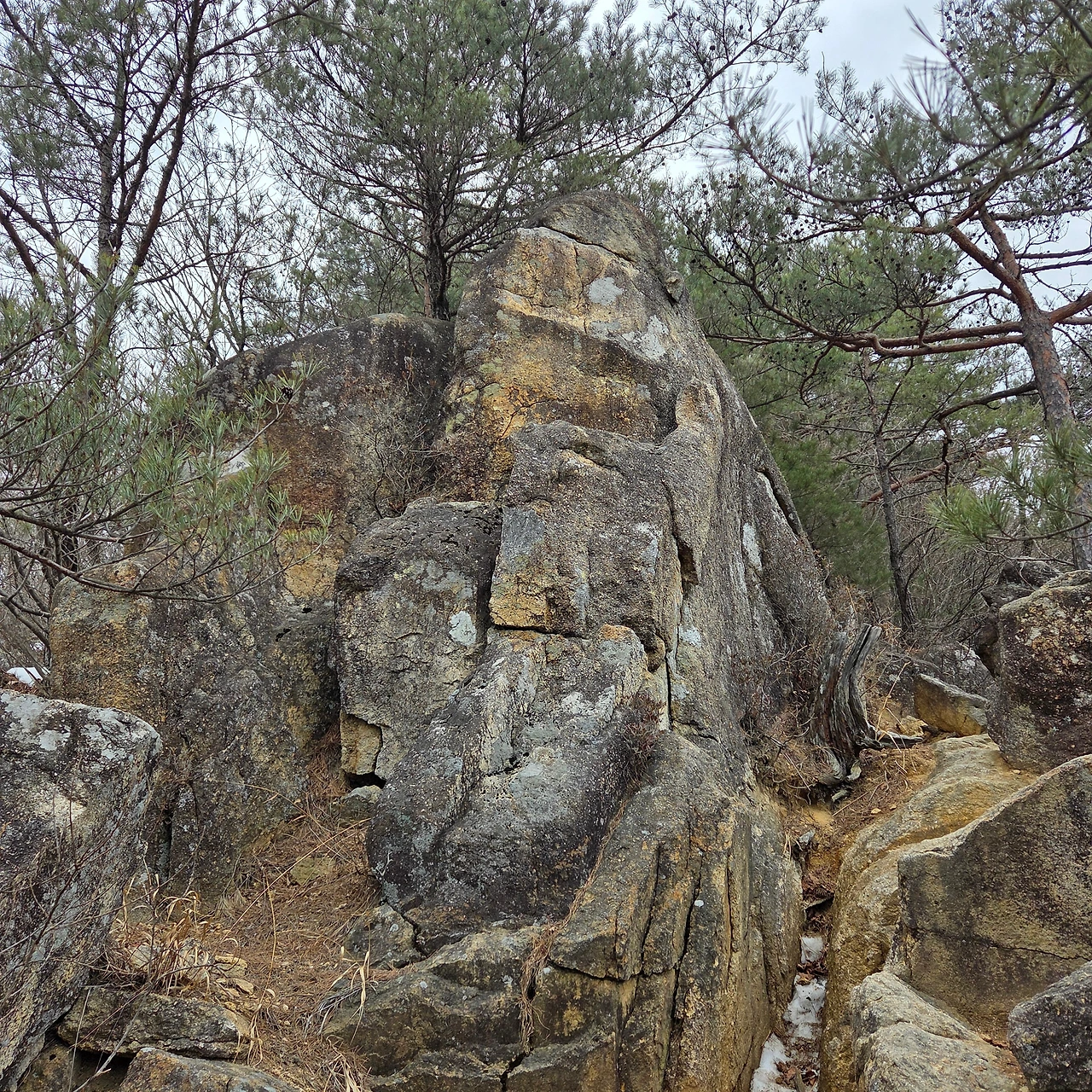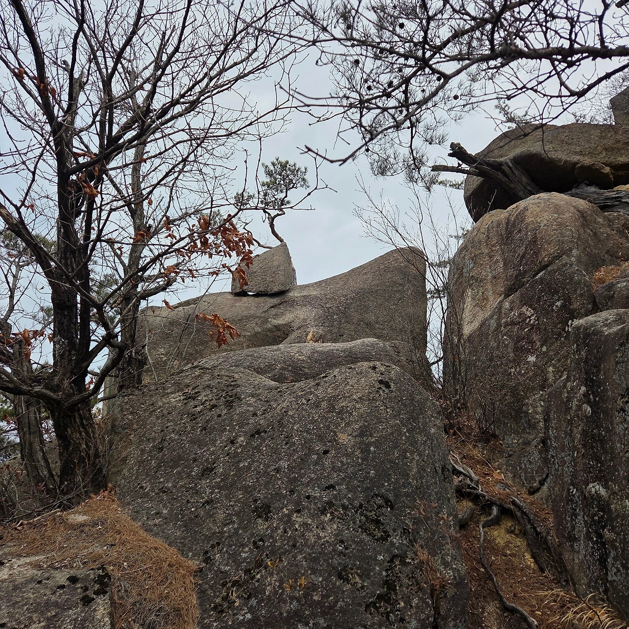 삼거리를 지나면서 H가 돌아본다. 나를 알아보고 걸음을 멈추고 있다. 그리고 천천히 같이 신성봉을 지나면서 무용담을 늘어놓고 있다. 신선봉에는 여름날에는 사람들이 가득하였지만, 찬바람이 부는 늦겨울, 초봄에는 사람들이 없다. 그냥 지나가면서 그 암릉을 배경으로 사진을 담는다. 그리고 도락산 정상으로 간다. 오르면서 살짝 고민을 한다. 해발 900m가 넘어서고 있고 잔설이 있다. 아이젠을 하여야 할지 고민을 하지만, 햇빛이 있는 곳에 눈이 없고 음지에 살짝 눈이 있어 조심스럽게 지난다.