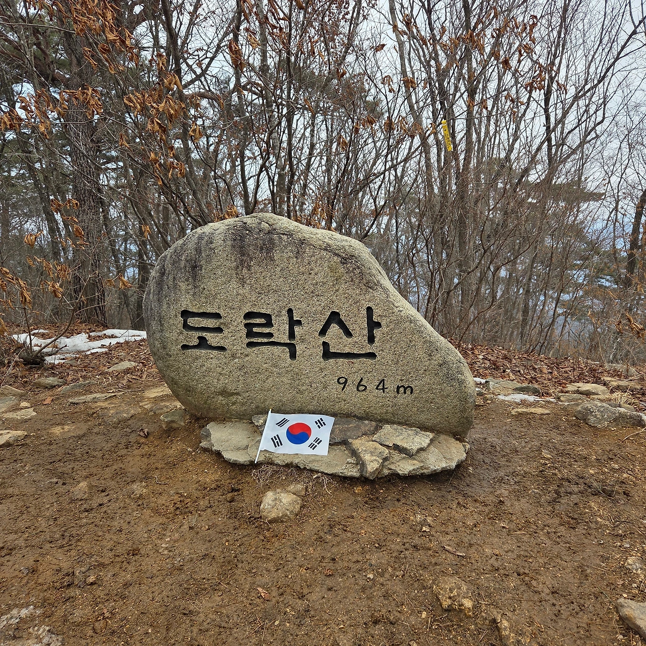 도락산 정상에 한 무리의 젊은이들이 자리 잡고 있다. 오늘이 3.1절이라고 손에 태극기를 들고 있다. 그리고 도락산정상석에서 태극기를 들고 만세를 부르면서 인증을 하고 있다. 우리도 그것에 동참하여 태극기를 빌려서 인증을 하였다. 그리고 그 태극기 중 하나를 정상석에 놓고 정상을 인증을 하였다. 많은 사람드링 정상에 머무를 수 없어 서둘러 하산을 한다.