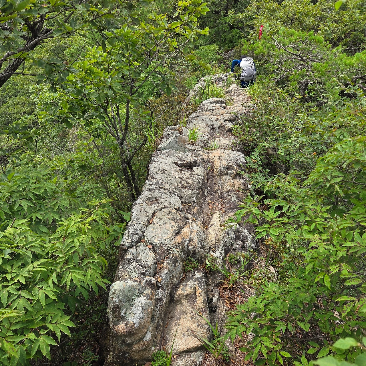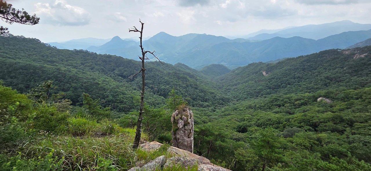 벌재까지 이어지는 등산로는 그렇게 뷰는 없다고 보아야 할 것이다. 간간이 나타나는 암릉지대에서 멀리 문경 쪽의 산과 단양 쪽의 산을 바라다본다. 백두대간을 따라서 경상북도와 충청북도의 도 경계가 만들어진 것이 아니고 하천을 경계로 하여 도 경계가 이루어져 이곳은 경상북도다. 그래도 이곳에서 단양과 문경의 산을 동시에 바라다본다.