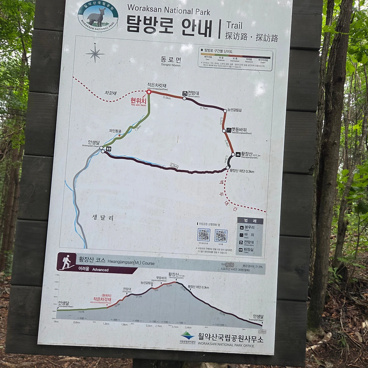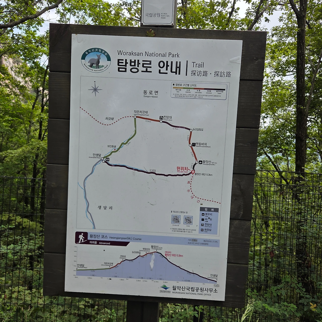 여름 산행에서 땀과의 전쟁을 최소화하기 위하여 이른 시간에 시작하여야 한다. 그 이른 시간을 위하여 서울에서 목적지까지 휴식 없이 달렸다. 오늘의 산행은 One-way다. 그러기 위하여서는 자동차를 두 곳에 둔다. 벌재에 먼저 자동차를 두고 출발지로 이동을 한다. H가 미리 와서 대기하고 있다가 자동차에 탑승하고 황장산공영주차장으로 이동하였다. 자동차는 해발 625m 벌재에서 급하게 내려가서 해발 400에 위치하고 있는 황장산 공영주차장에 도착하였다.