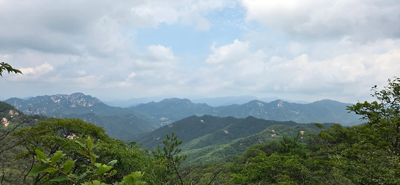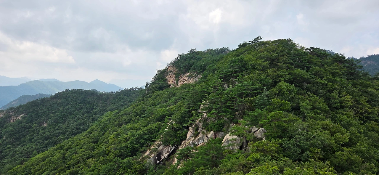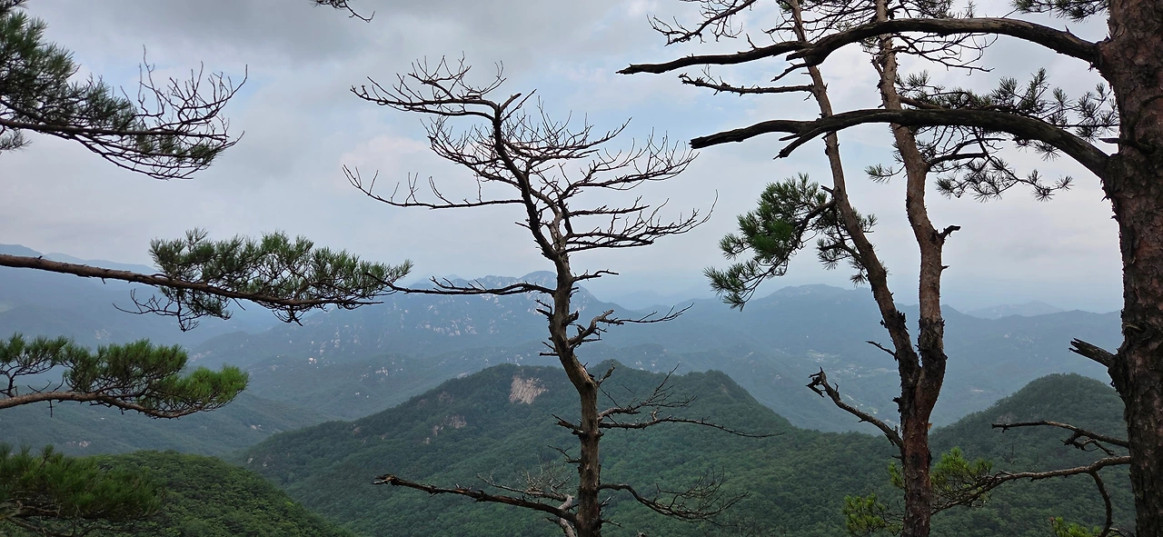 이동을 하면서 알바를 조금 하였다. 그 알바를 한 것은 이정표가 없기 때문이다. 하지만, 그곳에는 야생동물을 관찰하기 위한 카메라가 설치되어 있었다. 그곳에서 길을 잘 살펴야 하였는데 그것을 잘못한 우리의 잘못이었다. 그래도 길을 찾아서 걸어서 작은 차갓재에 도착하였다. 이제 황장산을 오르는 것이다. 황장산까지 거리가 얼마 되지 않지만 전망대에서 0.7km만 어렵다고 하였다. 현재 위치가 해발이 무려 700m가 넘으니 해발 1,077m인 정상까지는 쉽게 오를 것이라는 생각을 가졌다. 황장산을 오르면서 그렇게 전망은 없다고 할 수 있지만, 전망대에서 이곳저곳을 둘러보고 가파르게 된 길을 700m를 열심히 올랐다. 그리고 정상이라고 생각한 부분은 정상능선에 도착한 것이다. 그 능선에서 이제 올라온 길을 바라보고 멀리 산을 둘러본다.