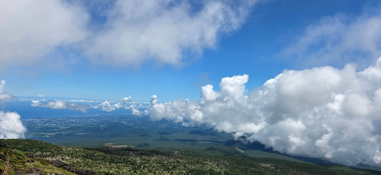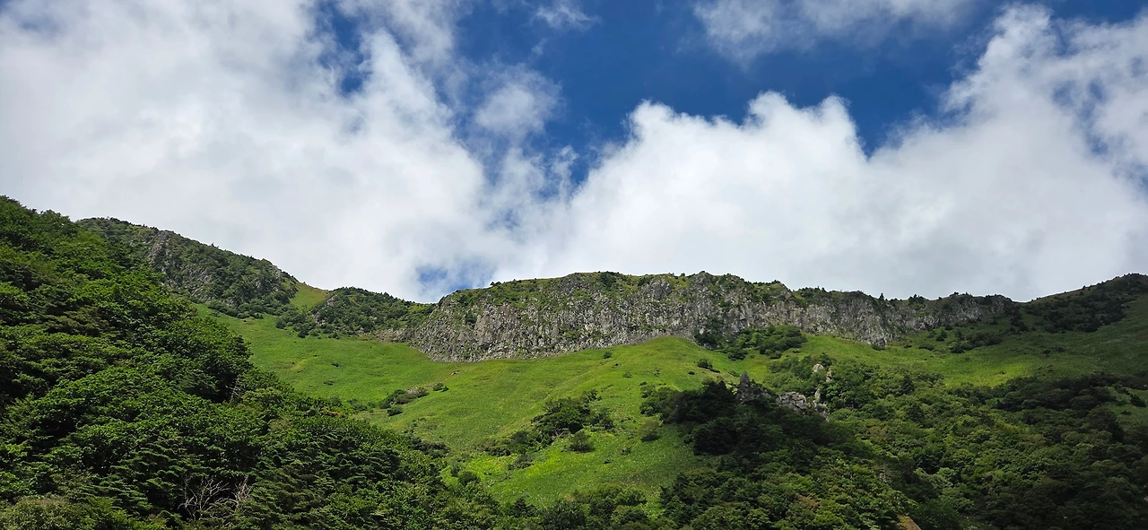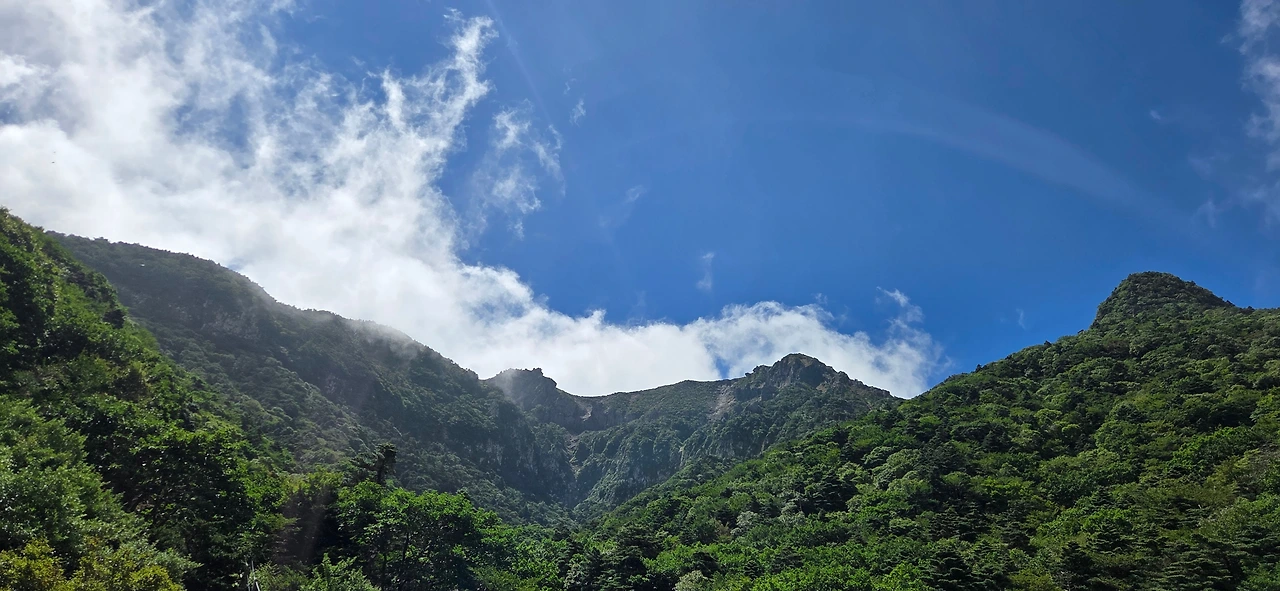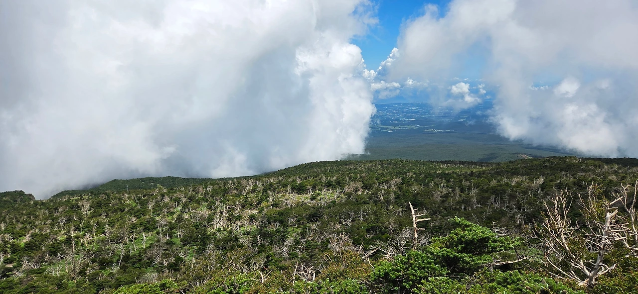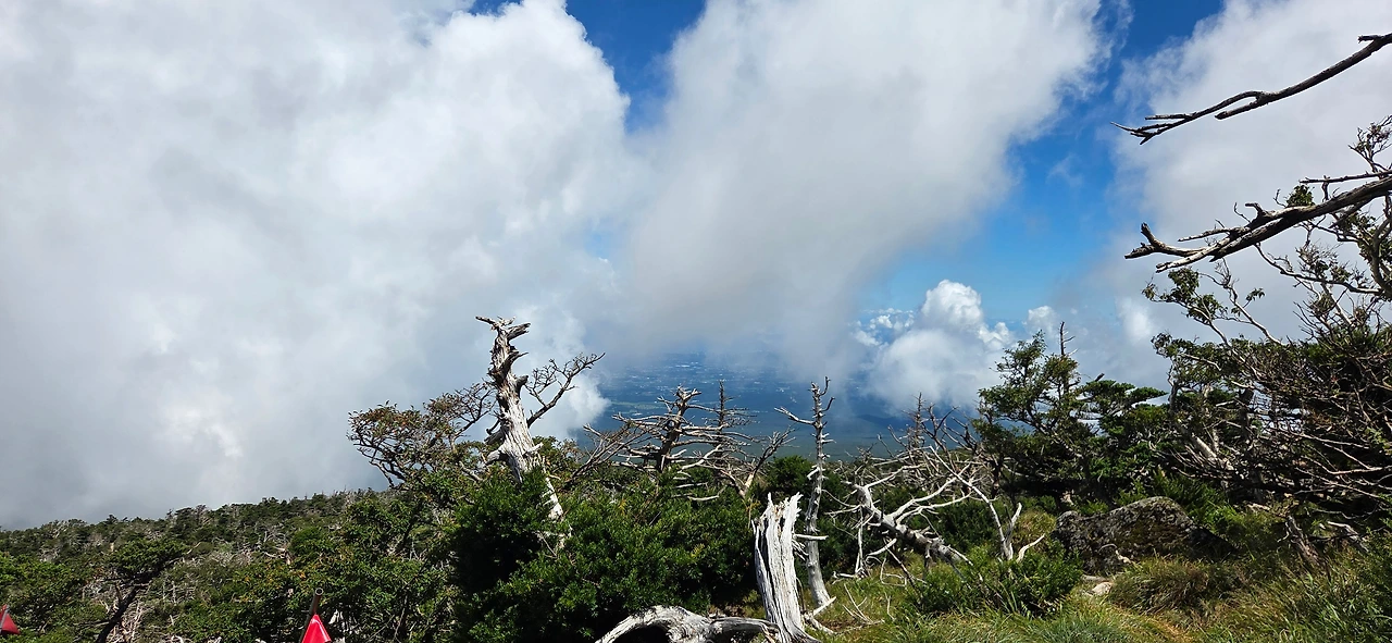 잠시 풍경을 즐긴 뒤 성판악으로 하산을 시작하는데, 갑자기 동쪽 능선 위로 구름이 걷히며 맑은 하늘과 푸른 숲, 그리고 저 멀리 바다가 어우러진 최고의 풍경을 선물했다.