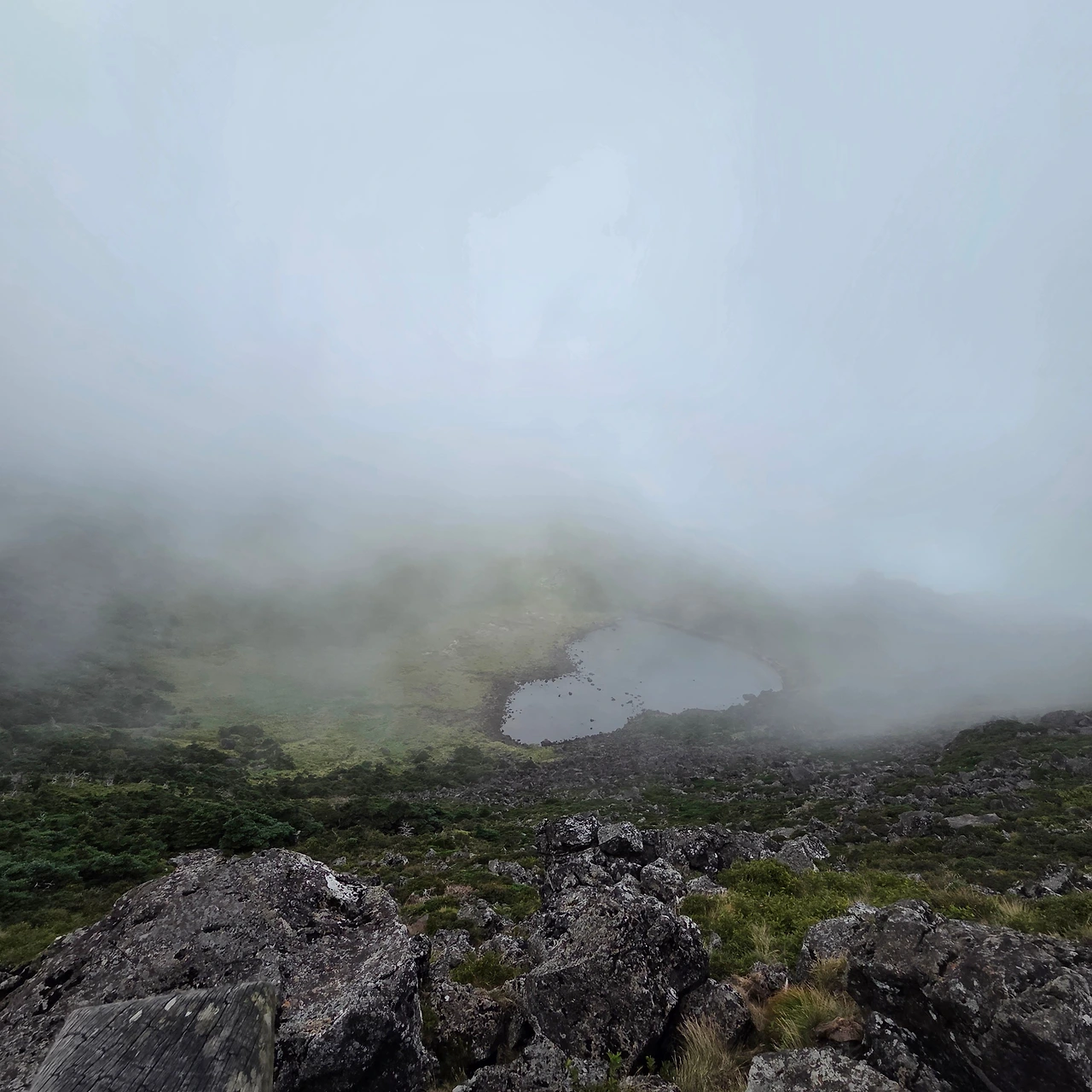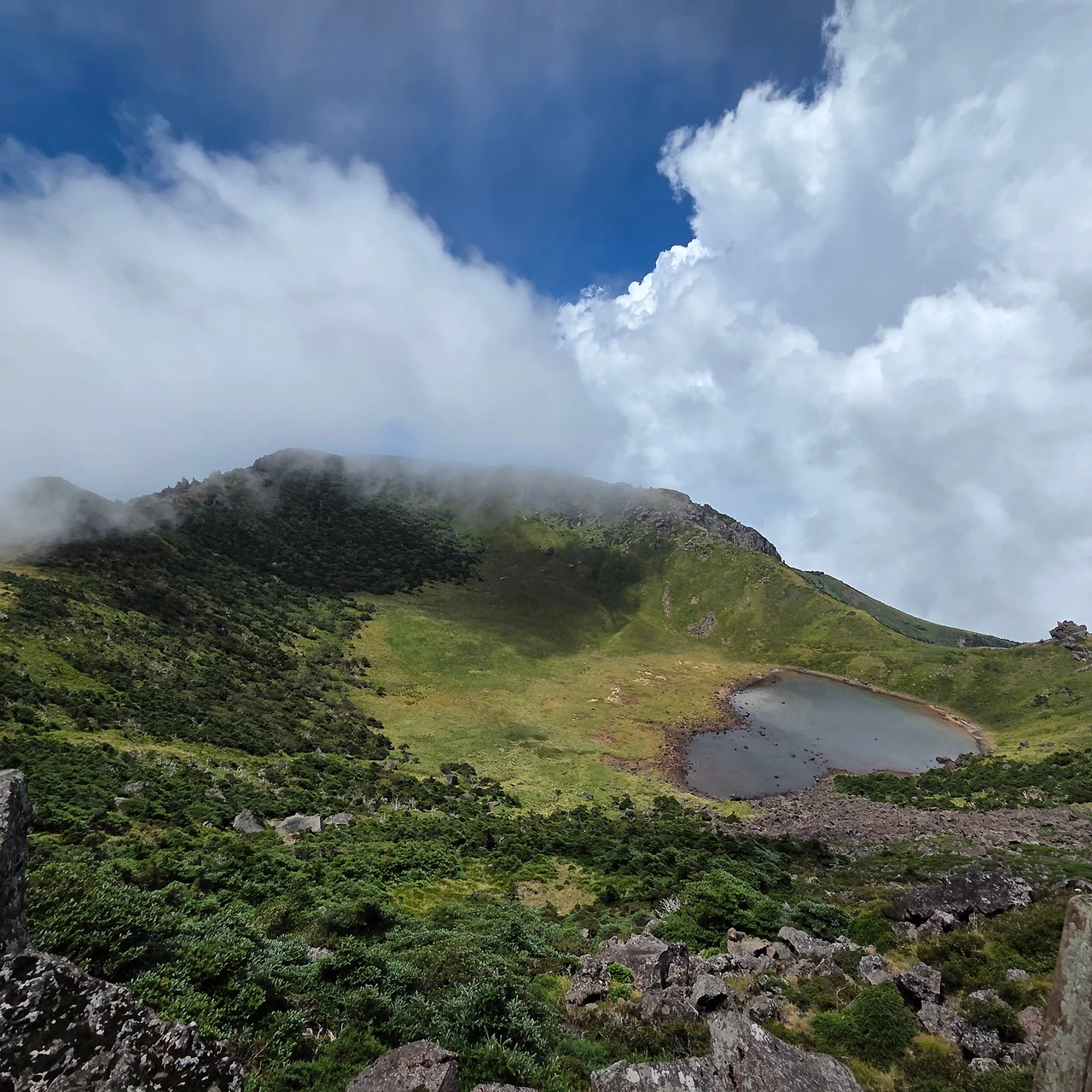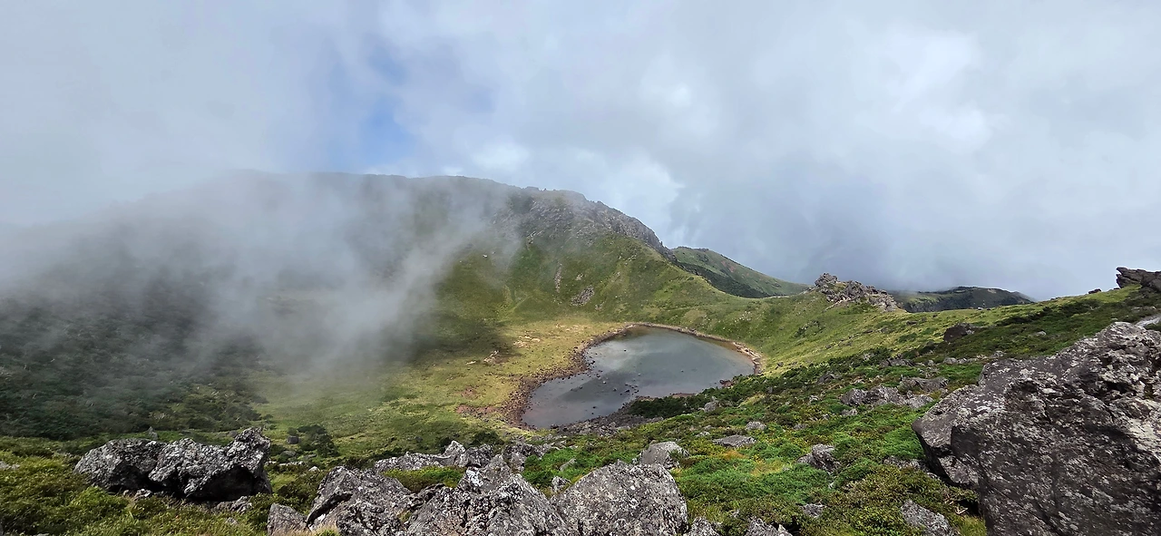 드디어 정상에 도착했다. 처음에는 구름 한 점 없던 백록담에 어느 순간 구름이 '출입금지' 규정을 어기고 내려와 앉았다. 아쉬운 마음으로 휴식을 취하는데, 마치 단속반이라도 뜬 것처럼 구름이 슥 걷혔다. 정상에는 가족, 외국인, 젊은 친구들까지 다양한 사람들이 있었다. 아마 평일 이 시간에 산을 오를 여유가 있는 사람들이었을 것이다.