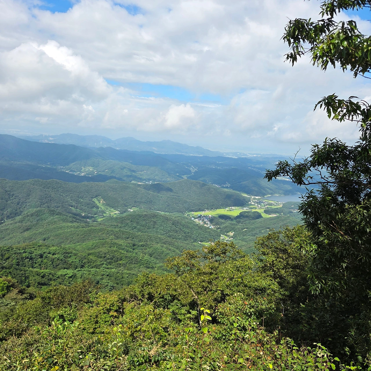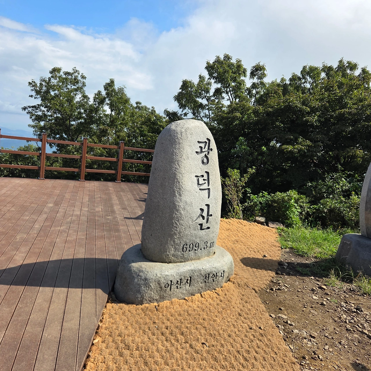 능선에 도착하였다. 정자가 있고 바람이 불고 있다. 이렇게 시원한 바람이 불고 있으나 산을 오르는 사람들이 그저 즐거울 뿐이다. 광덕산은 가파르게 오른다. 하지만, 시원한 바람이 분다. 광덕산을 바로 앞에 두고 한차례 숨을 고르고 오른다. 가족이 오르면서 가족을 걱정하는 것을 보았다. 광덕산 정상석은 3년 전에도 느꼈지만 아산과 천안이 따로 만들지 않고 같이 올렸다는 것이 인상이 깊다. 이곳은 기지국이 바로 옆에 있는데도 이곳은 휴대폰이 잘 안 터지는 것이 예전이나 같다. 왜 그런 것인지 잘 모르겠다. 동서남북을 보고 이제 장군바위로 방향을 잡았다.