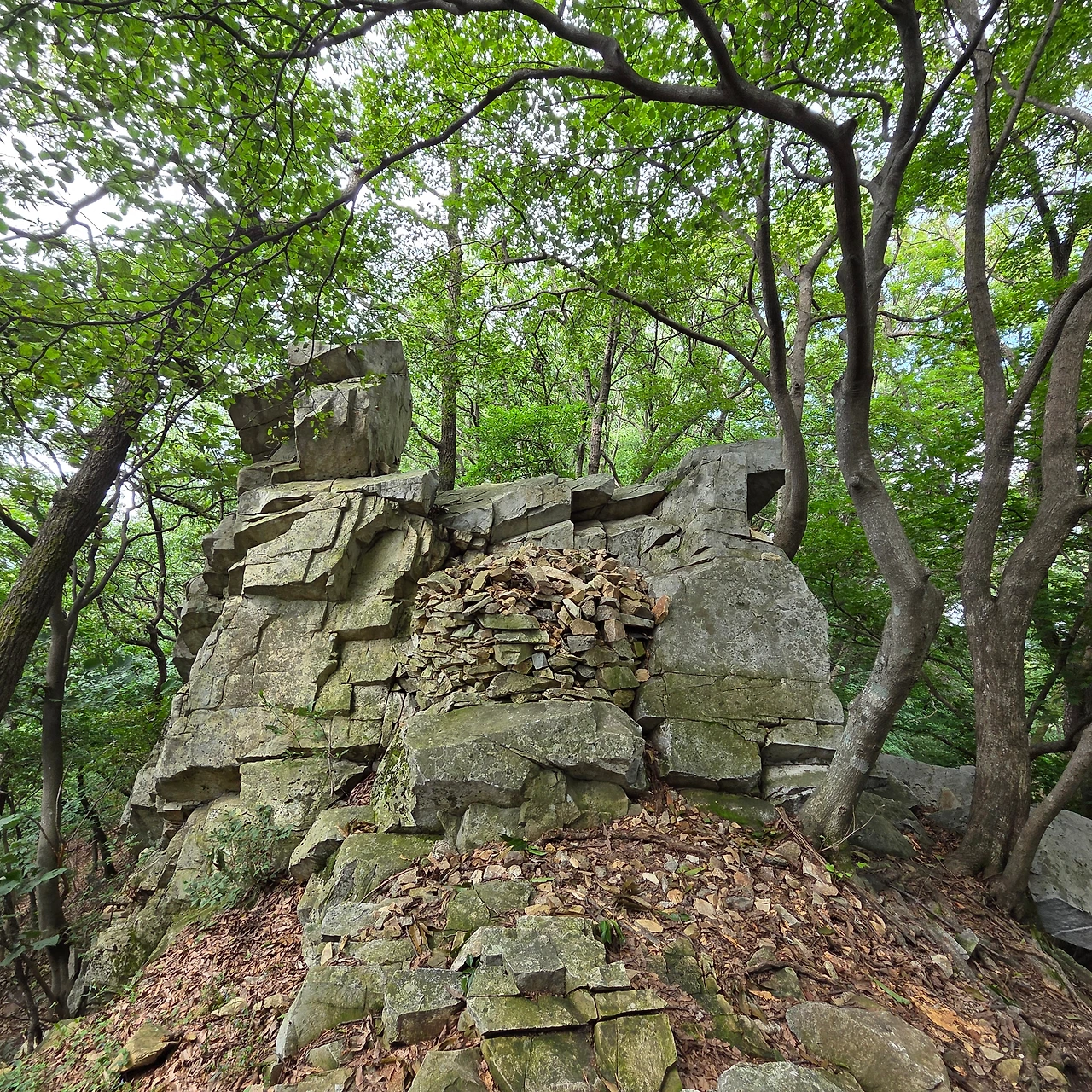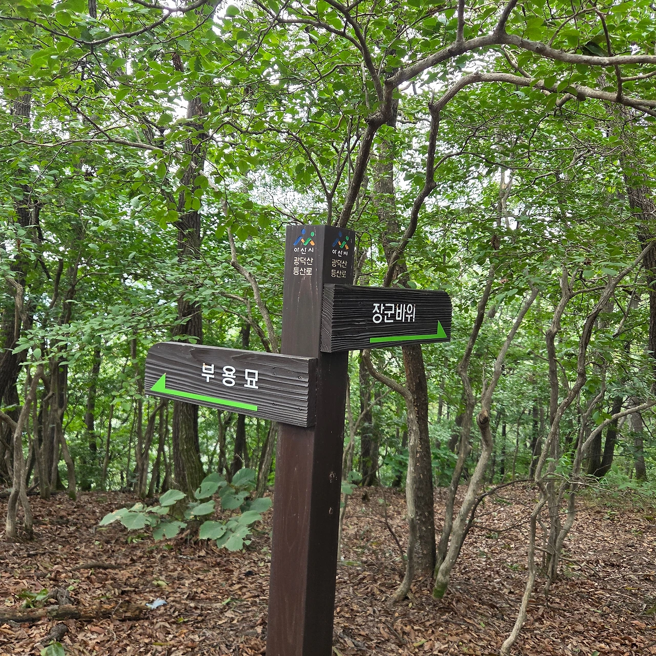 정상의 능선을 따라 천천히 걸으면 되는 것이다. 장군바위까지 가는 그 길은 너무나 편안하고 좋다. 3-40분을 걸으면 장군바위다. 장군바위를 앞에서 보면 그렇지만 뒤에서 보면 레고로 만든 장난감 강아지 같다. 3년 전 이곳에서 망경산까지 왕복을 하였지만 오늘을 혼자 산행을 하는 것이 아니고 일행이 있기에 많은 산행보다 친목을 다진다. 그리고 이제는 하산이다. 하산하는 길에 안내되어 이정표는 부용묘이다.