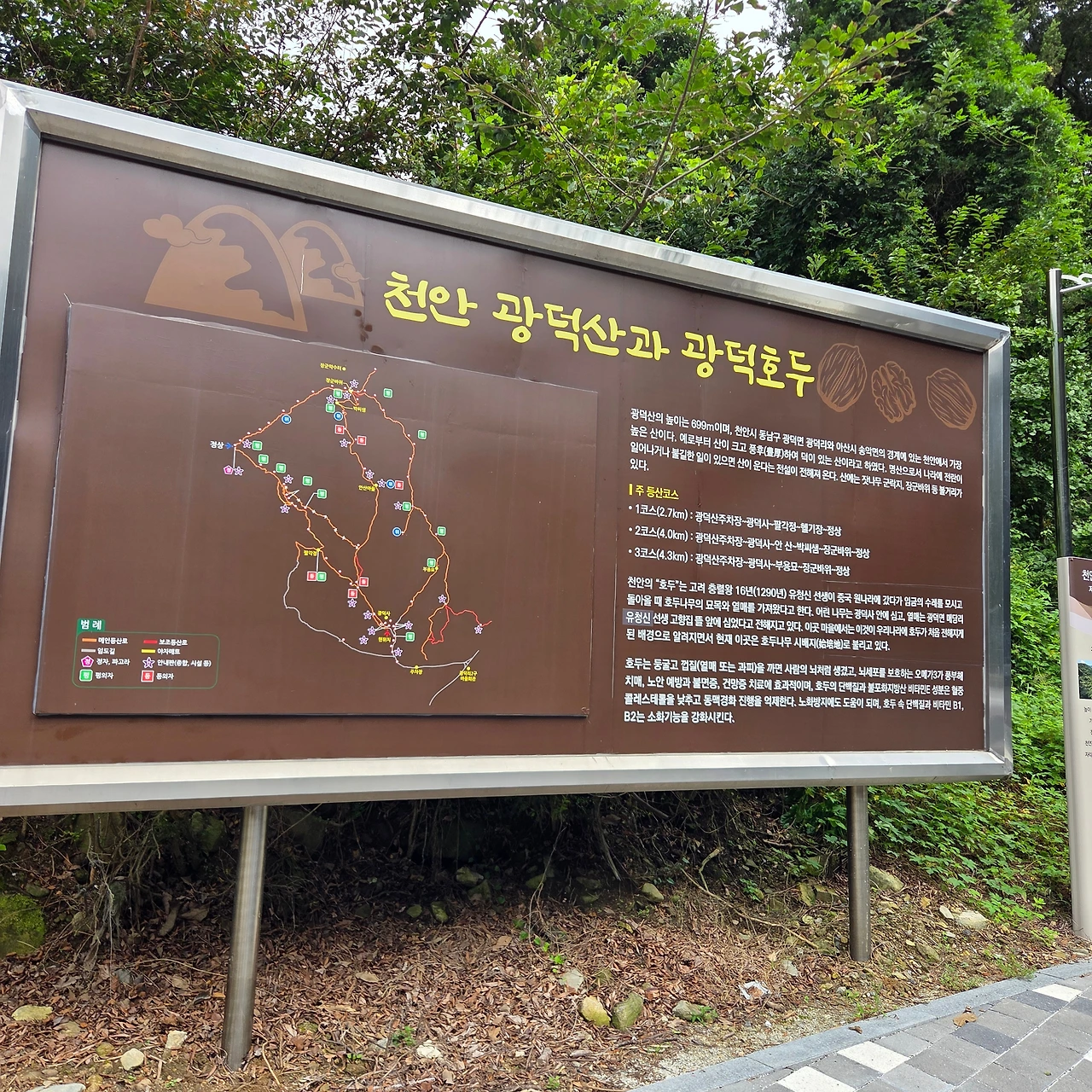 자동차를 주차시키고 이동을 한다. 산행은 광덕산을 오르는 1코스로 오르고 3코스로 하산을 하는 것으로 방향을 잡았다. 우리가 넉넉하게 시간을 잡았다. 4시간이면 충분한 거리의 산행이다. 일기예보상 약한 비가 온다는 예보가 있지만, 하늘은 비가 온다는 징후는 없다. 그래도 오후에는 더 많은 비가 온다는 예보가 있어 오전에 산행을 끝내기로 하였다. 결론적으로 말하면 오후가 아닌 밤에 큰 비가 충청도와 전북지역에 내려 피해를 주었다.