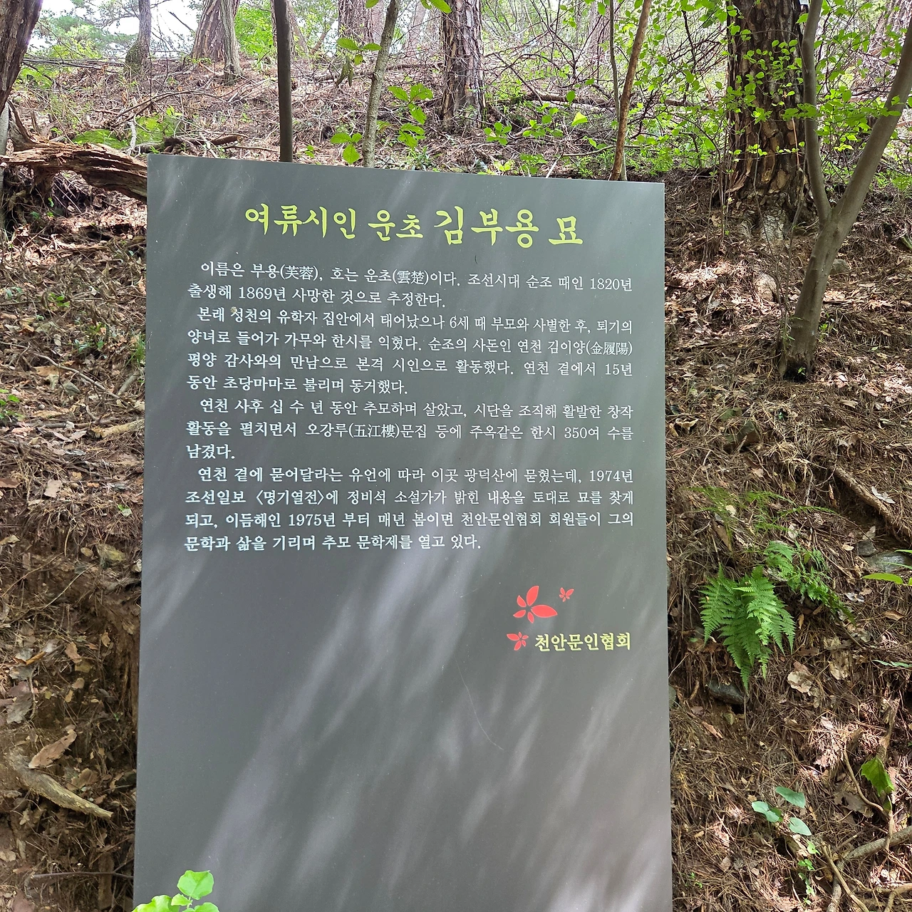 부용묘는 조선시대의 이름난 여류시인의 묘라는 것이다. 그 묘를 지나고 하산할 것이다. 천안시 문인협회는 이 부용묘의 주인공을 기리기 위하여 다양한 활동을 하고 있는 것 같다. 3년 전에 왔을 때 보다 정리가 되었고 관련된 기념물이 추가되었다고 보아야 할 것이다.