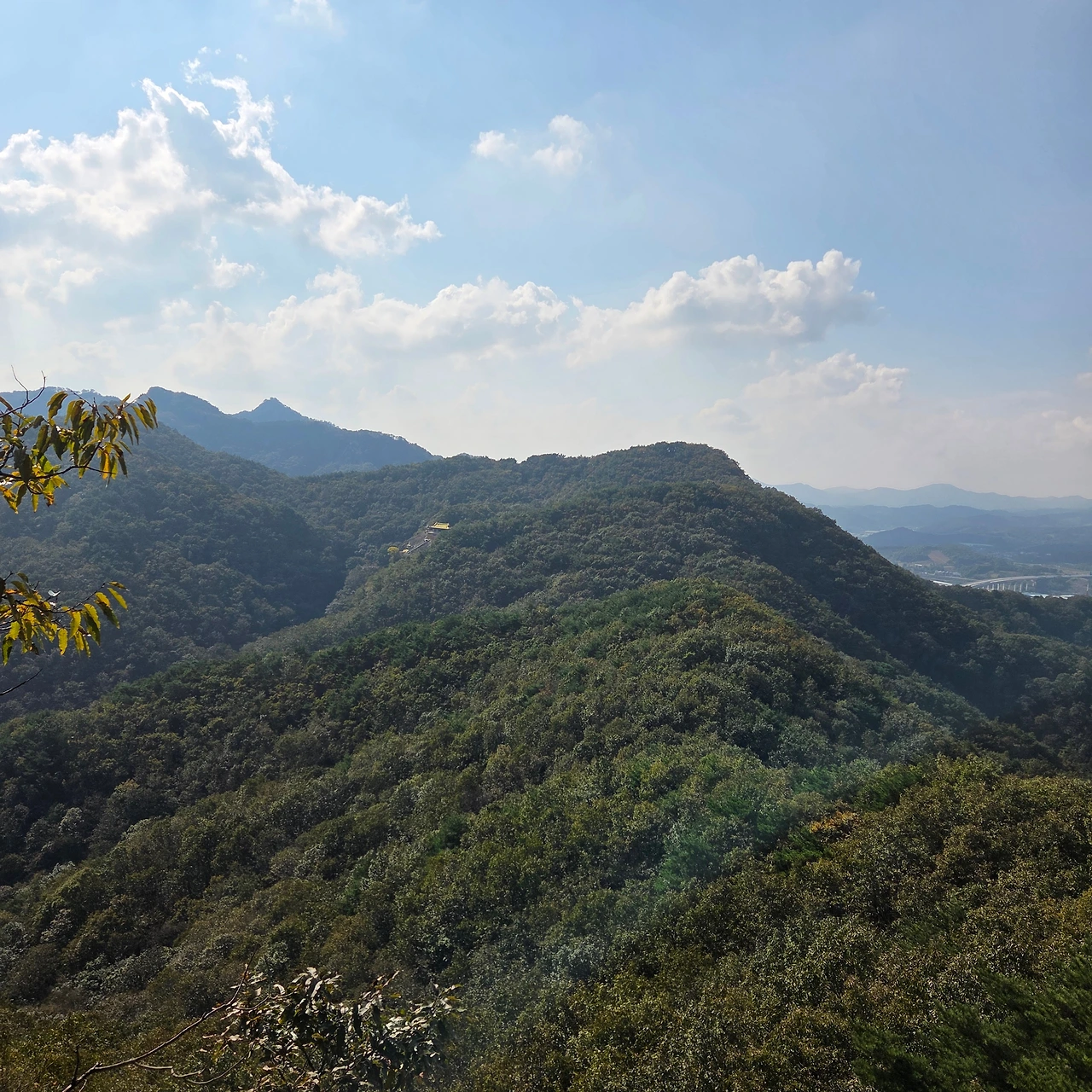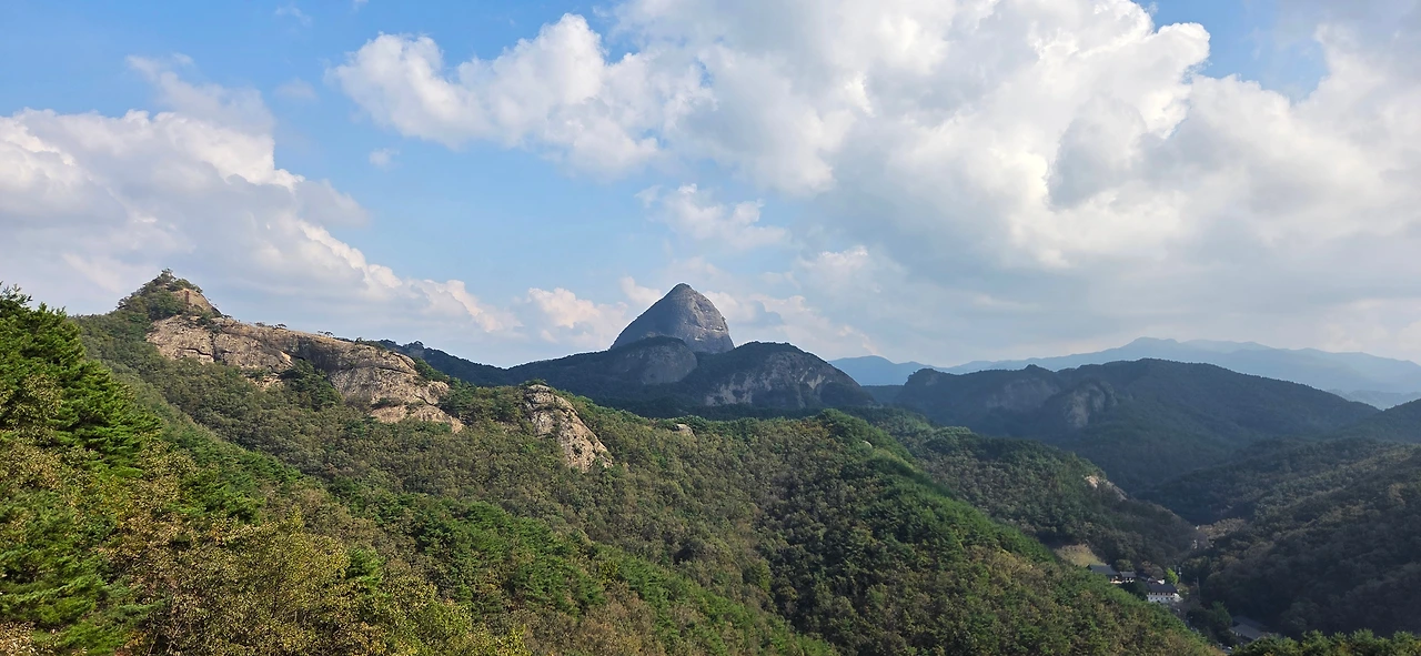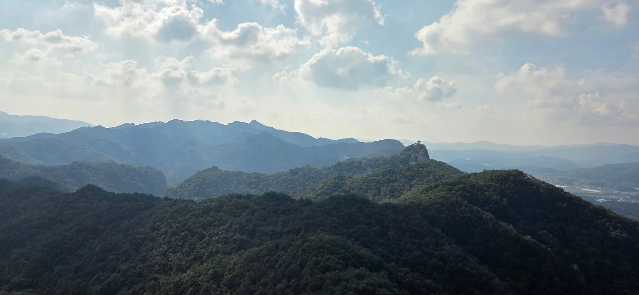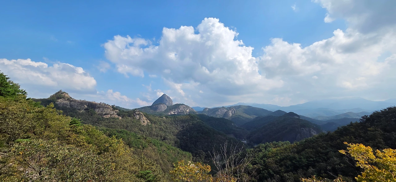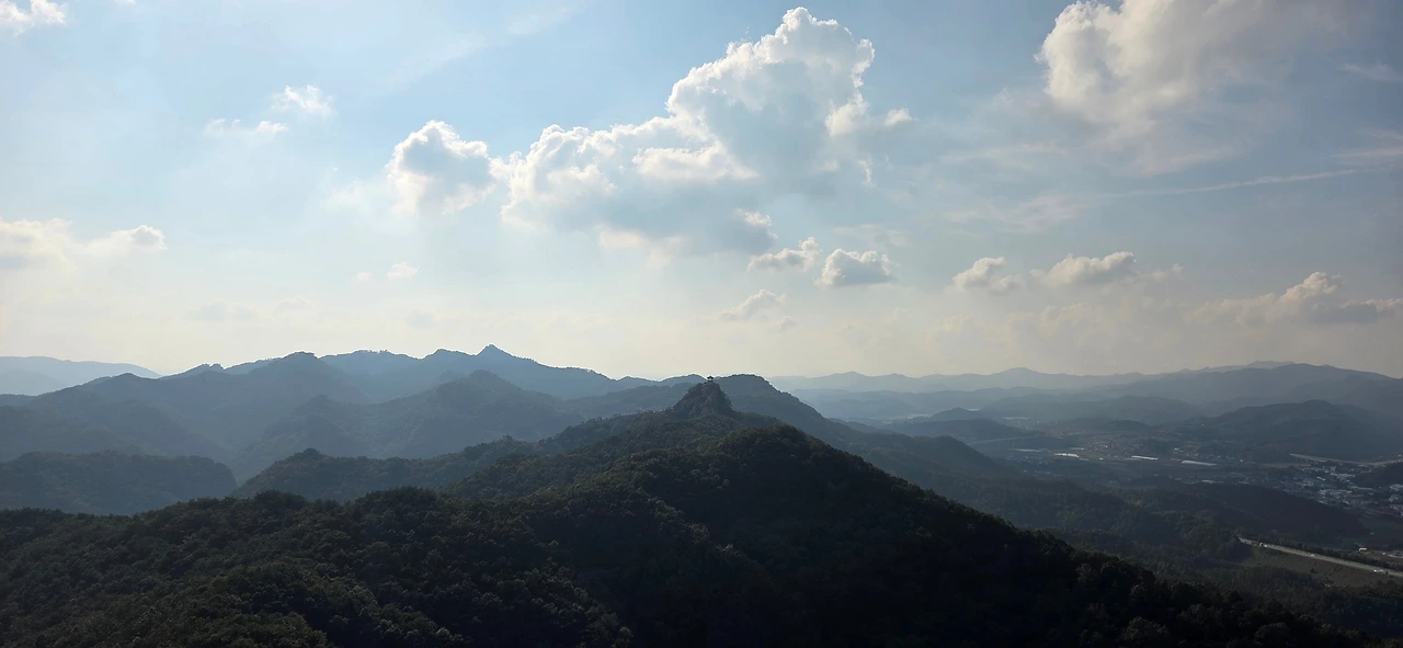 비룡대에서 멋진 경치를 다시 보고 성황당이 있던 삼거리로 방향을 잡았다. 안부에 도착하고 성황당을 향하여 올라가는데 앞서가는 사람들이 힘들어한다. 함미산성에서부터 온 사람들이 성황당을 거쳐 봉두봉을 오르는 것을 힘들다고 느끼는 것 같았다. 우리는 성황당에 올라서서 성황당이 있던 흔적도 보지 않고 봉두봉 반대 방향으로 방향을 잡고 올라섰다. 삿갓봉입니다. 이곳의 풍경은 새롭다. 그리고, 한 시간도 안 되어 북부주차장에 도착하여 자동차를 회수하고 다시 서울로 이동했다.